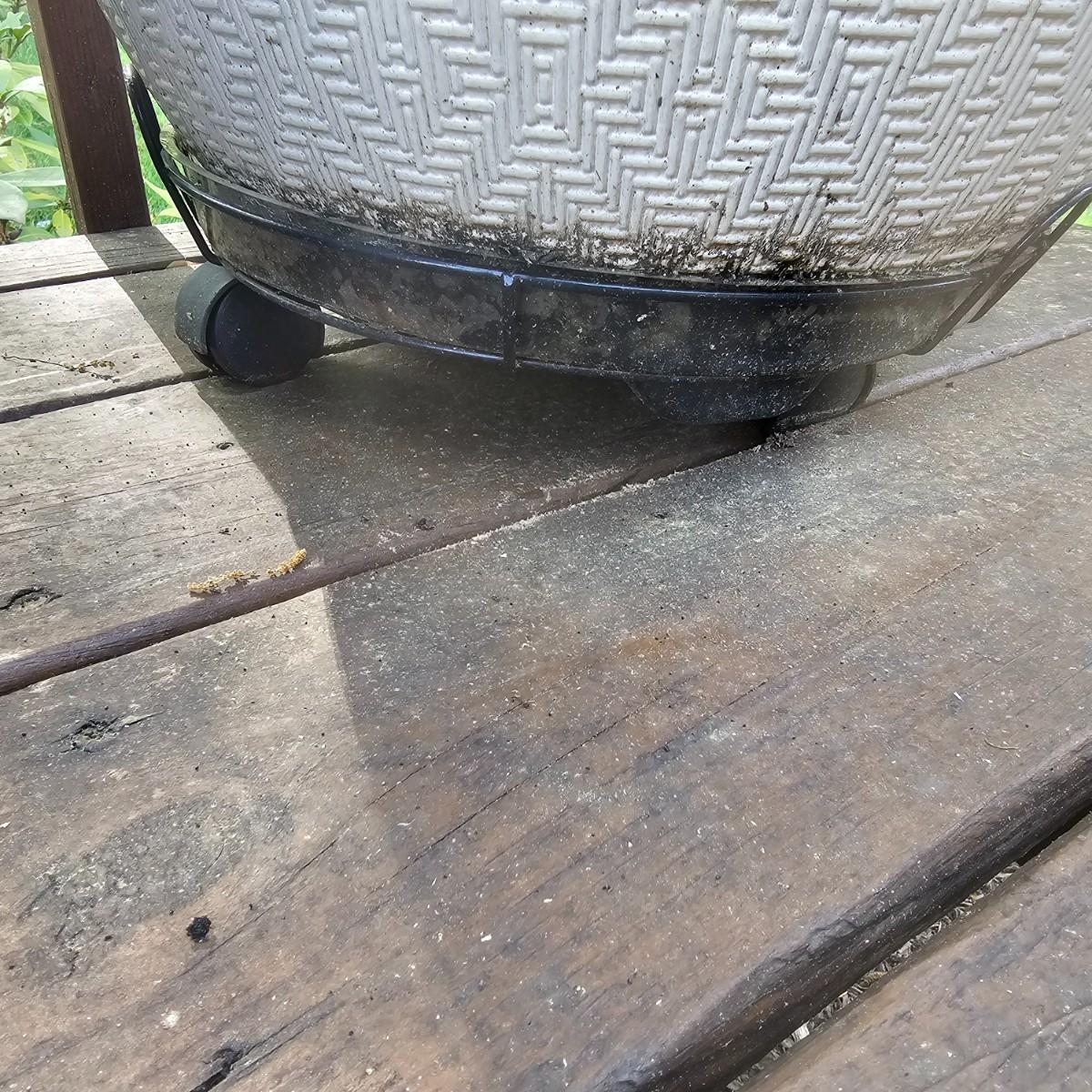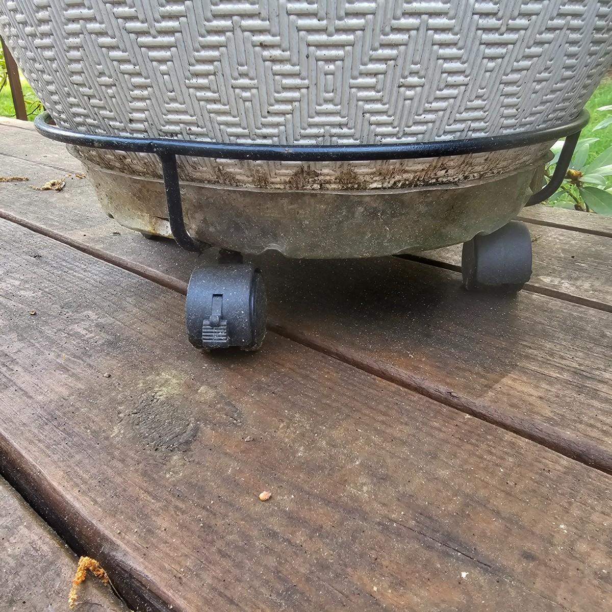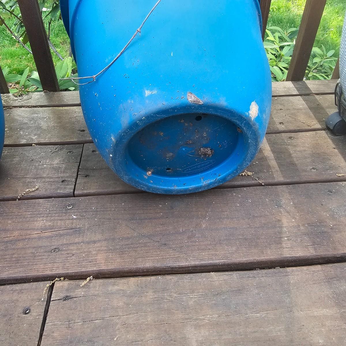 Two white and two blue large plastic pots for outdoor decor. White pots have diamond design on sides, are on roller bases and measure 17.5"D x 14"H. Blue pots are 15"D x 13.5"H. Some dirt and discoloration on all. Includes planted items and trellises. See photos for details. Local pickup only.