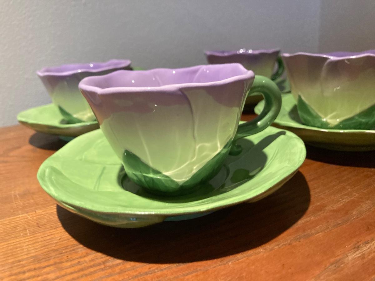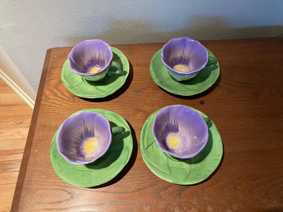 Four Flower teacups and saucers purple hand painted Russ Bernie UK & co inc dishwasher and microwave safe