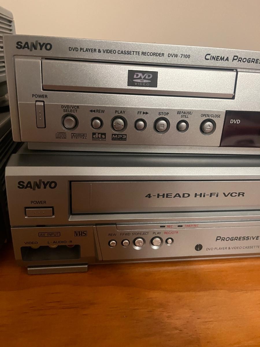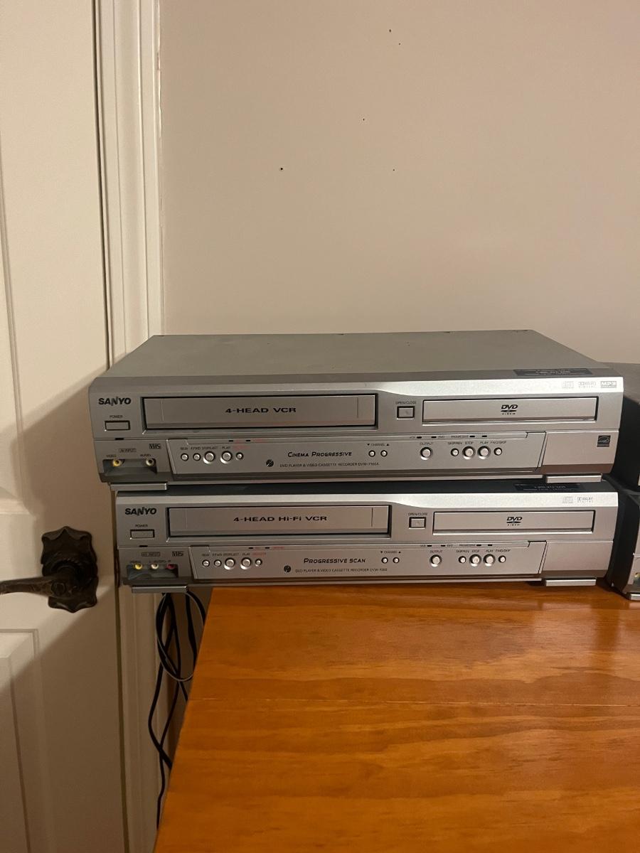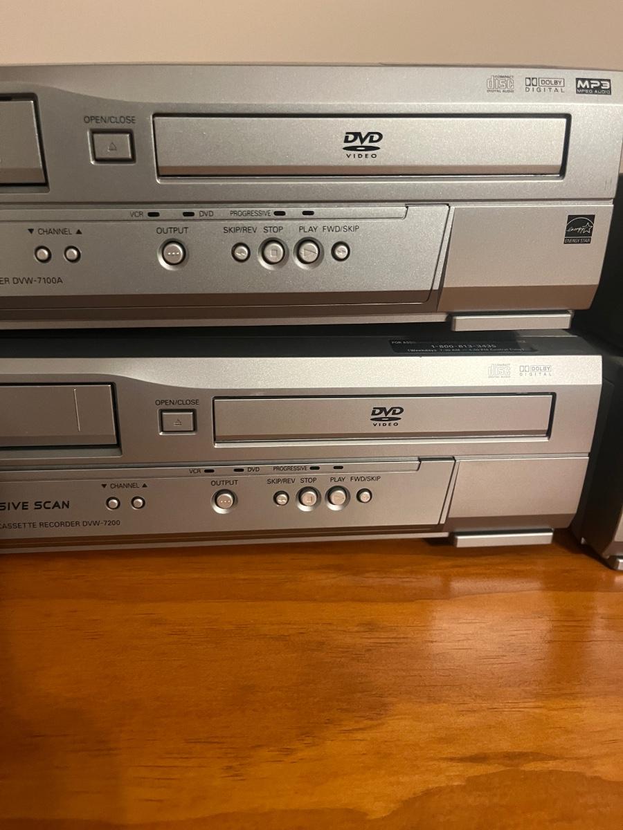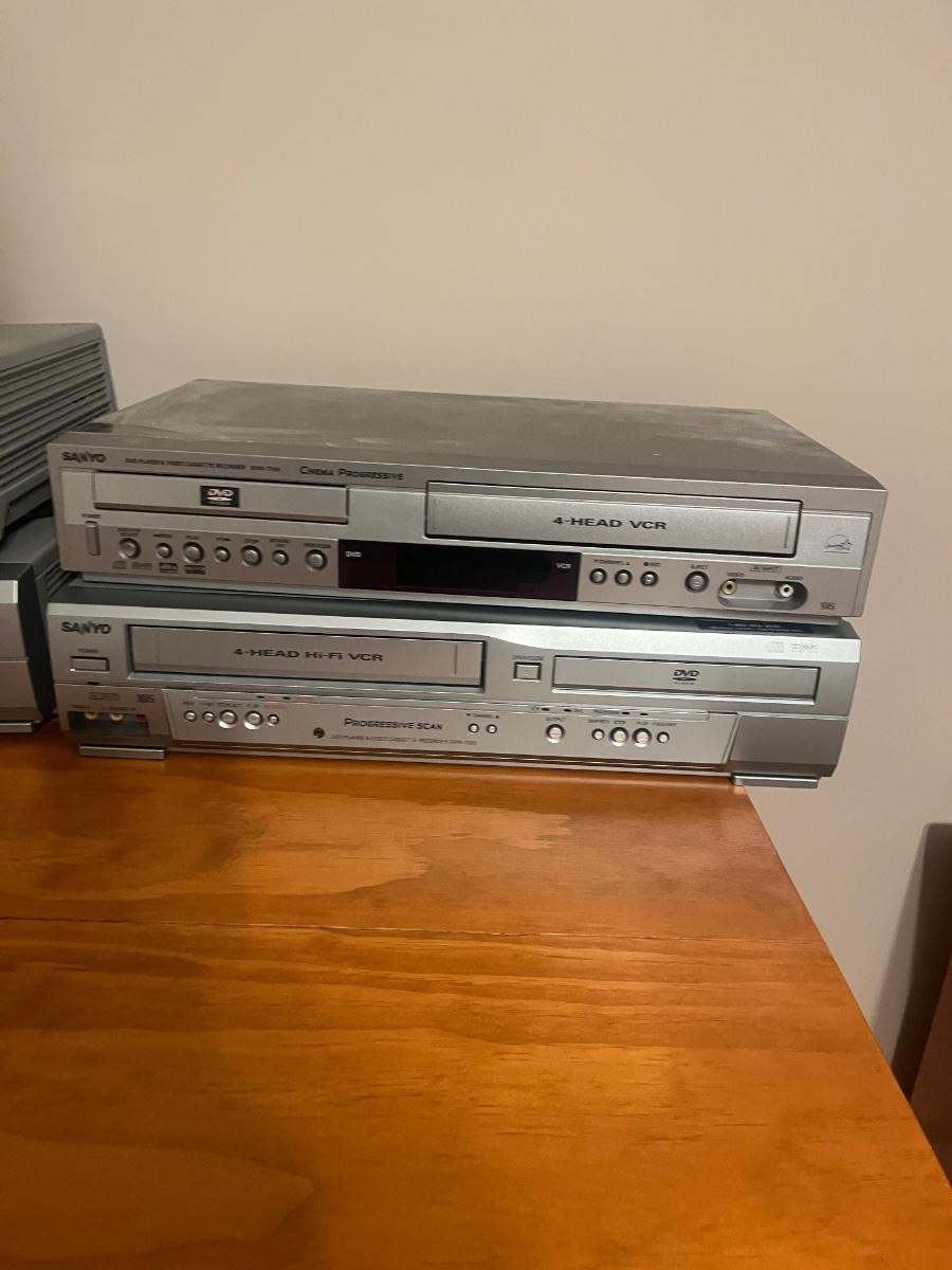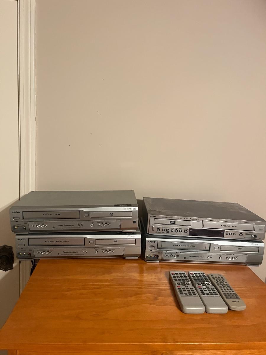 Lot includes four Sanyo DVD & VCRs with three remotes. One is model # DVW 7100A and one is model # DVW-7100 and the other two are model Del # DVW 7200. All four powered on when plugged in. Machines measure 17” x 9” x 4”H.
