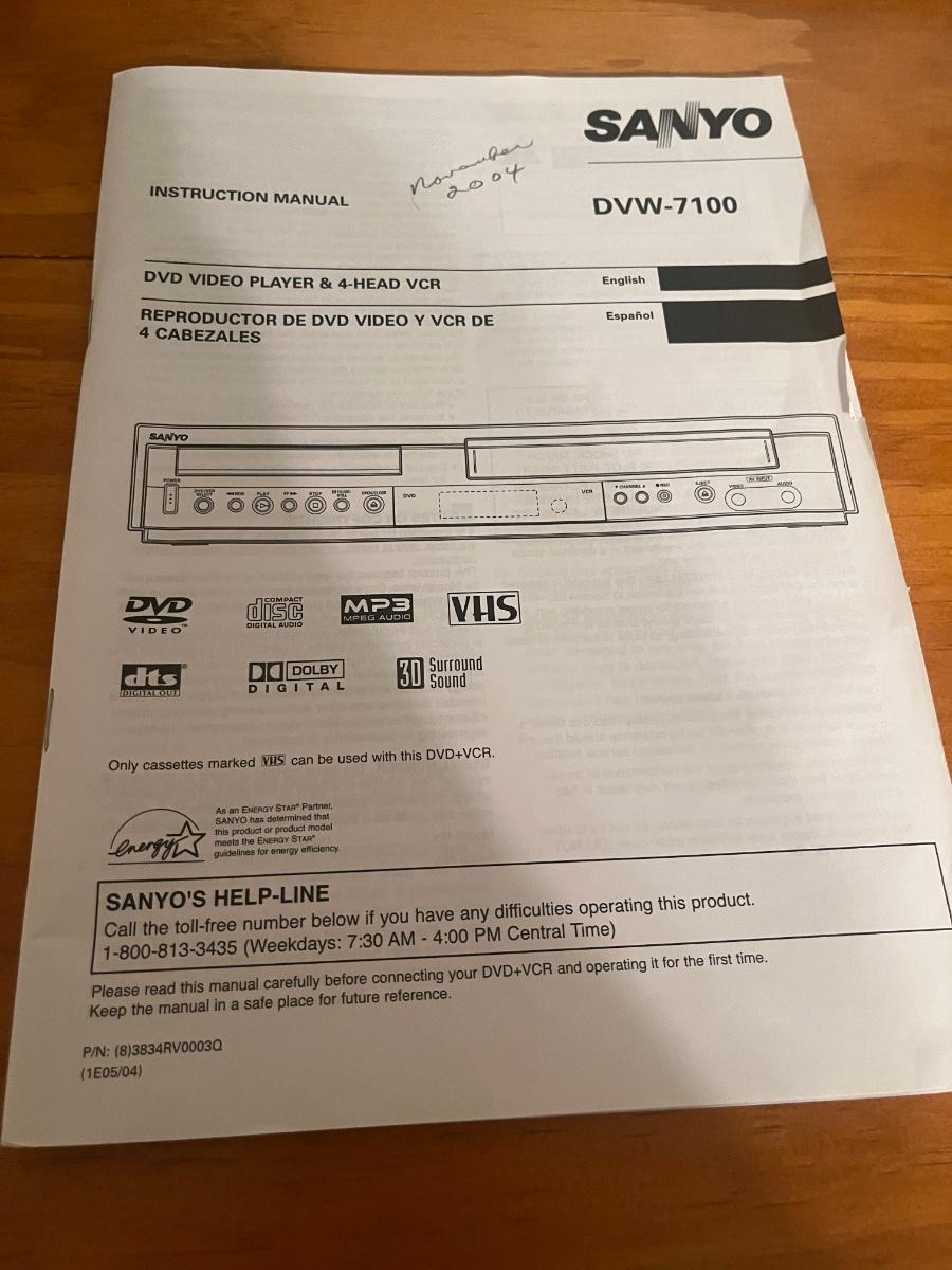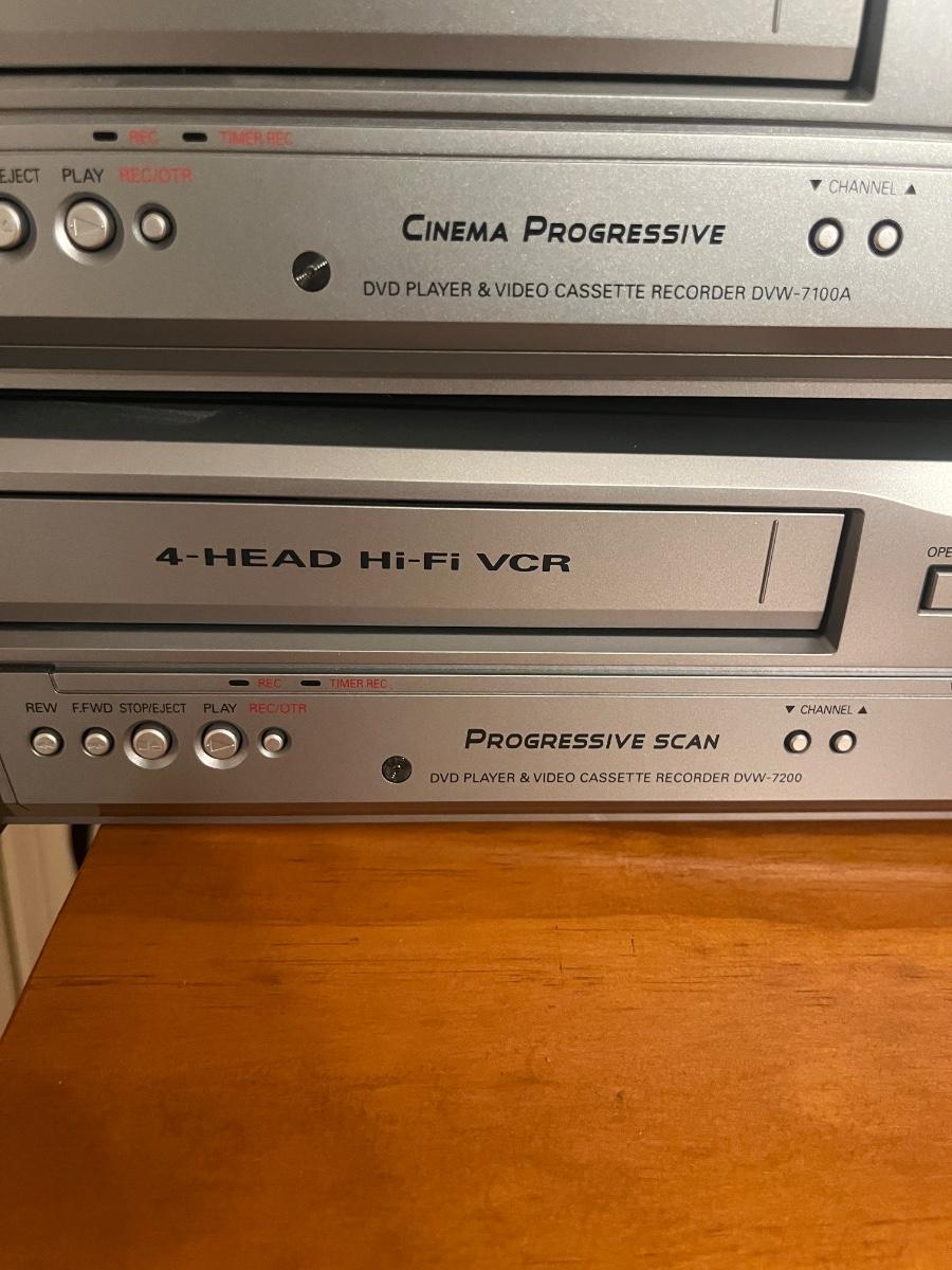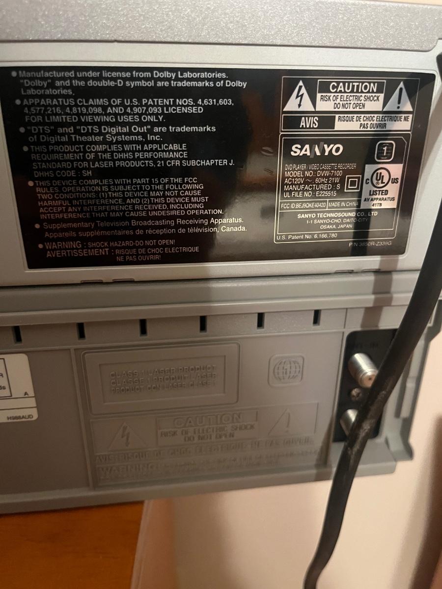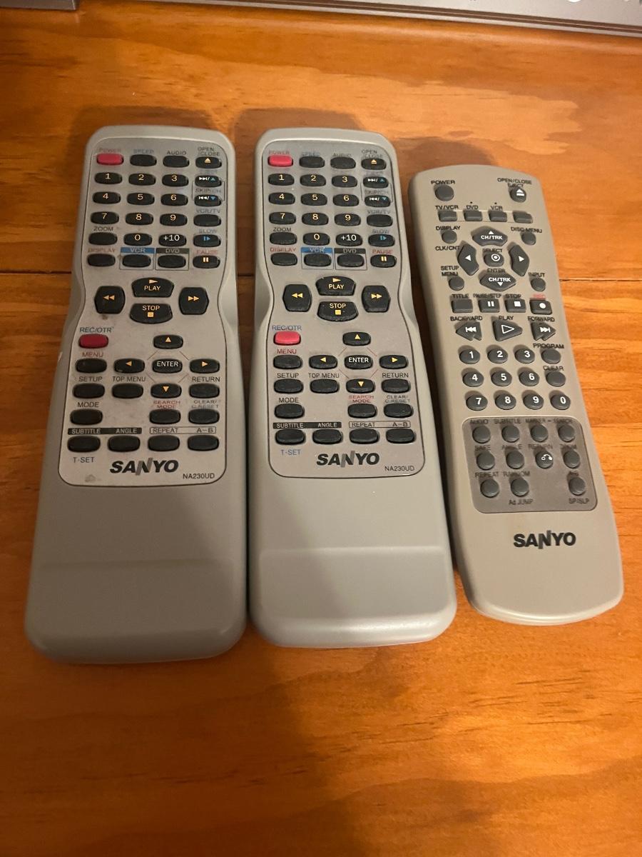 Lot includes four Sanyo DVD & VCRs with three remotes. One is model # DVW 7100A and one is model # DVW-7100 and the other two are model Del # DVW 7200. All four powered on when plugged in. Machines measure 17” x 9” x 4”H.