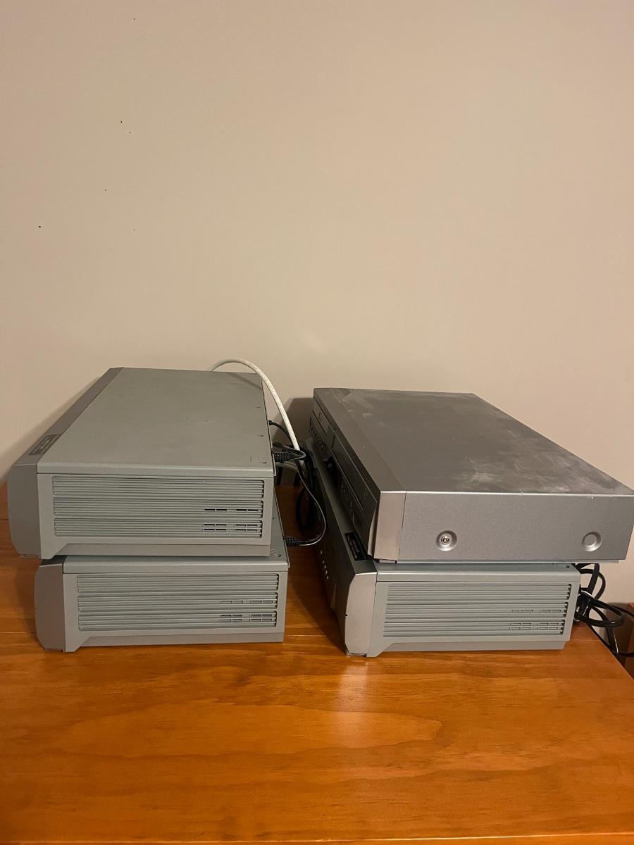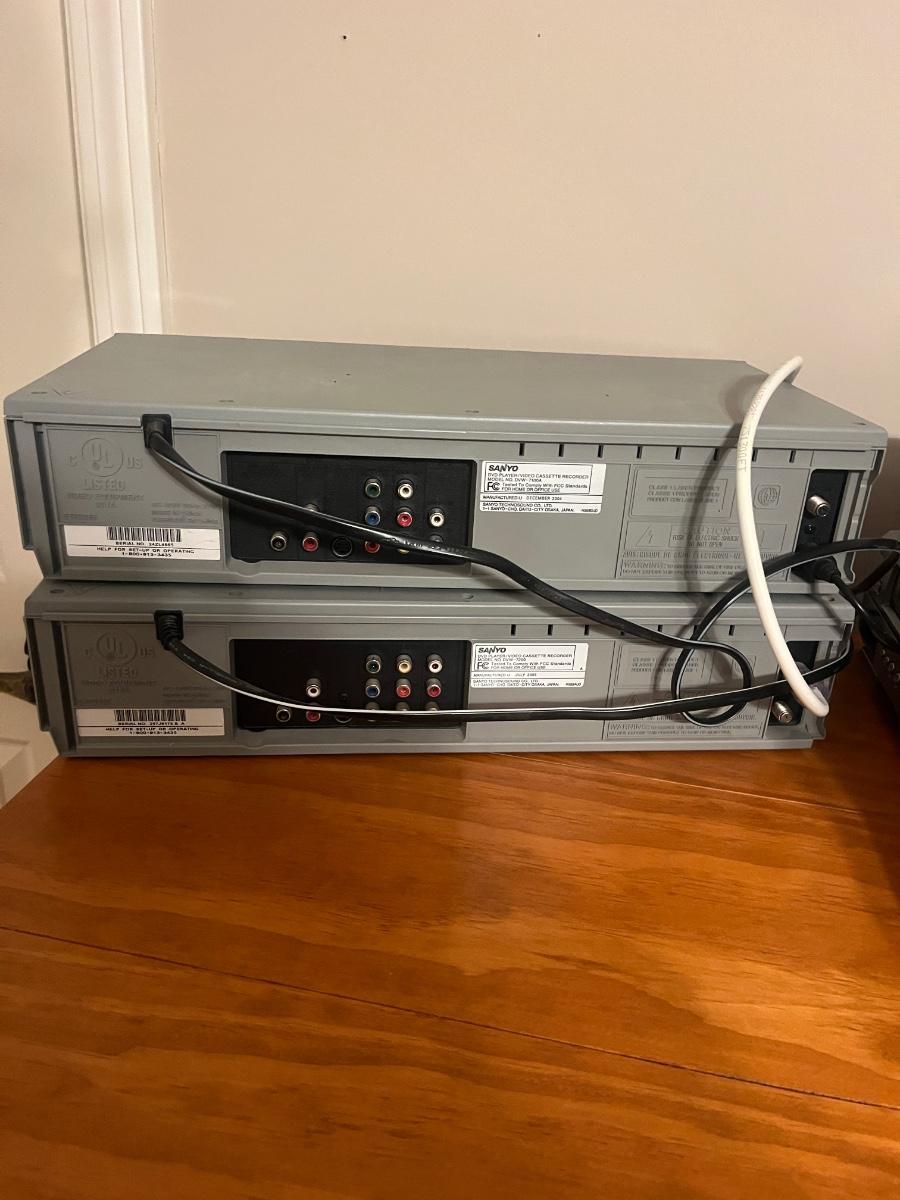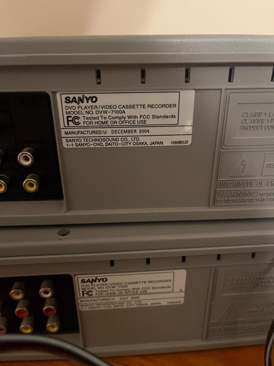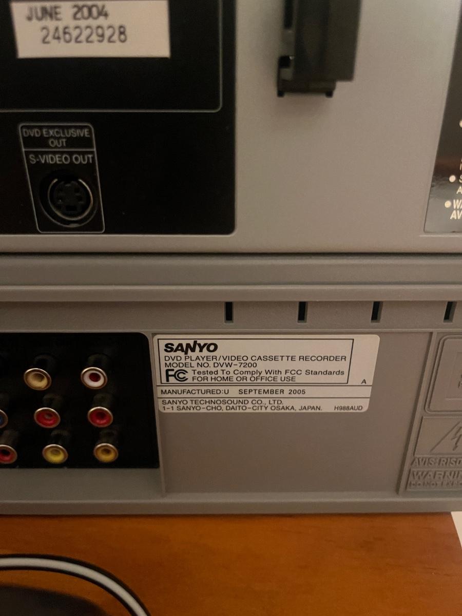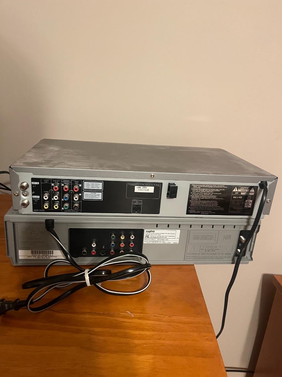 Lot includes four Sanyo DVD & VCRs with three remotes. One is model # DVW 7100A and one is model # DVW-7100 and the other two are model Del # DVW 7200. All four powered on when plugged in. Machines measure 17” x 9” x 4”H.
