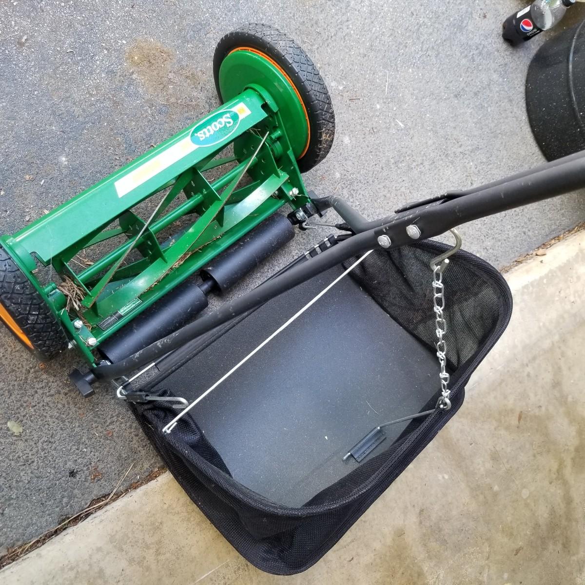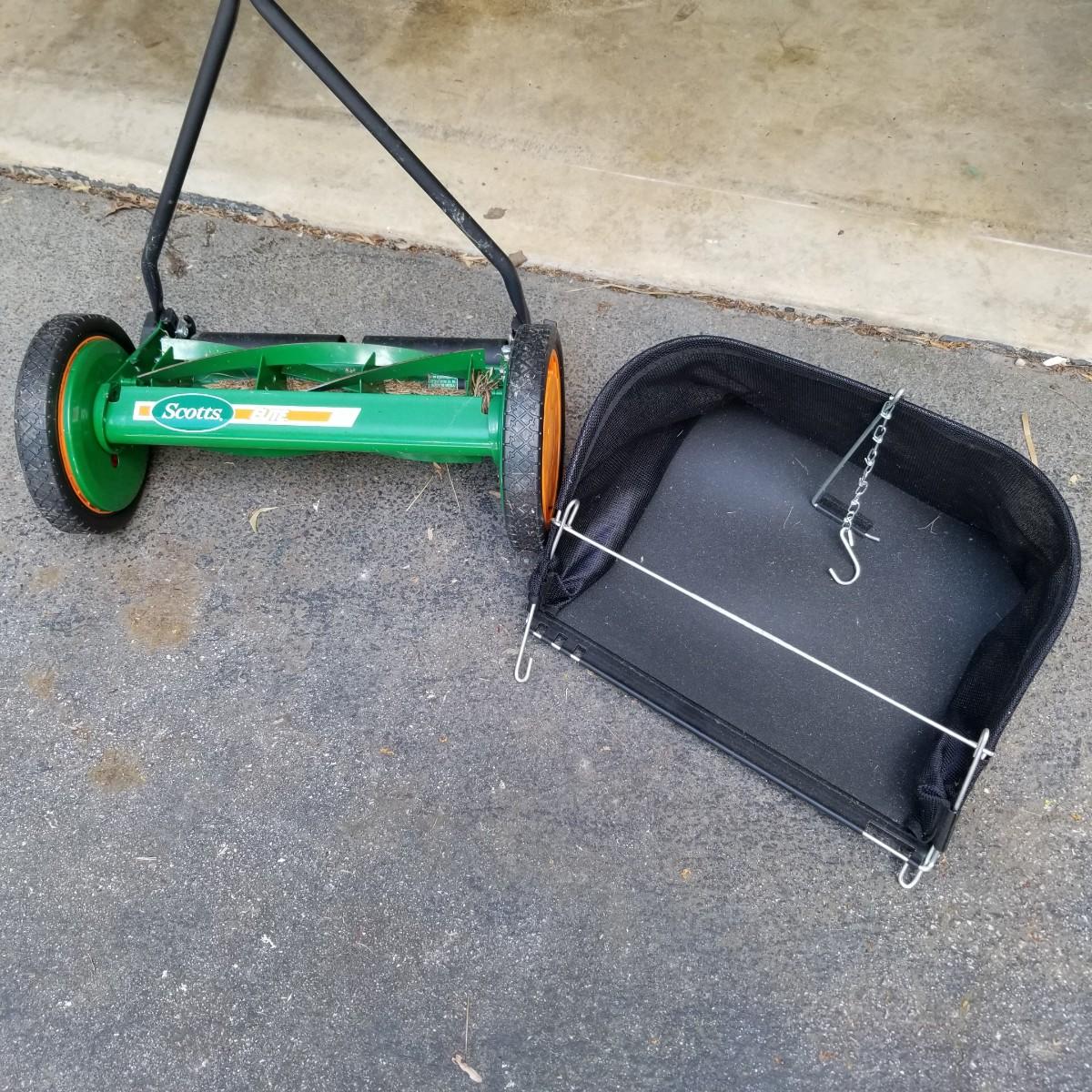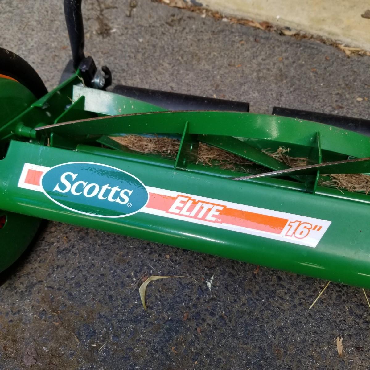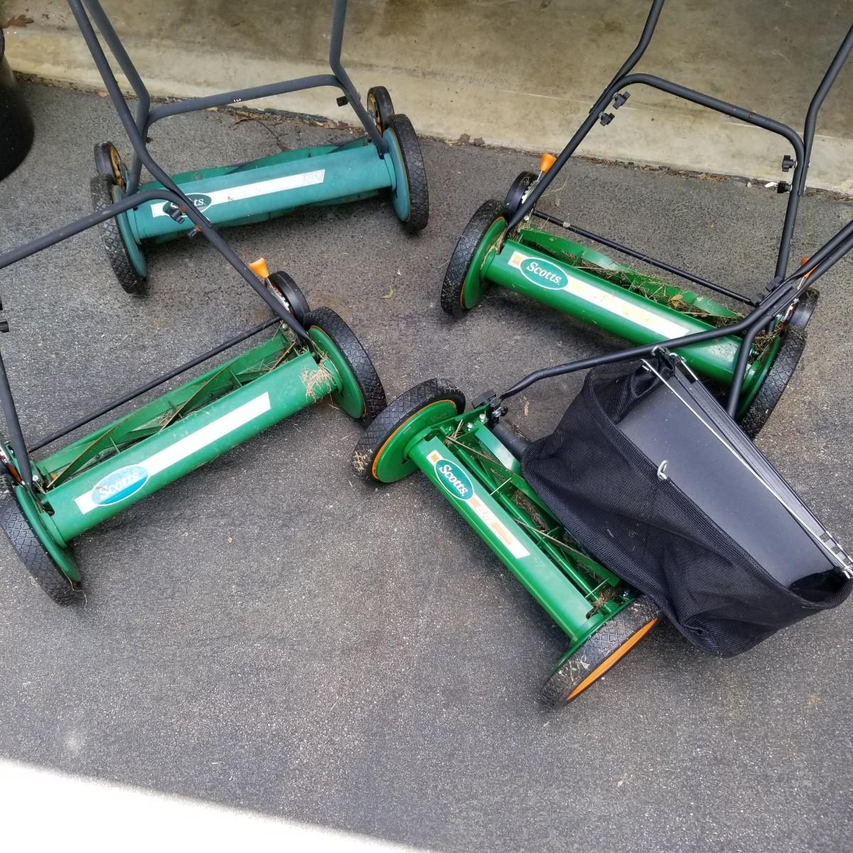 A mix of Scotts reel style mowers. Three Classic 20" cut mowers, all with padded handles, some wear. One 16" Elite mower with bagging attachment. All items show some wear and normal use. Local pickup only.