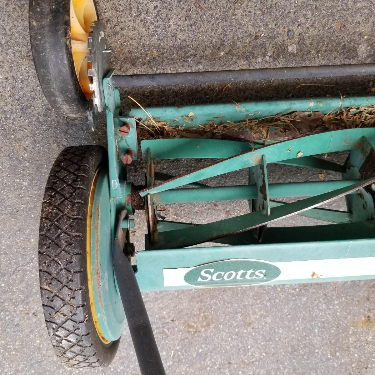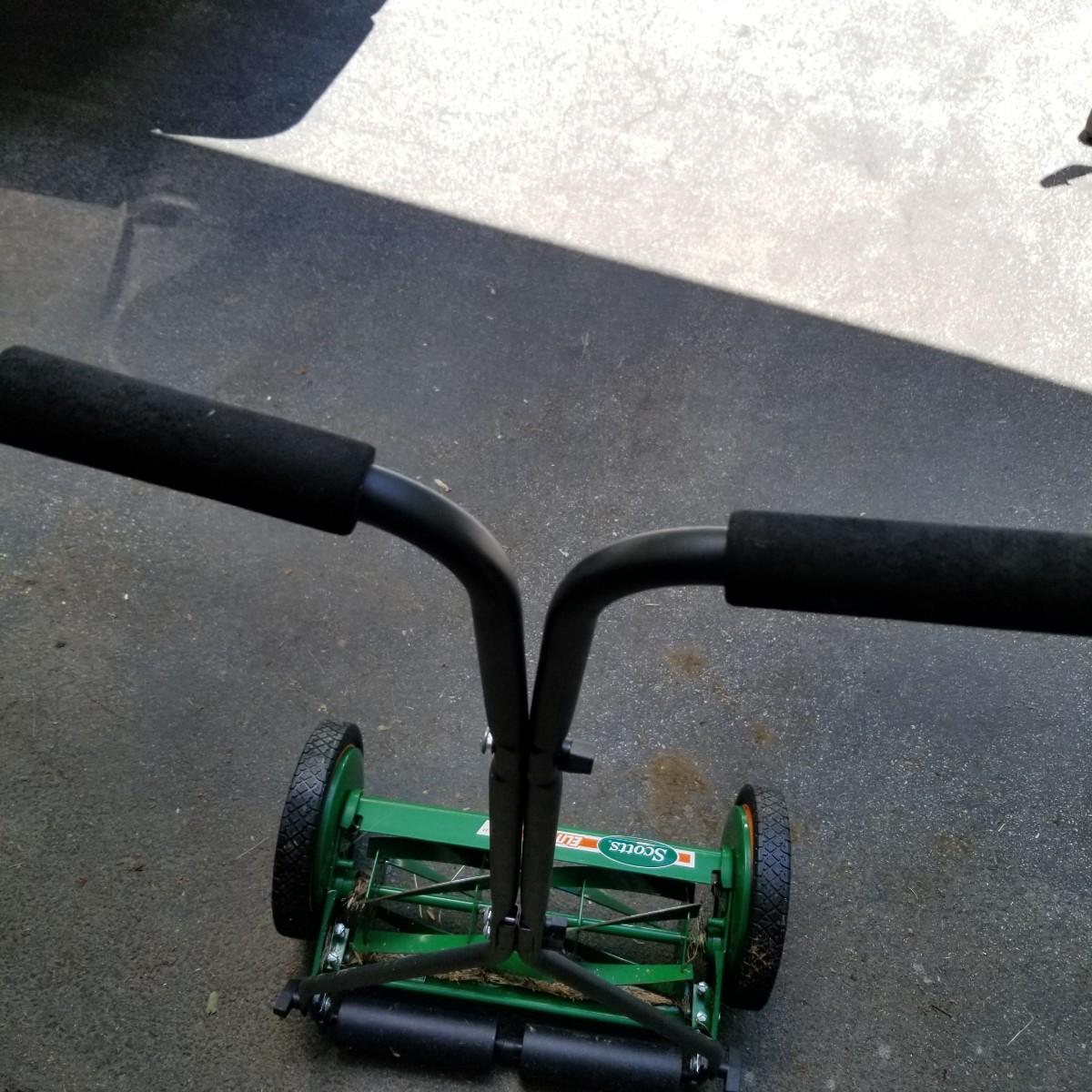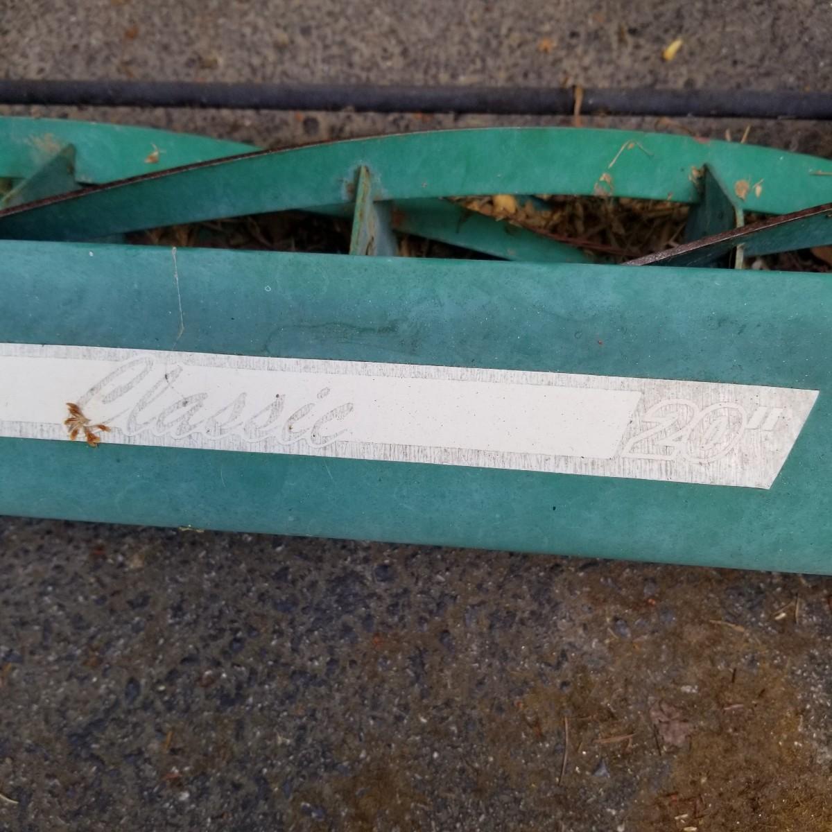 A mix of Scotts reel style mowers. Three Classic 20" cut mowers, all with padded handles, some wear. One 16" Elite mower with bagging attachment. All items show some wear and normal use. Local pickup only.