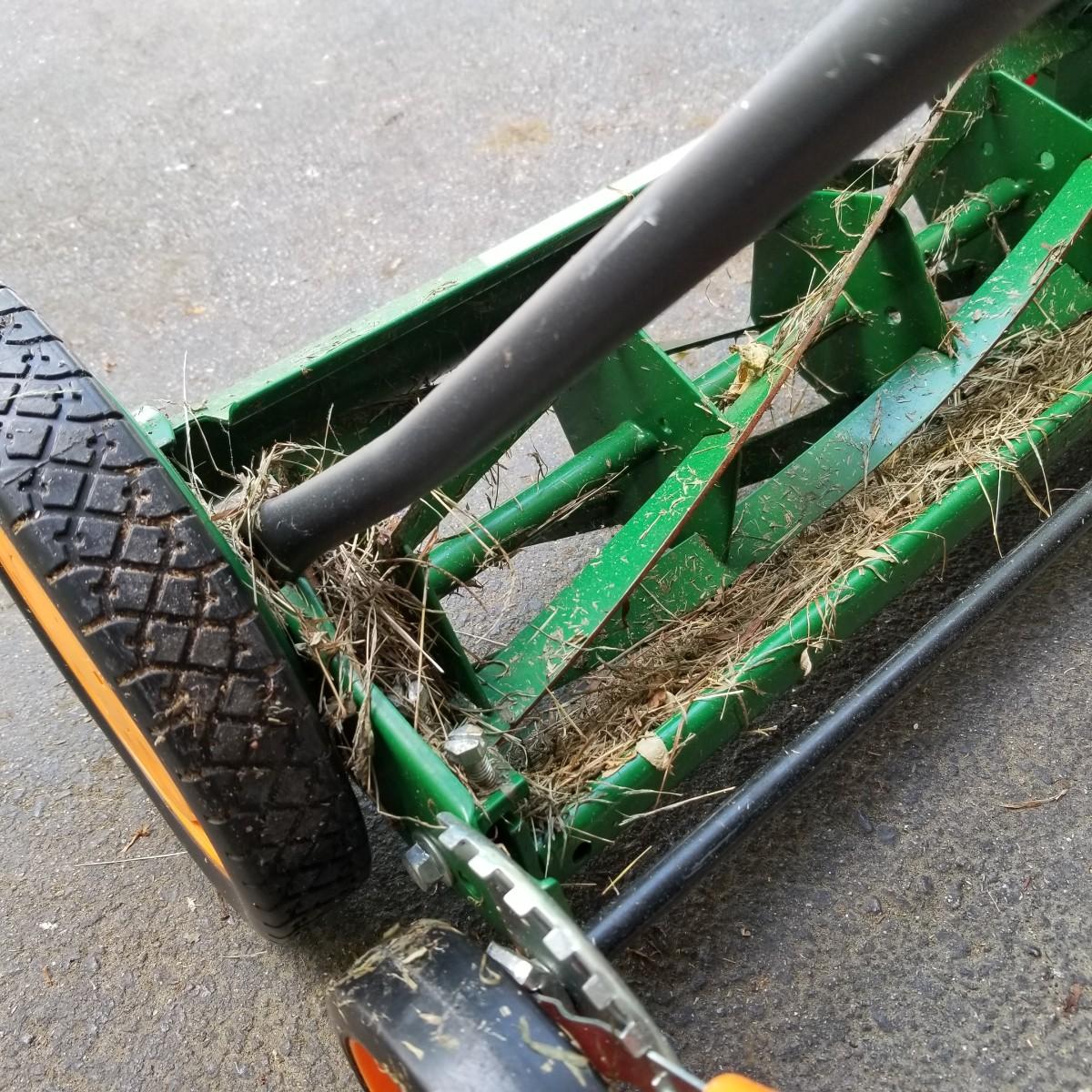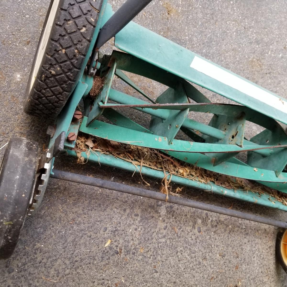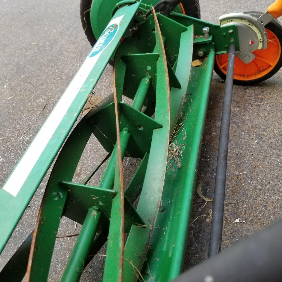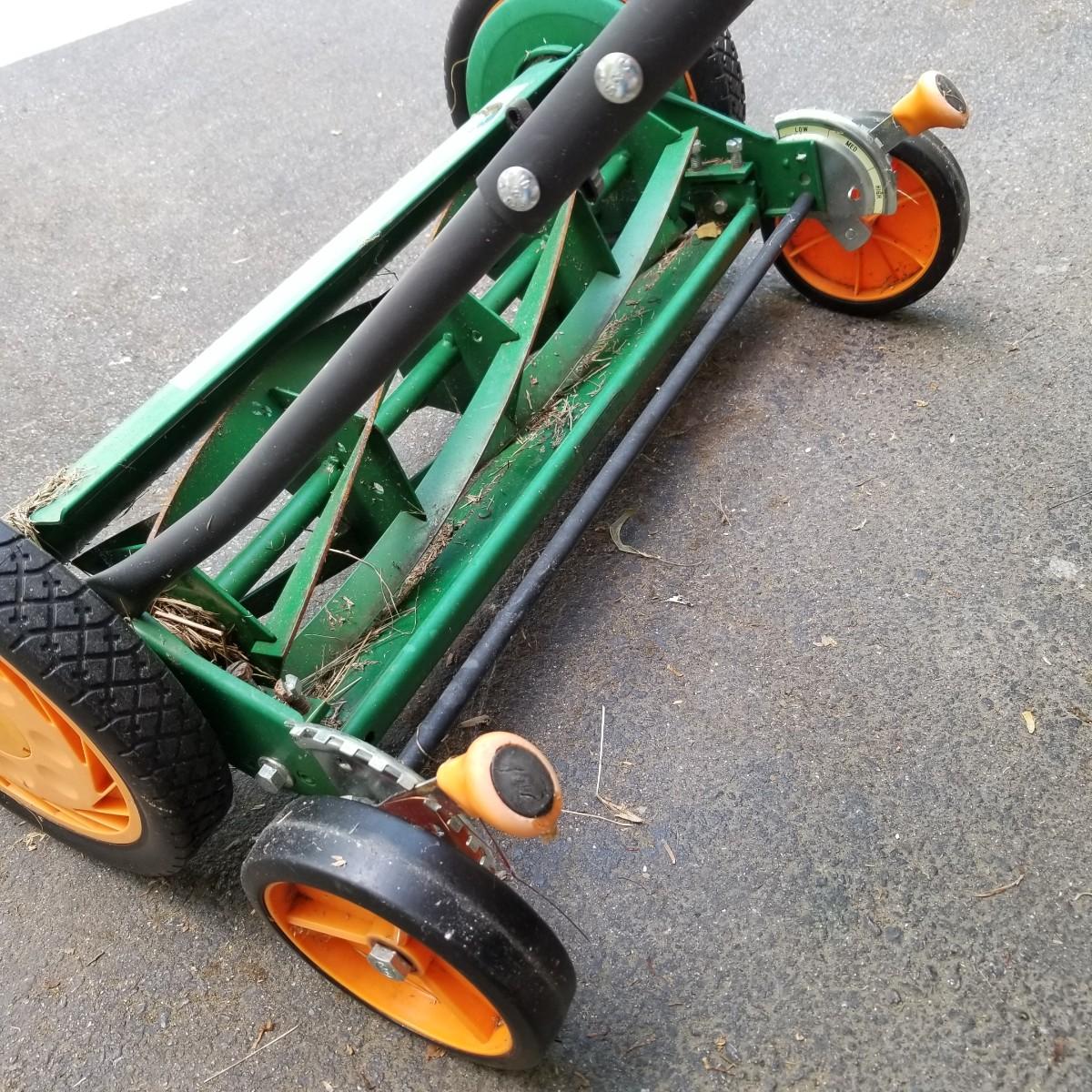 A mix of Scotts reel style mowers. Three Classic 20" cut mowers, all with padded handles, some wear. One 16" Elite mower with bagging attachment. All items show some wear and normal use. Local pickup only.