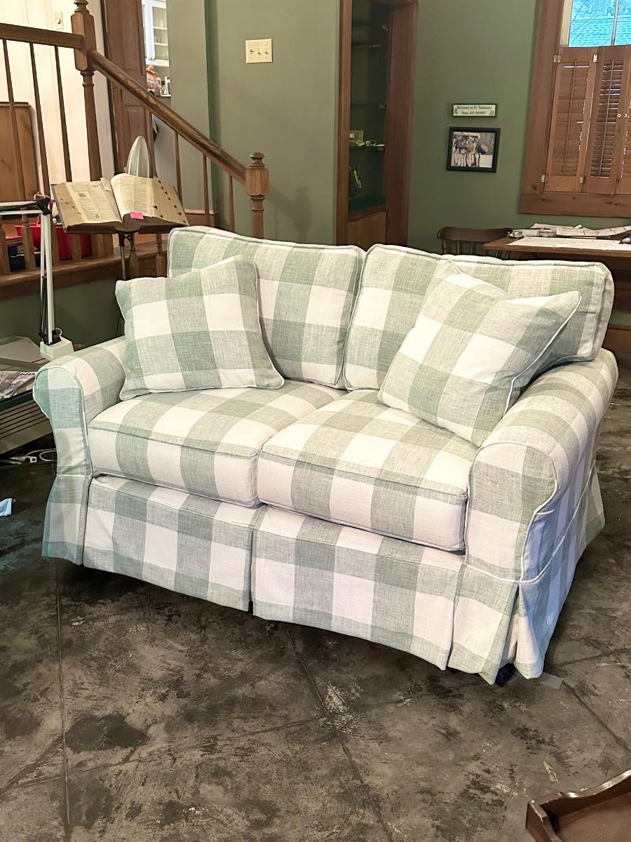 Like New ~purchased from Doors Furniture here in Covington. ~ Fabric is Buffalo Tranquil . It’s off white & sage. Approximately 39” to top of pillow x 62” W x 38” D ~ We have 2 for sale ~ This is on the ground level
