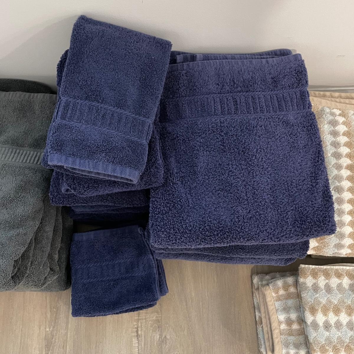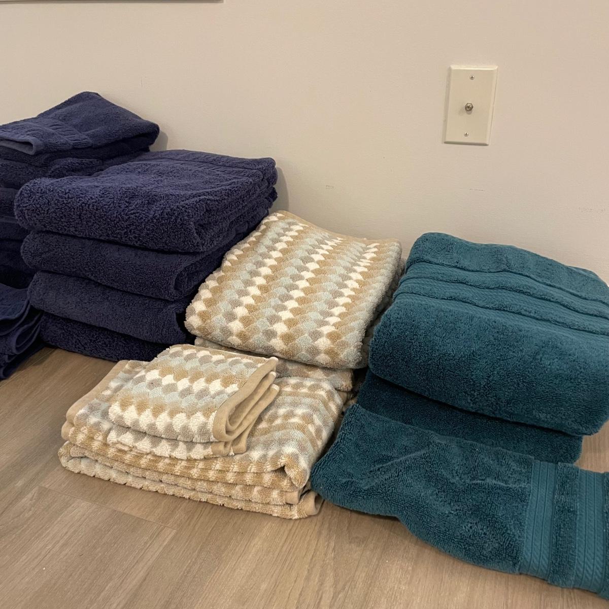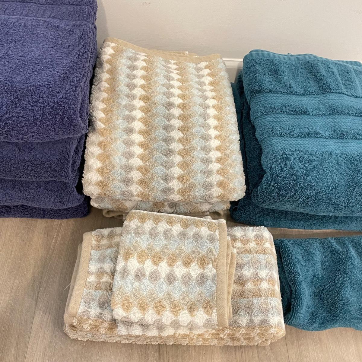 Four nice sets of bath towels. The dark sage green by Utopia Towels has three bath towels and six hand towels, plus two complementing 40” x 23” rubber bottomed bath rugs. The Blue My Pillow set has four wash cloths, eight hand towels and four bath towels, plus one 40” x 23” and three 33” x 20” rubber bottomed rugs. The multi colored set has two each: wash cloth, hand towel and bath towel. Lastly the teal set has two bath towels and one hand towel. The multi-colored and teal sets have had their tags removed. See images. Local pick up only.