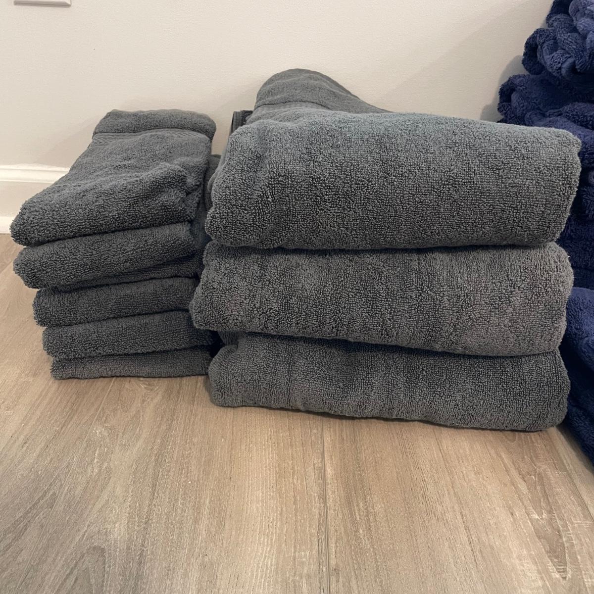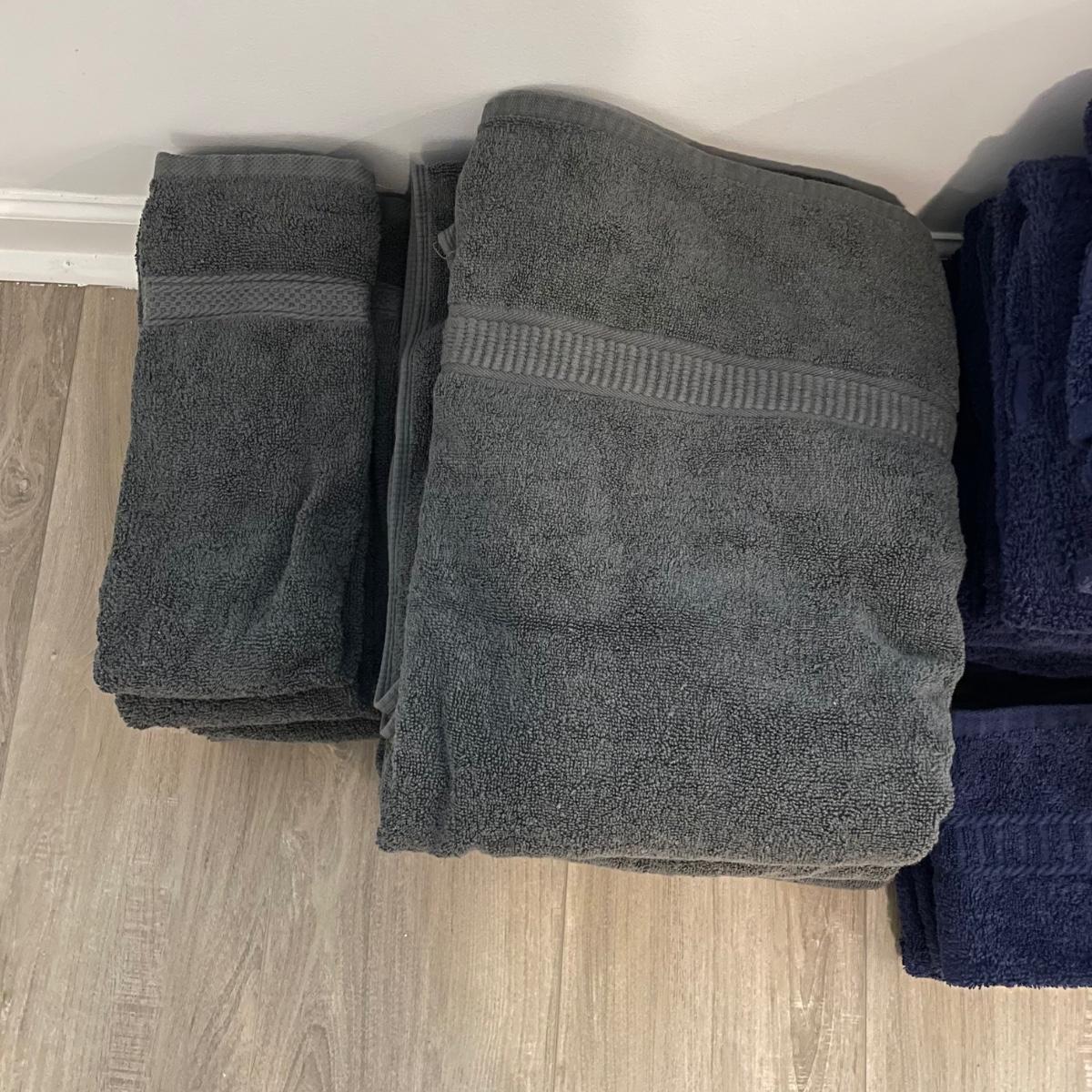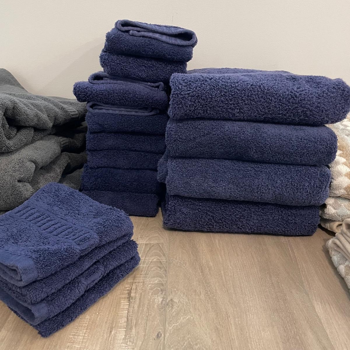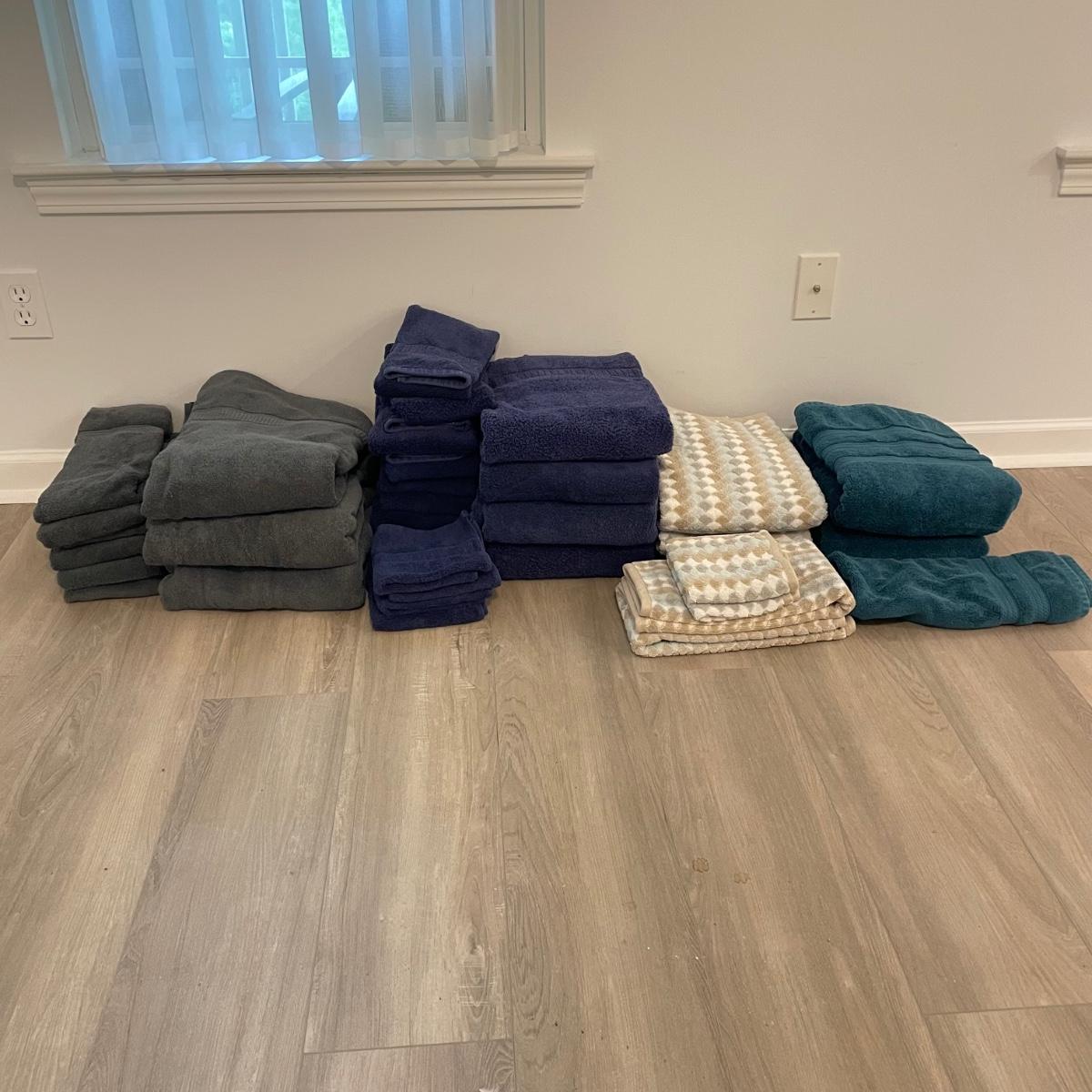 Four nice sets of bath towels. The dark sage green by Utopia Towels has three bath towels and six hand towels, plus two complementing 40” x 23” rubber bottomed bath rugs. The Blue My Pillow set has four wash cloths, eight hand towels and four bath towels, plus one 40” x 23” and three 33” x 20” rubber bottomed rugs. The multi colored set has two each: wash cloth, hand towel and bath towel. Lastly the teal set has two bath towels and one hand towel. The multi-colored and teal sets have had their tags removed. See images. Local pick up only.