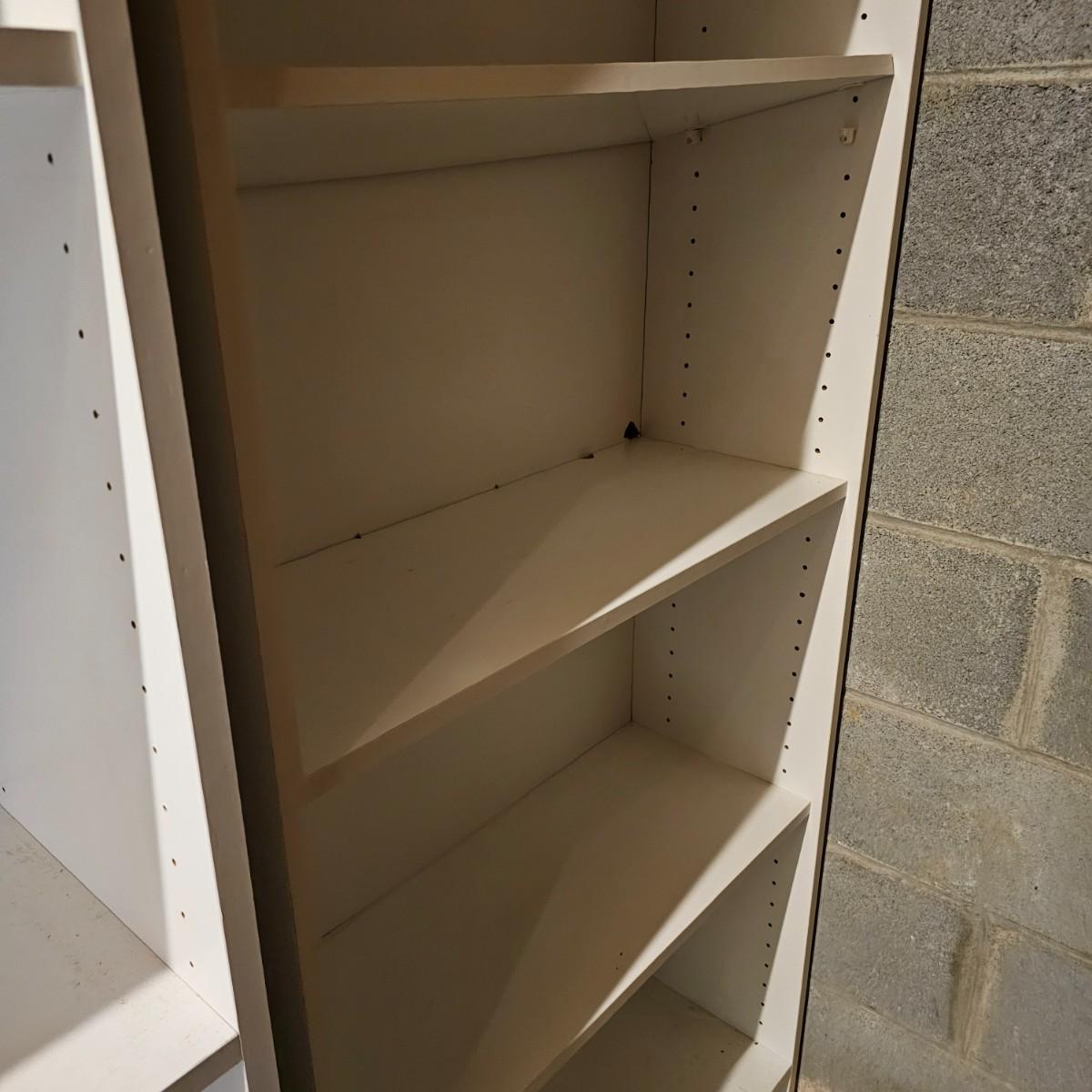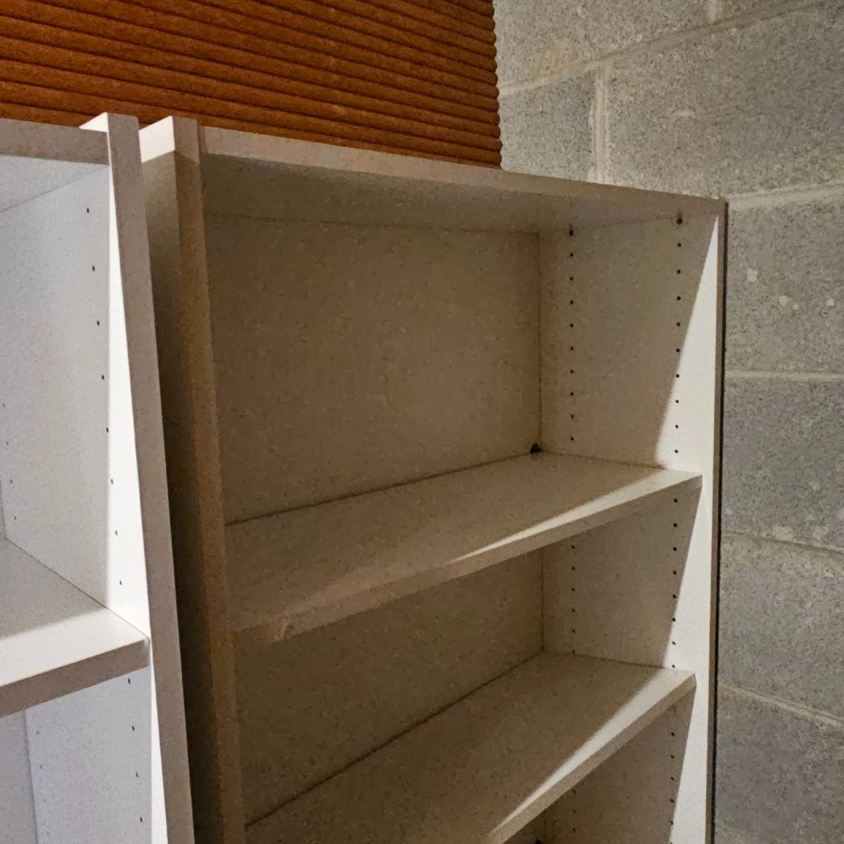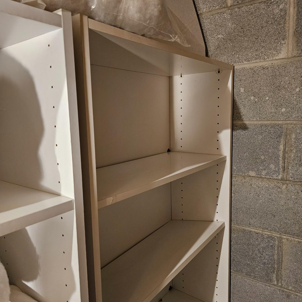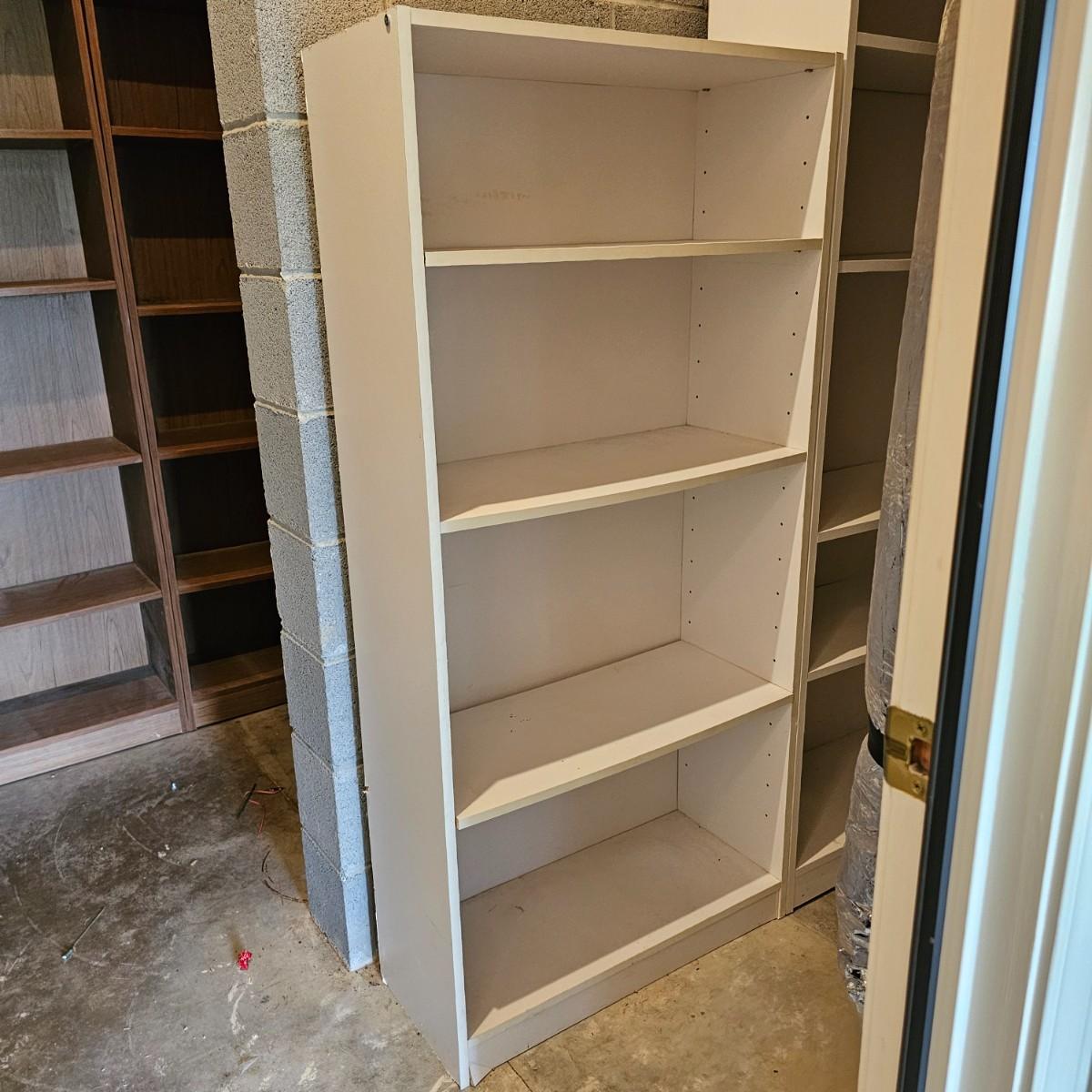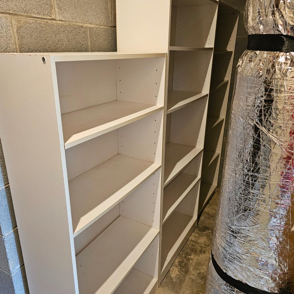 White finish shelf units with adjustable shelf pieces. Particle board construction. Three shelves together in basement, two taller are 30"E x 12"D x 72"H. Shorter shelf is 28"W x 12"D x 59"H. Shelf in garage measures 30"W x 12"D x 72"H and has cup hooks attached on sides. Units are located in two different locations, basement and garage. See photos for details. Local pickup only. Winning bidder must bring assistance to help move and load this item due to its weight and/or size. This item is located in the basement with a flight of stairs or alternatively a garden path with approximately 15 steps that can be used to go around the side of the house.