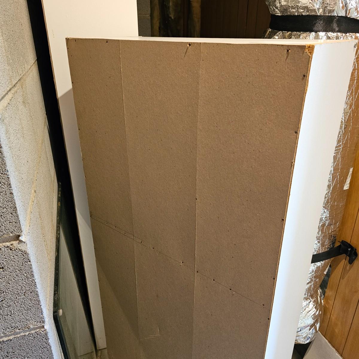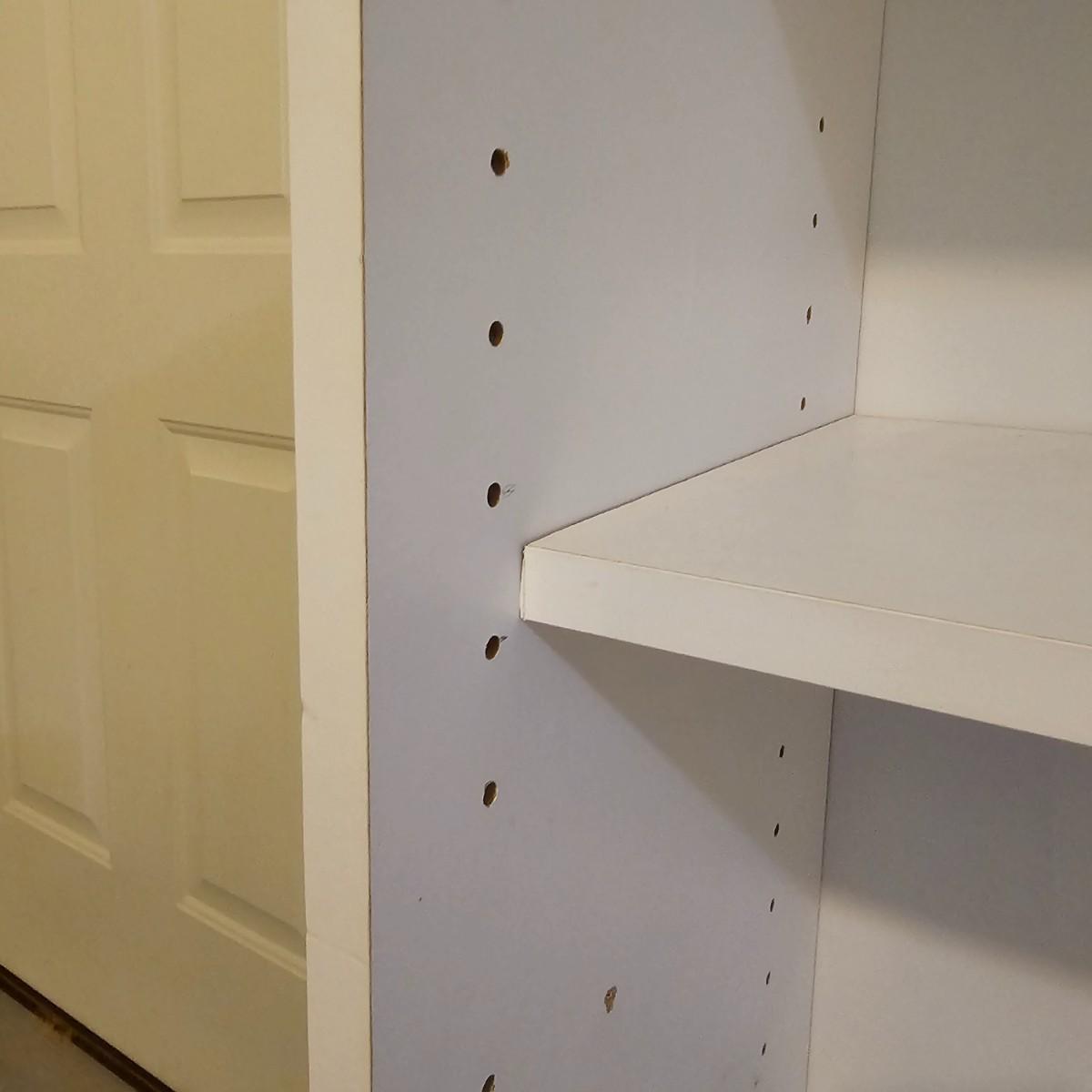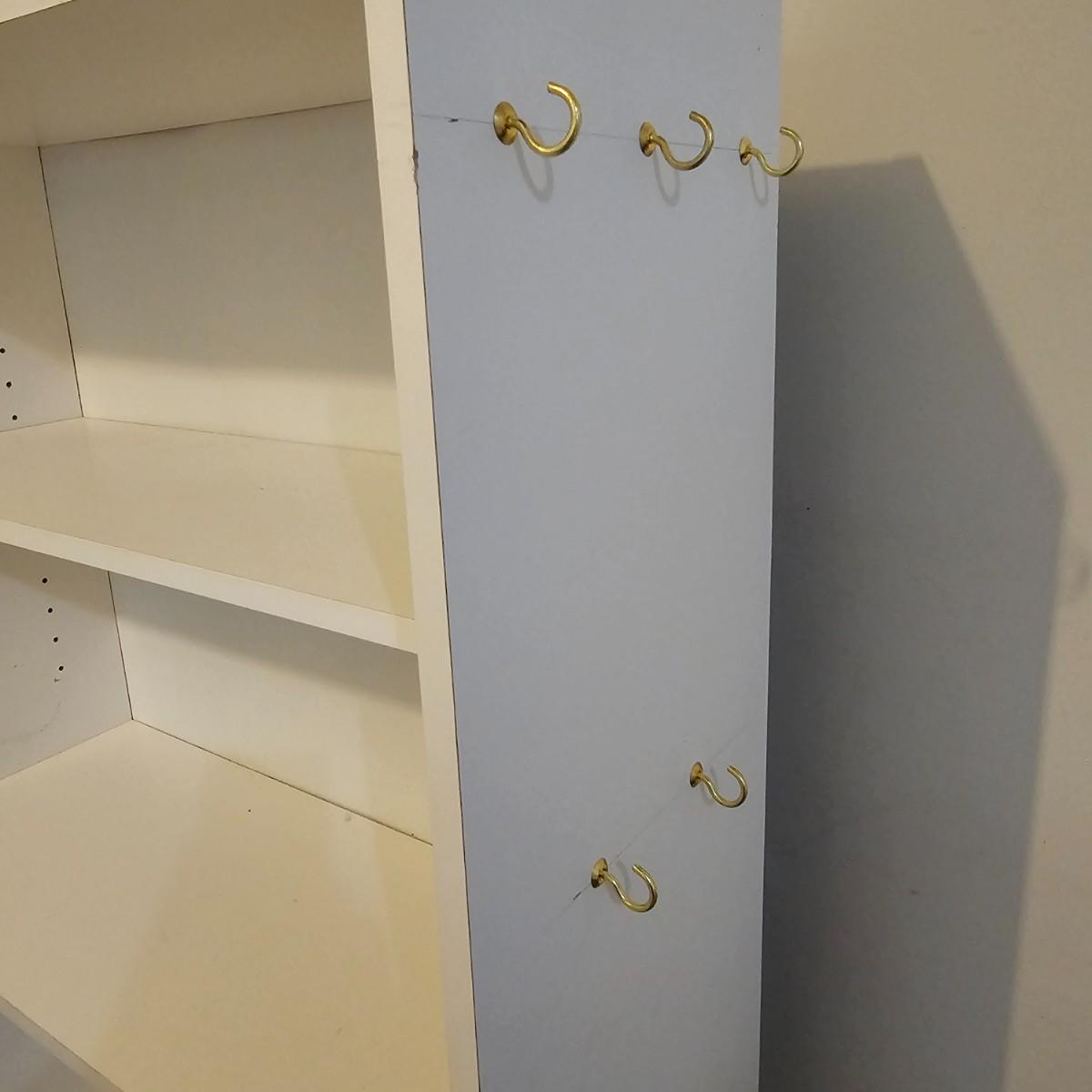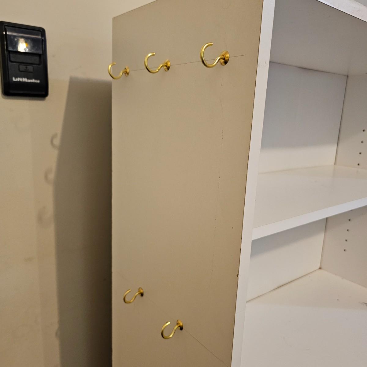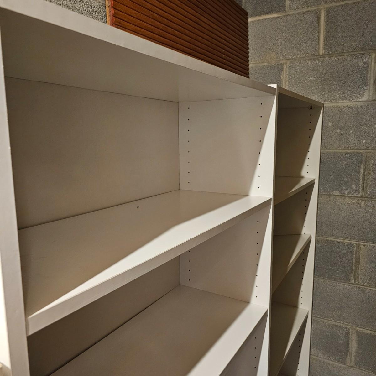 White finish shelf units with adjustable shelf pieces. Particle board construction. Three shelves together in basement, two taller are 30"E x 12"D x 72"H. Shorter shelf is 28"W x 12"D x 59"H. Shelf in garage measures 30"W x 12"D x 72"H and has cup hooks attached on sides. Units are located in two different locations, basement and garage. See photos for details. Local pickup only. Winning bidder must bring assistance to help move and load this item due to its weight and/or size. This item is located in the basement with a flight of stairs or alternatively a garden path with approximately 15 steps that can be used to go around the side of the house.