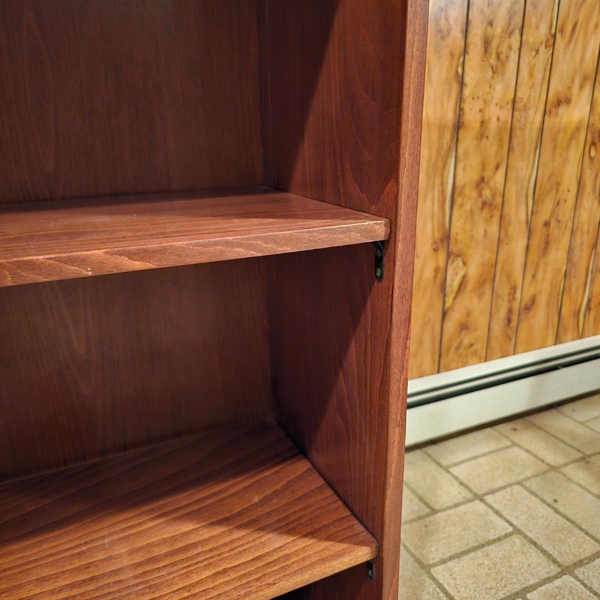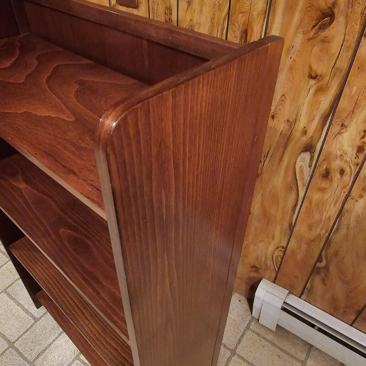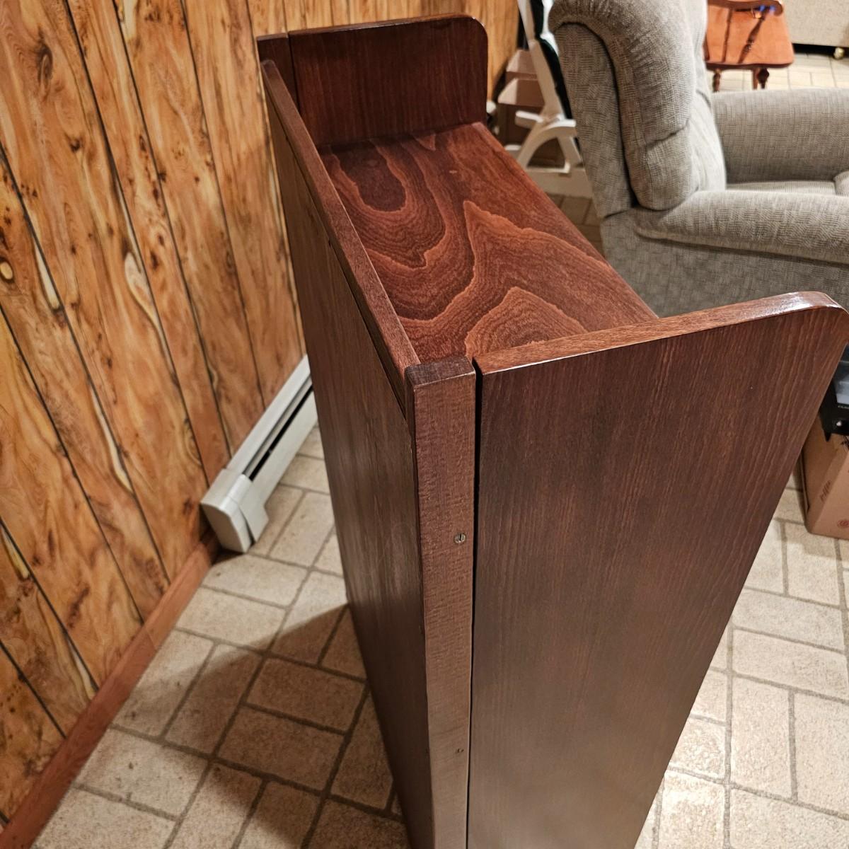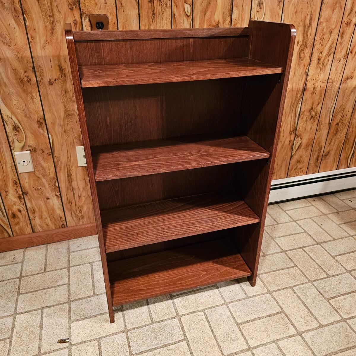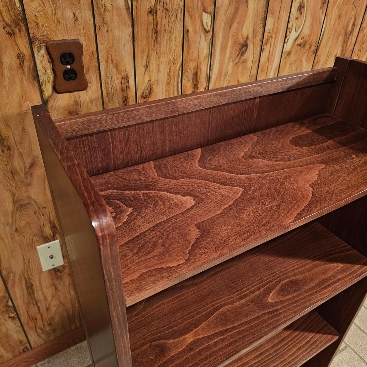 Solid wood unit with four shelves folds down for easy storage. Shelves lift up and sides fold over front. Unit measures 28" x 12" x 45.5"H when open, 2.5" thick folded down. Some minor blemishes from open/close action. See photos for details. Local pickup only.