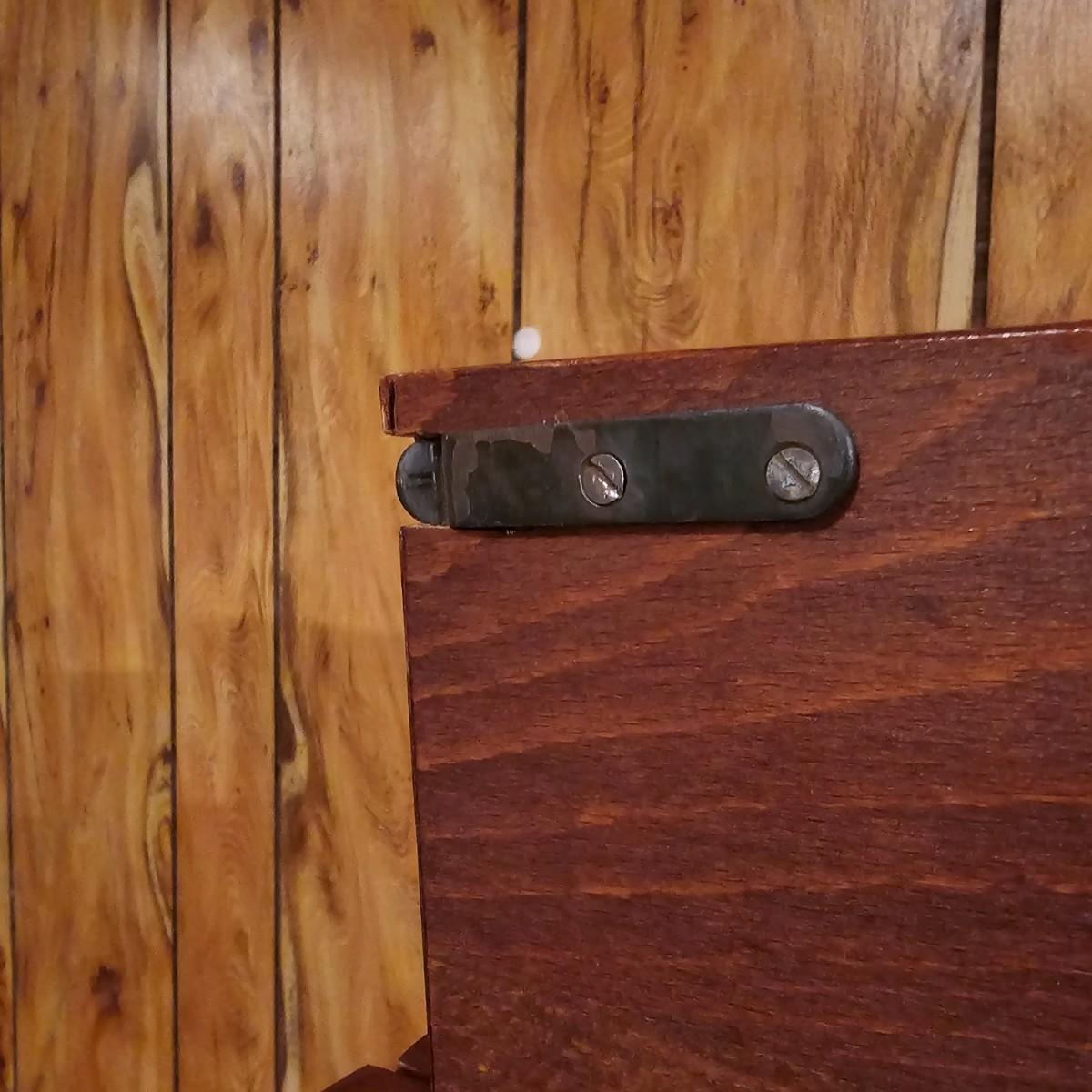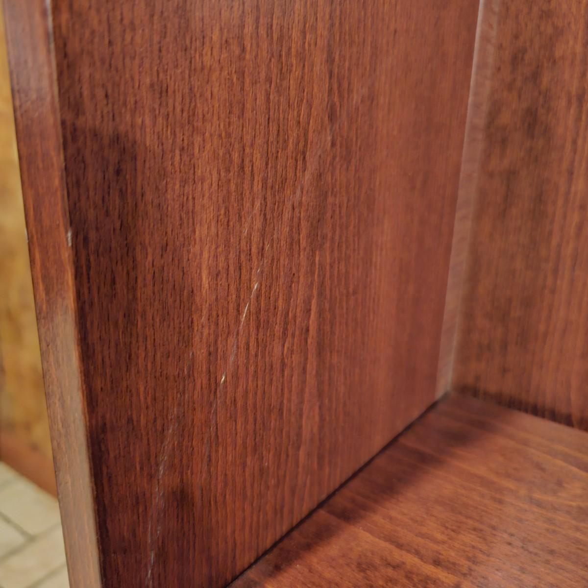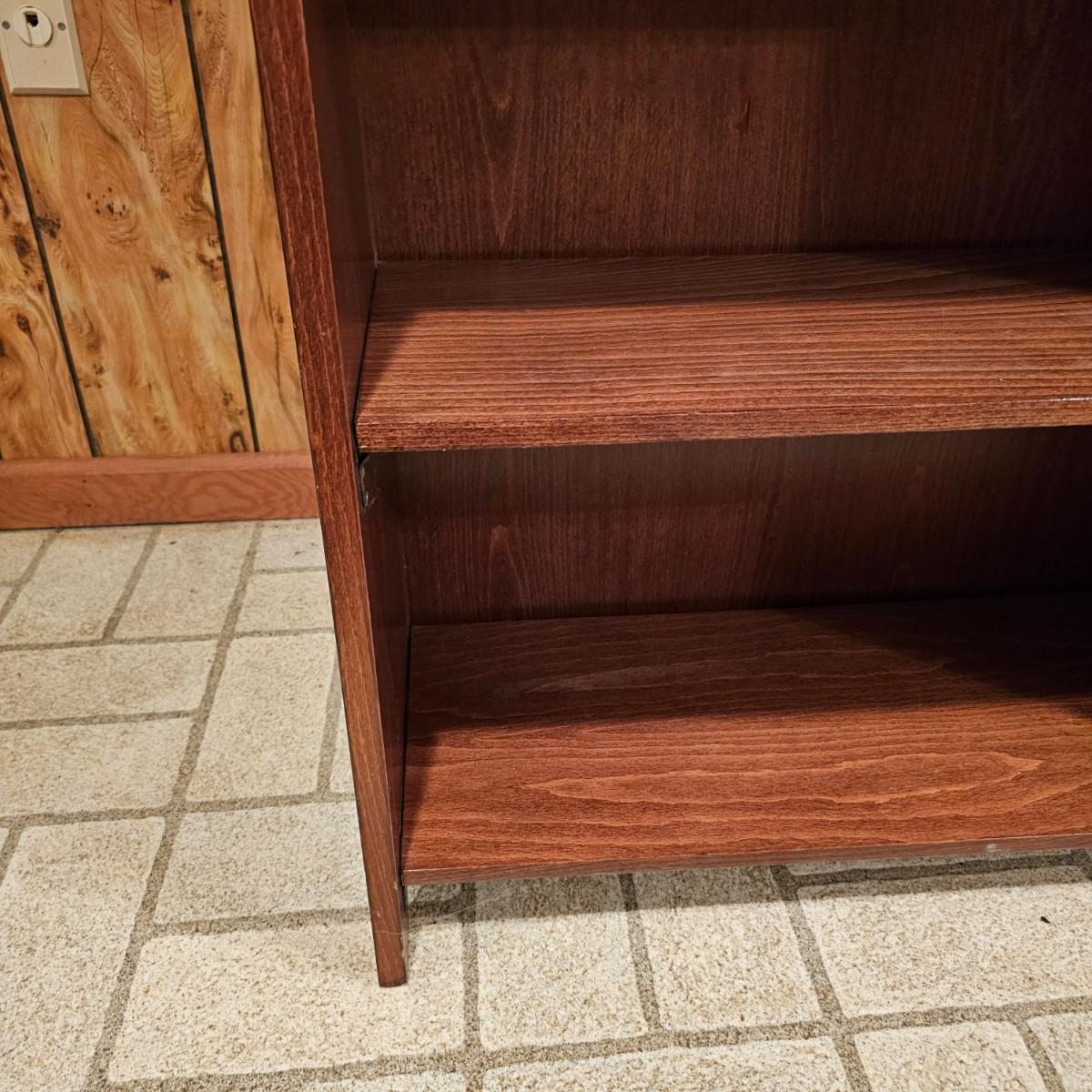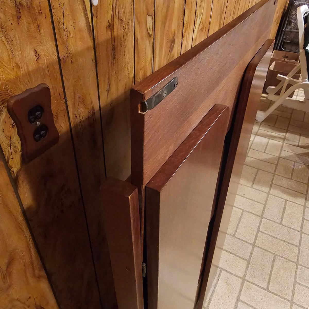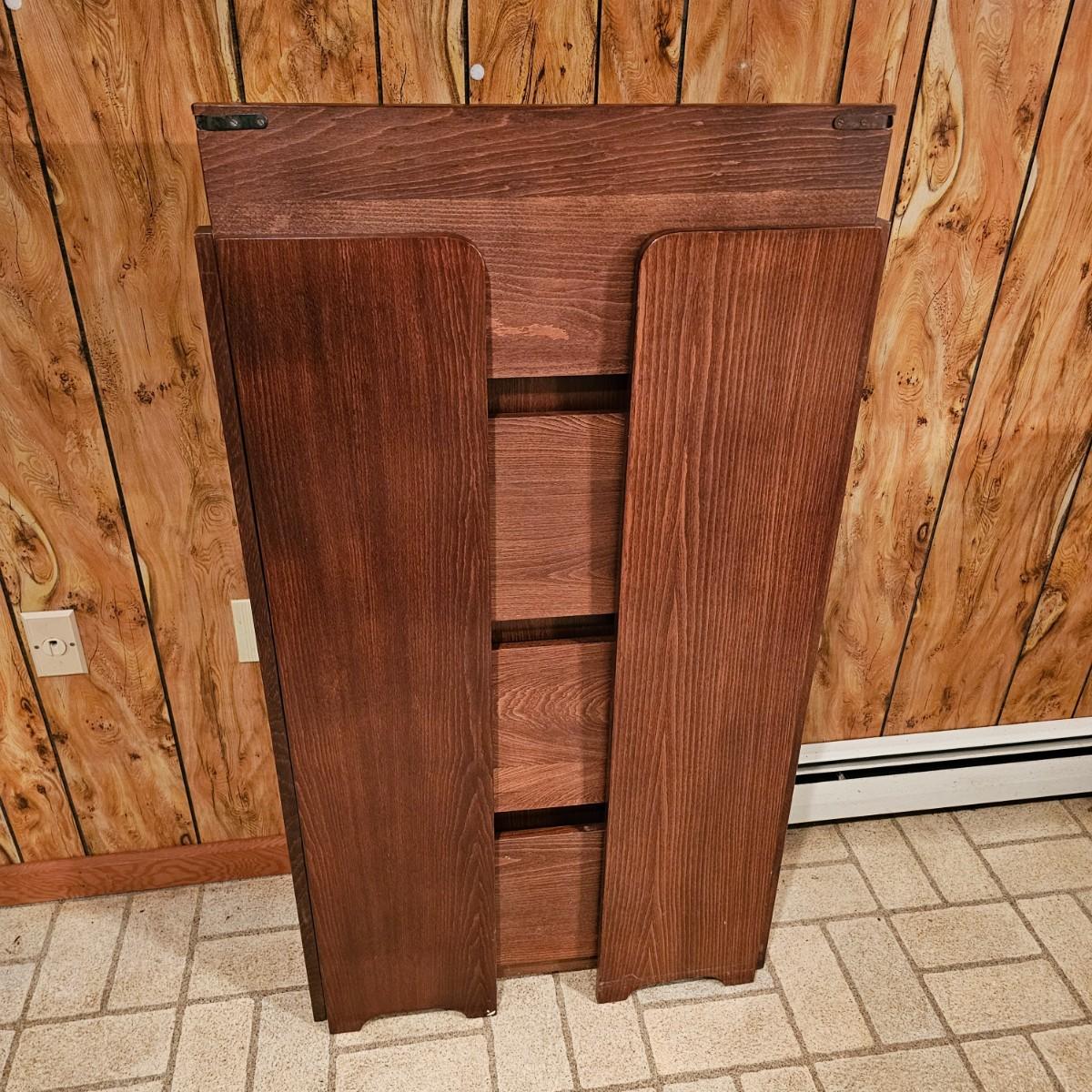 Solid wood unit with four shelves folds down for easy storage. Shelves lift up and sides fold over front. Unit measures 28" x 12" x 45.5"H when open, 2.5" thick folded down. Some minor blemishes from open/close action. See photos for details. Local pickup only.
