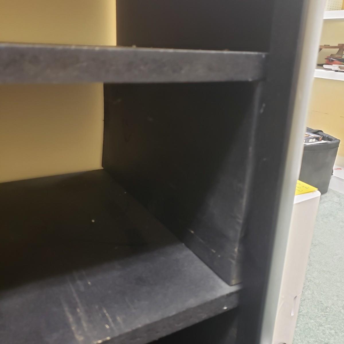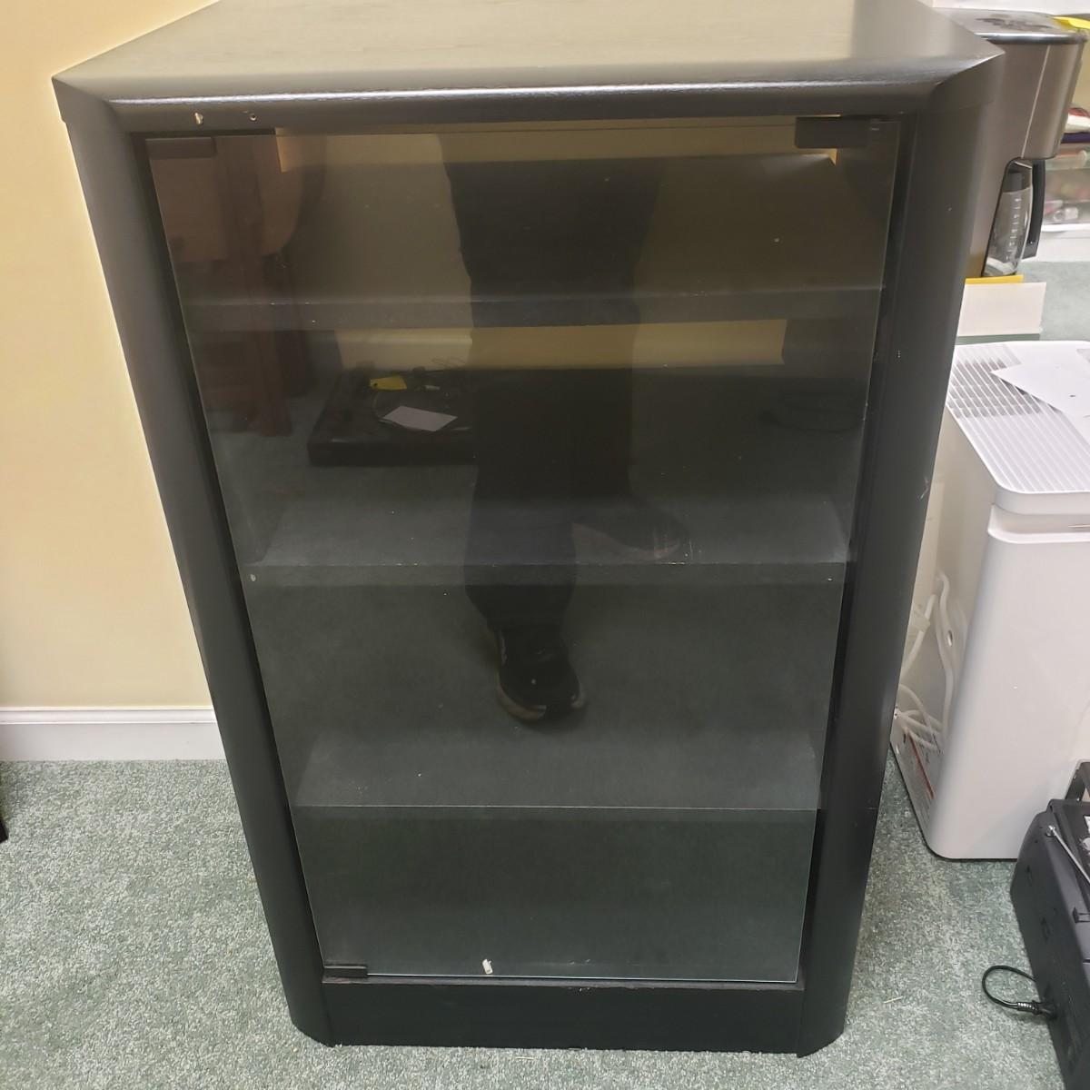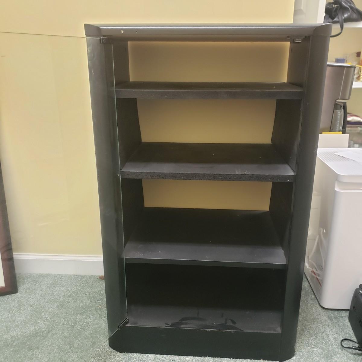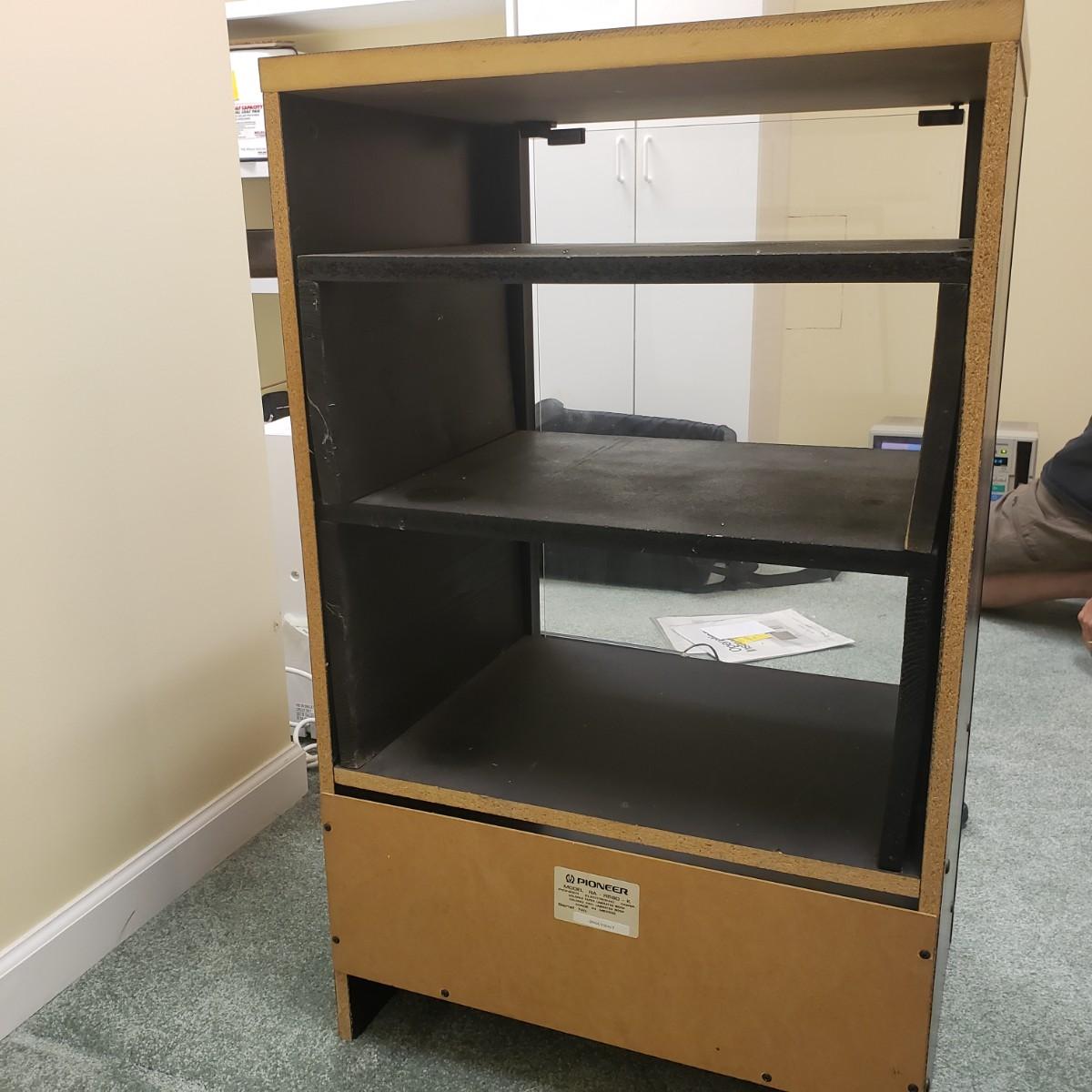 This is a Pioneer black stereo cabinet measureing 22" x 16" x 35"H. It has a glass door with a magnet closer. The bottom shelf appears original and the top two appear made, see picture. It has an open back for easy cord control. The cabinet is partical board that is laminated. The other two shelves are plywood.