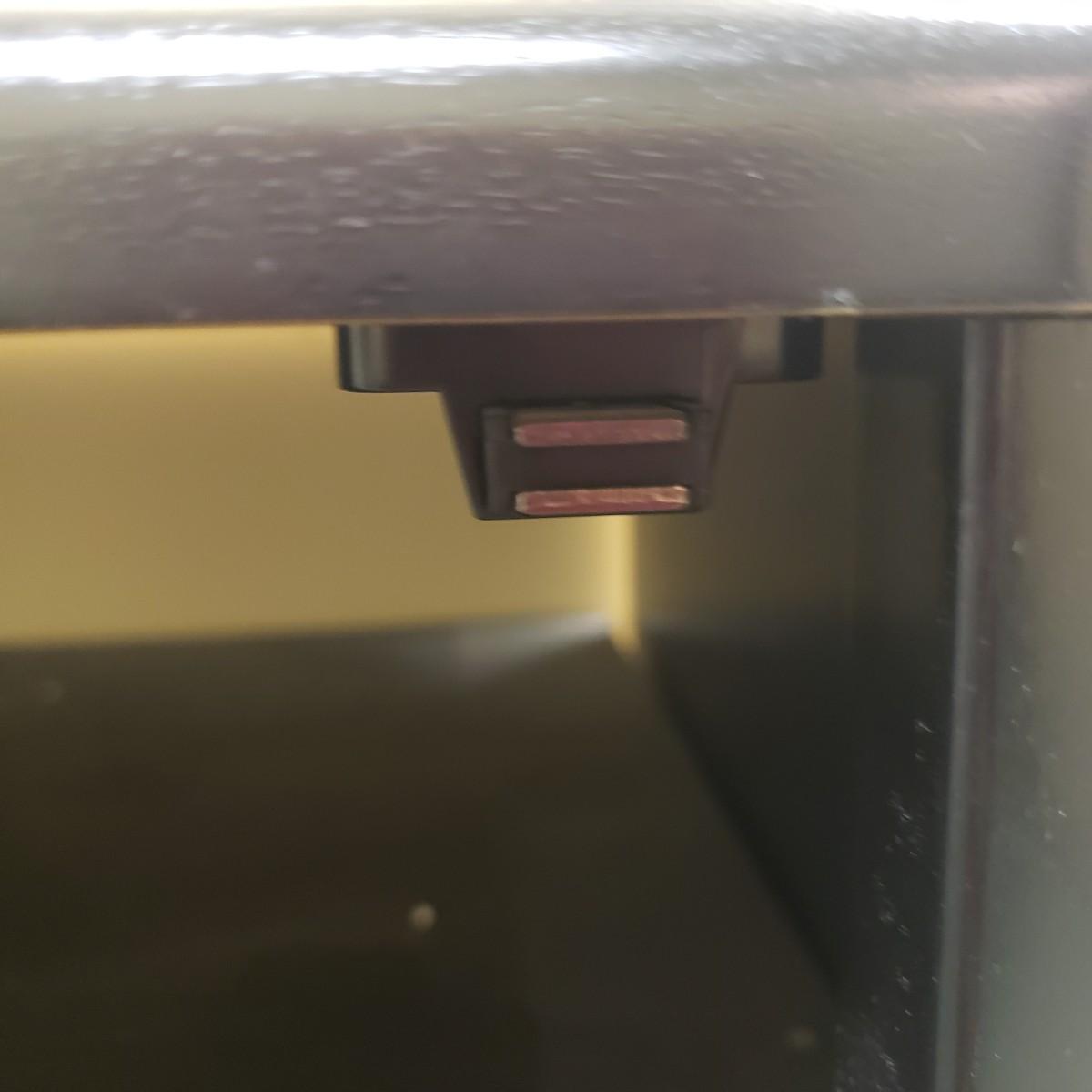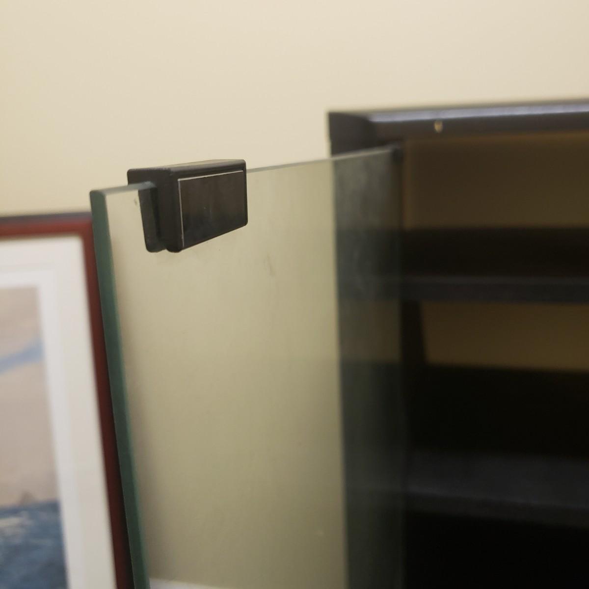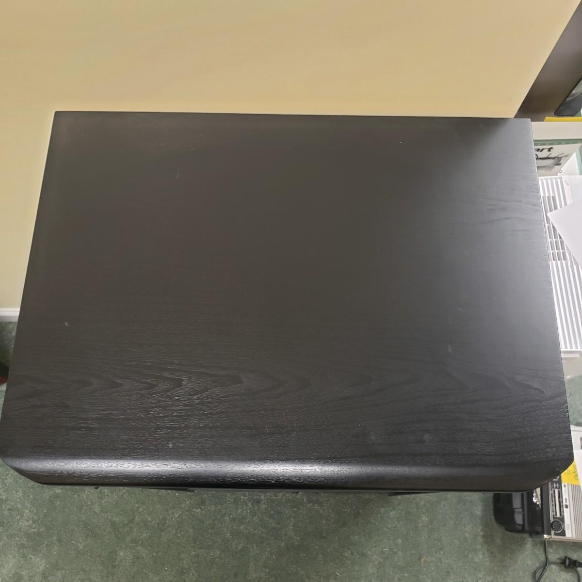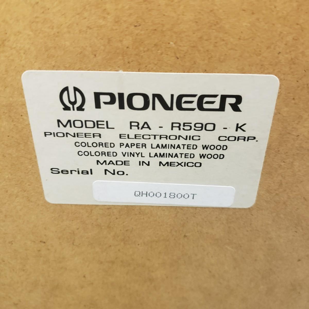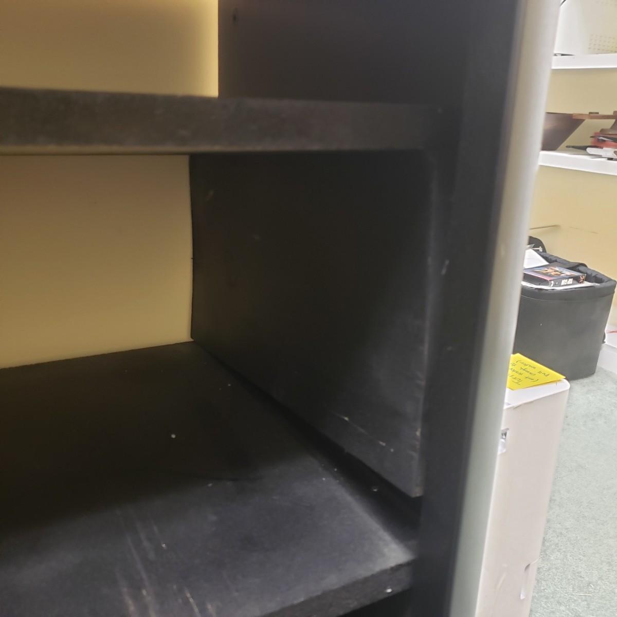 This is a Pioneer black stereo cabinet measureing 22" x 16" x 35"H. It has a glass door with a magnet closer. The bottom shelf appears original and the top two appear made, see picture. It has an open back for easy cord control. The cabinet is partical board that is laminated. The other two shelves are plywood.