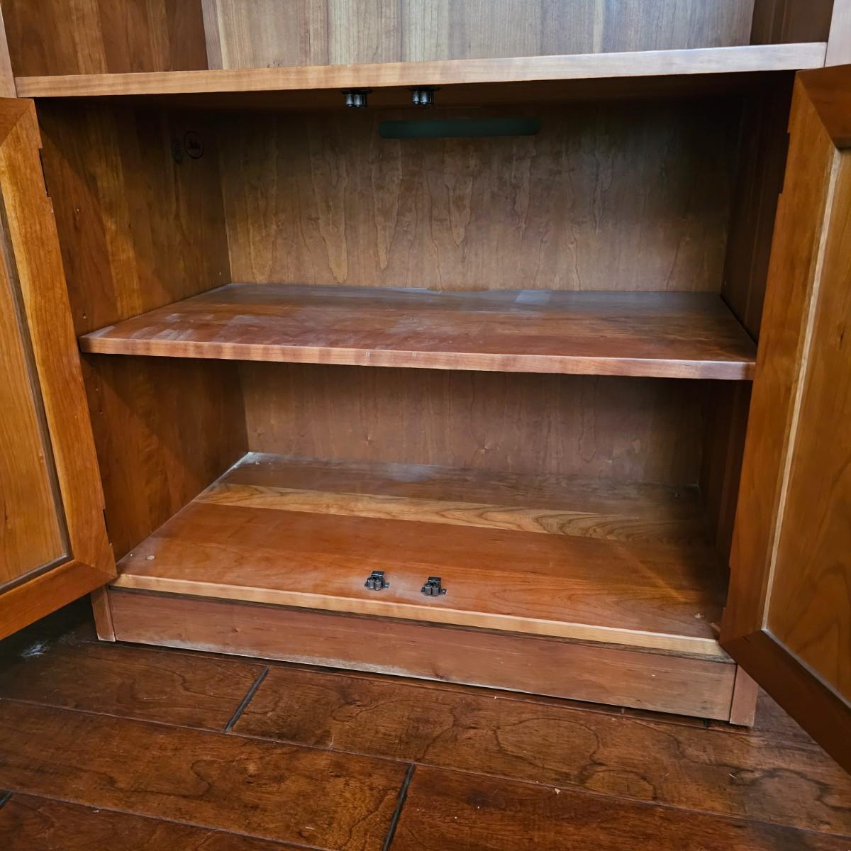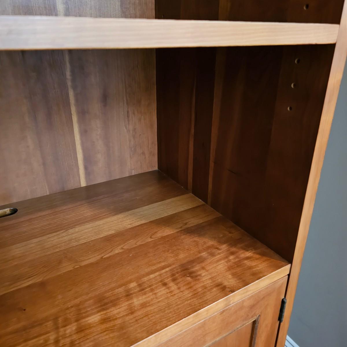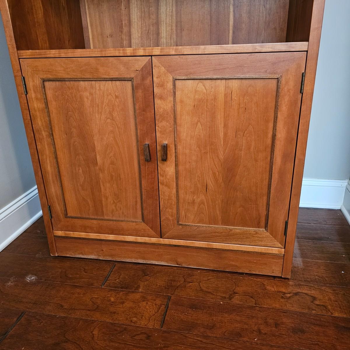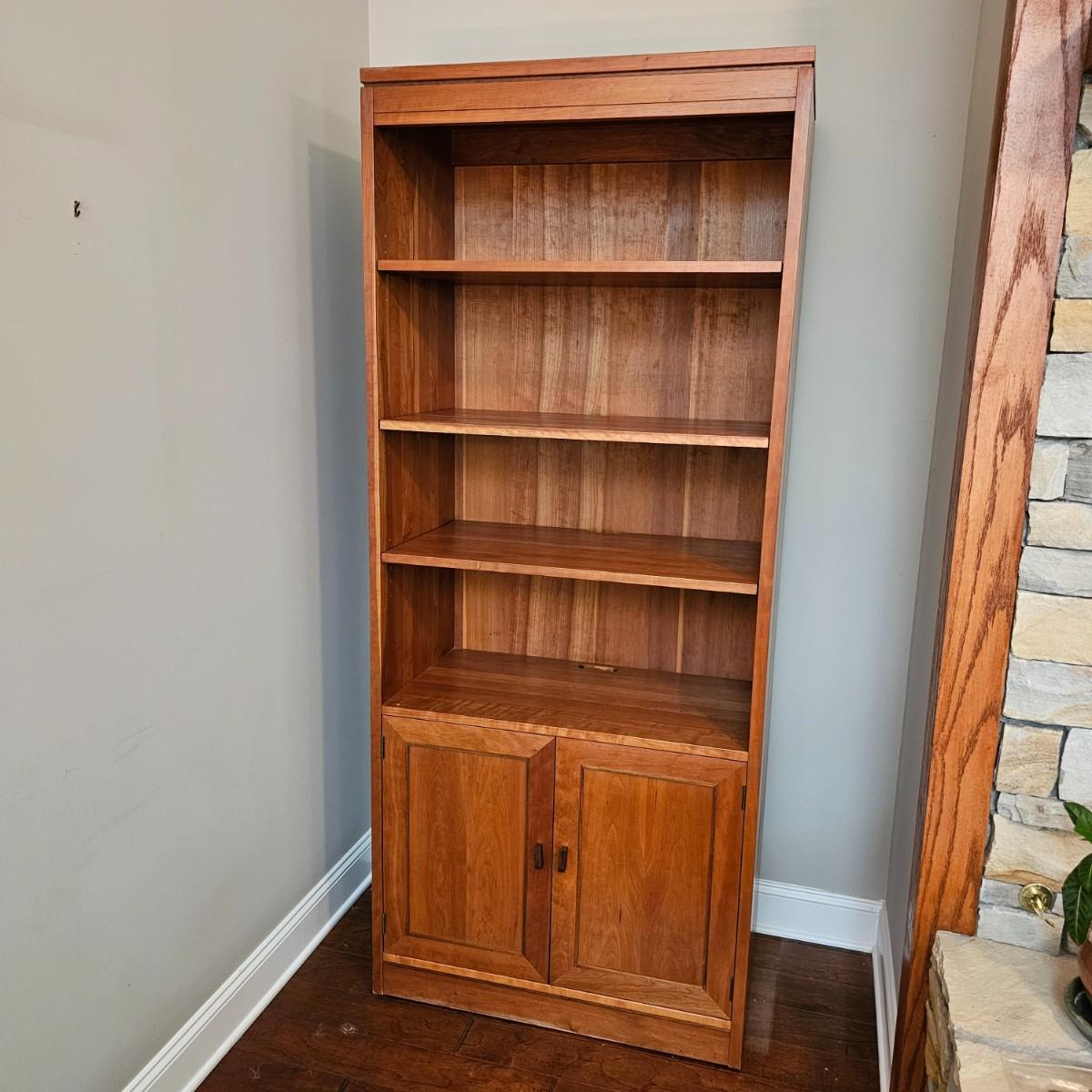 Solid wood cabinet with four adjustable shelves and a storage cabinet on the bottom. Back and two shelves have slots to run cables/power cords if needed. Unit measures 34" x 18" x 80.5"H. See photos for details. Local pickup only. Winning bidder must bring assistance to help move and load this item due to its weight and/or size. Item will need to be moved down three steps.
