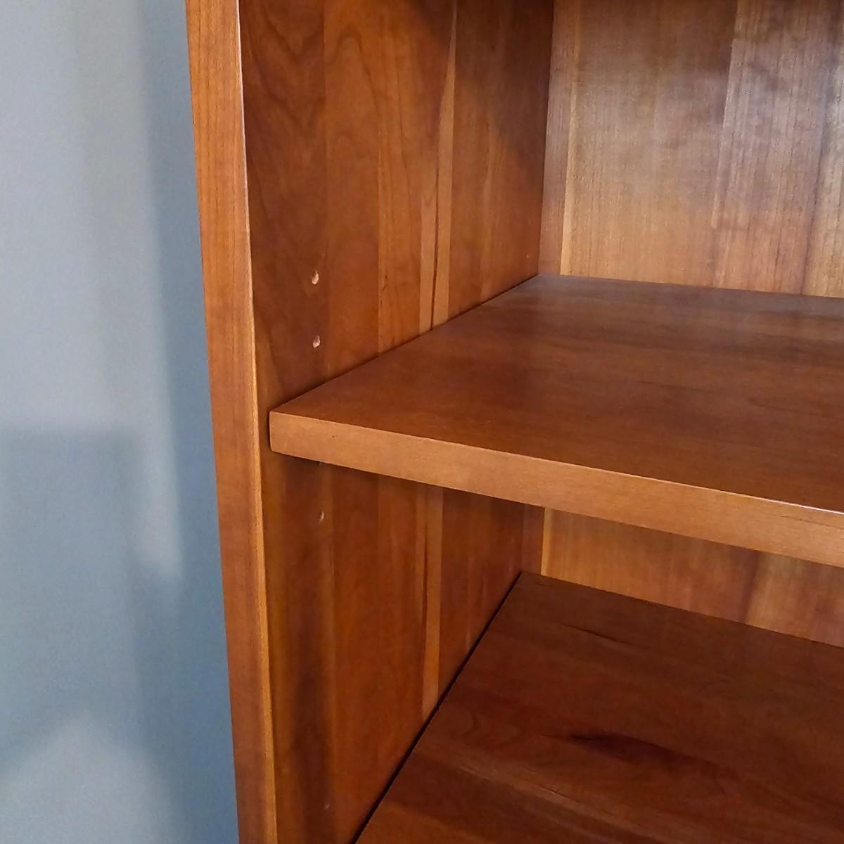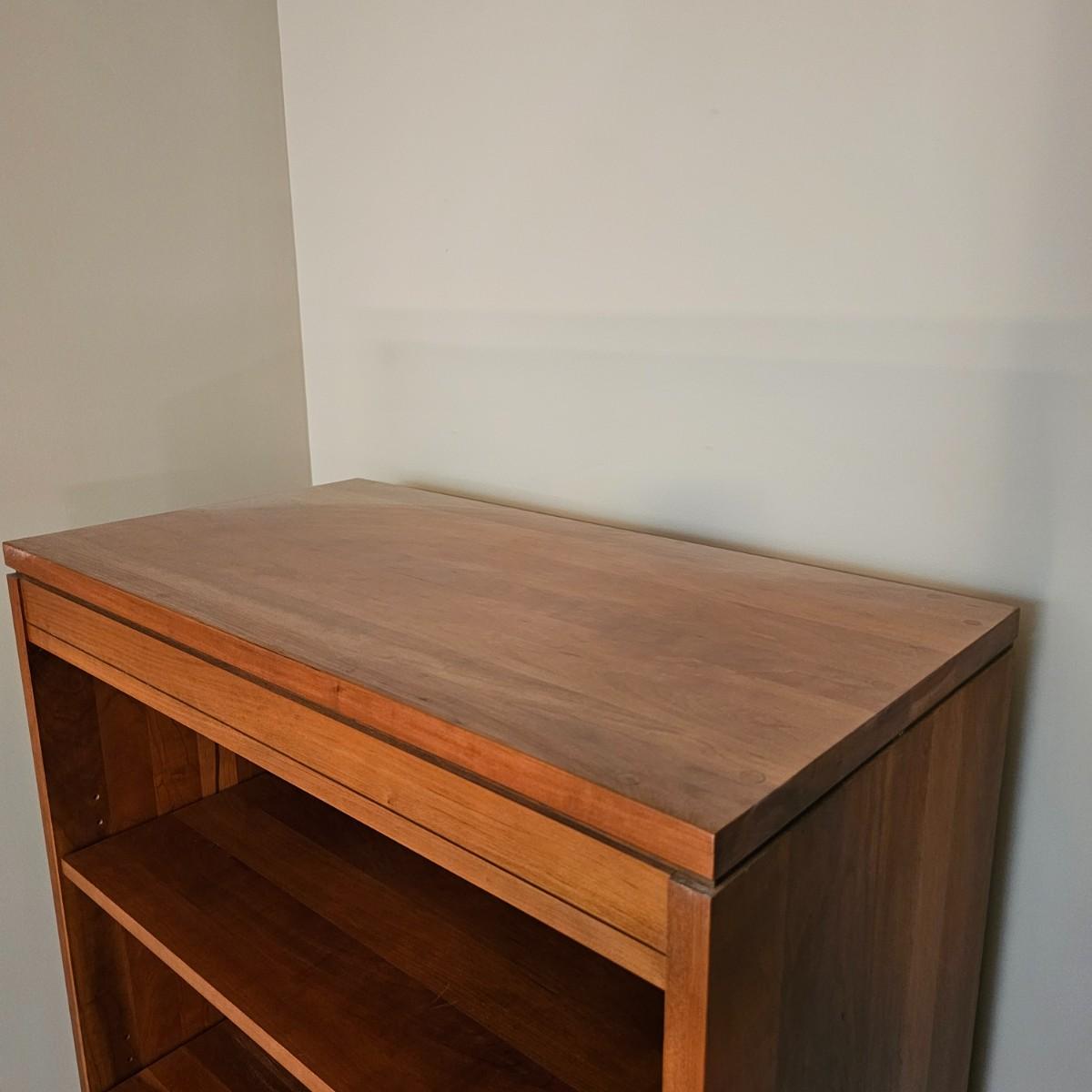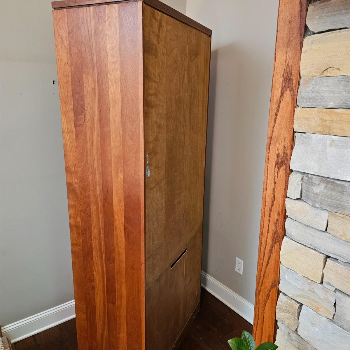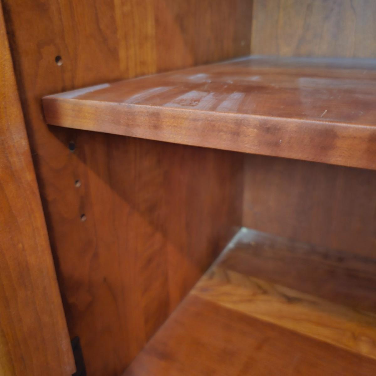 Solid wood cabinet with four adjustable shelves and a storage cabinet on the bottom. Back and two shelves have slots to run cables/power cords if needed. Unit measures 34" x 18" x 80.5"H. See photos for details. Local pickup only. Winning bidder must bring assistance to help move and load this item due to its weight and/or size. Item will need to be moved down three steps.