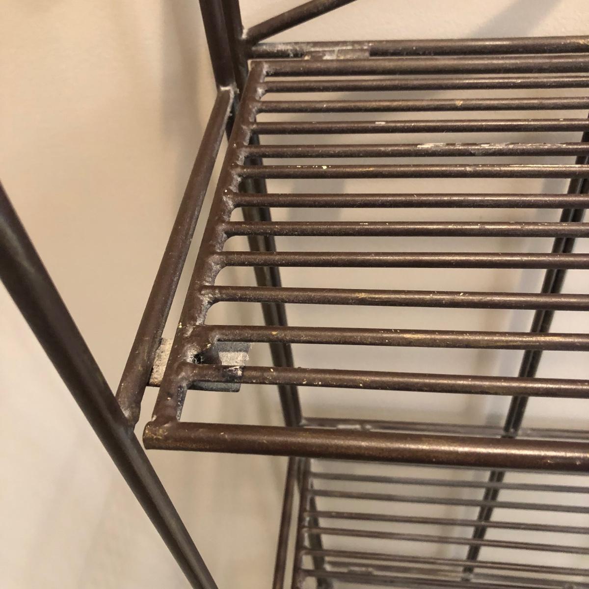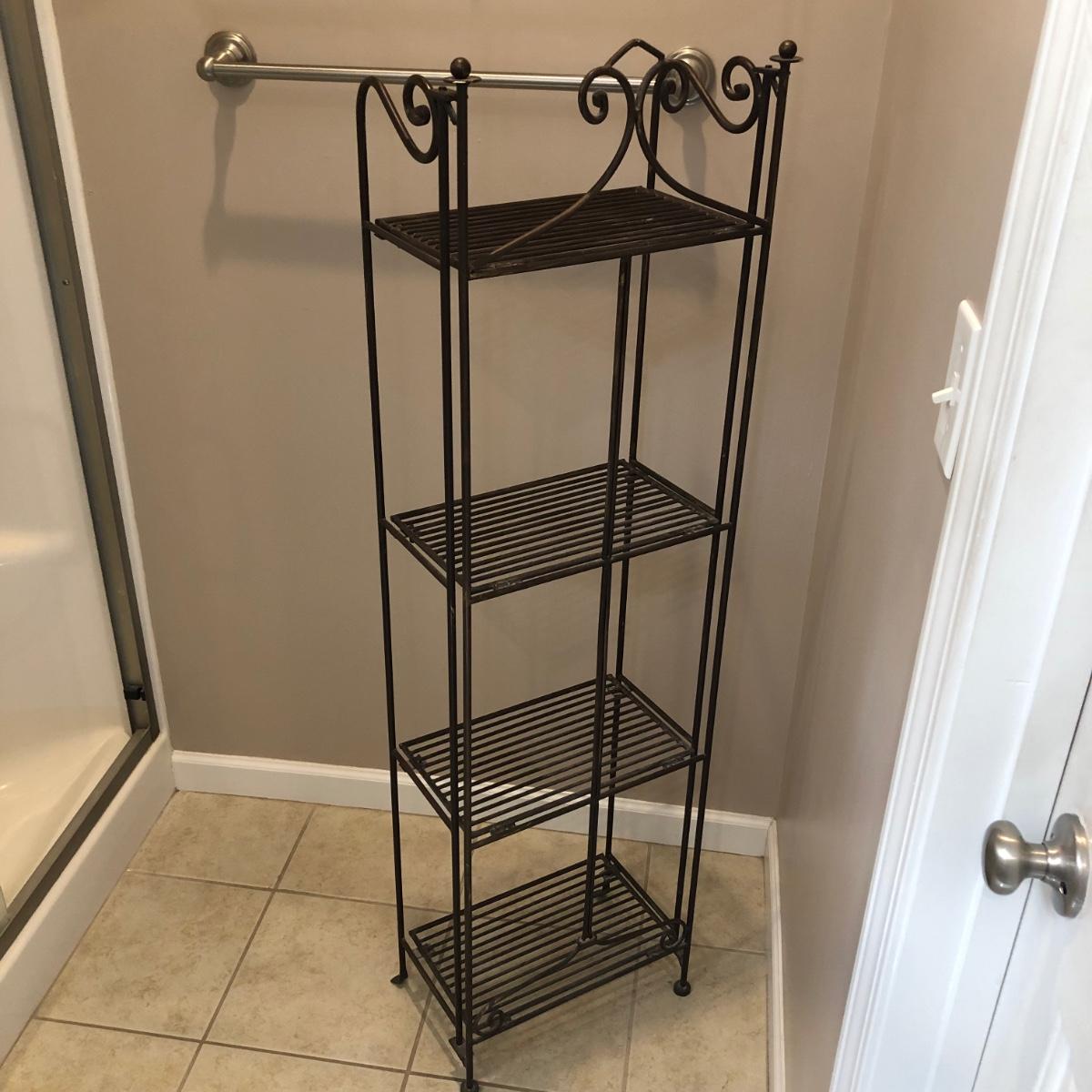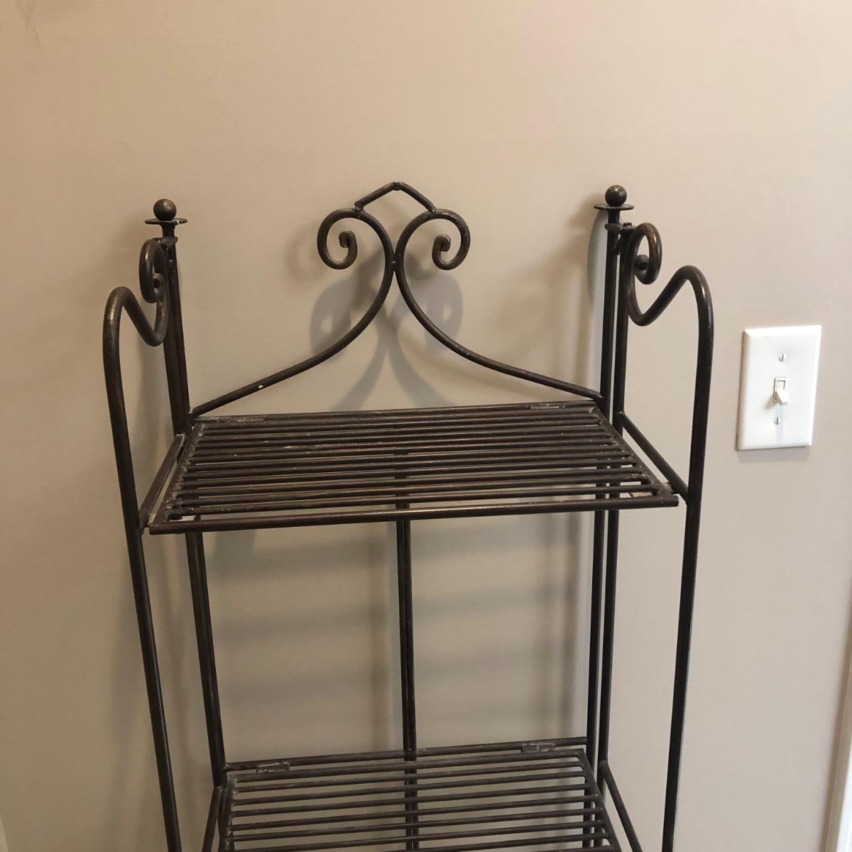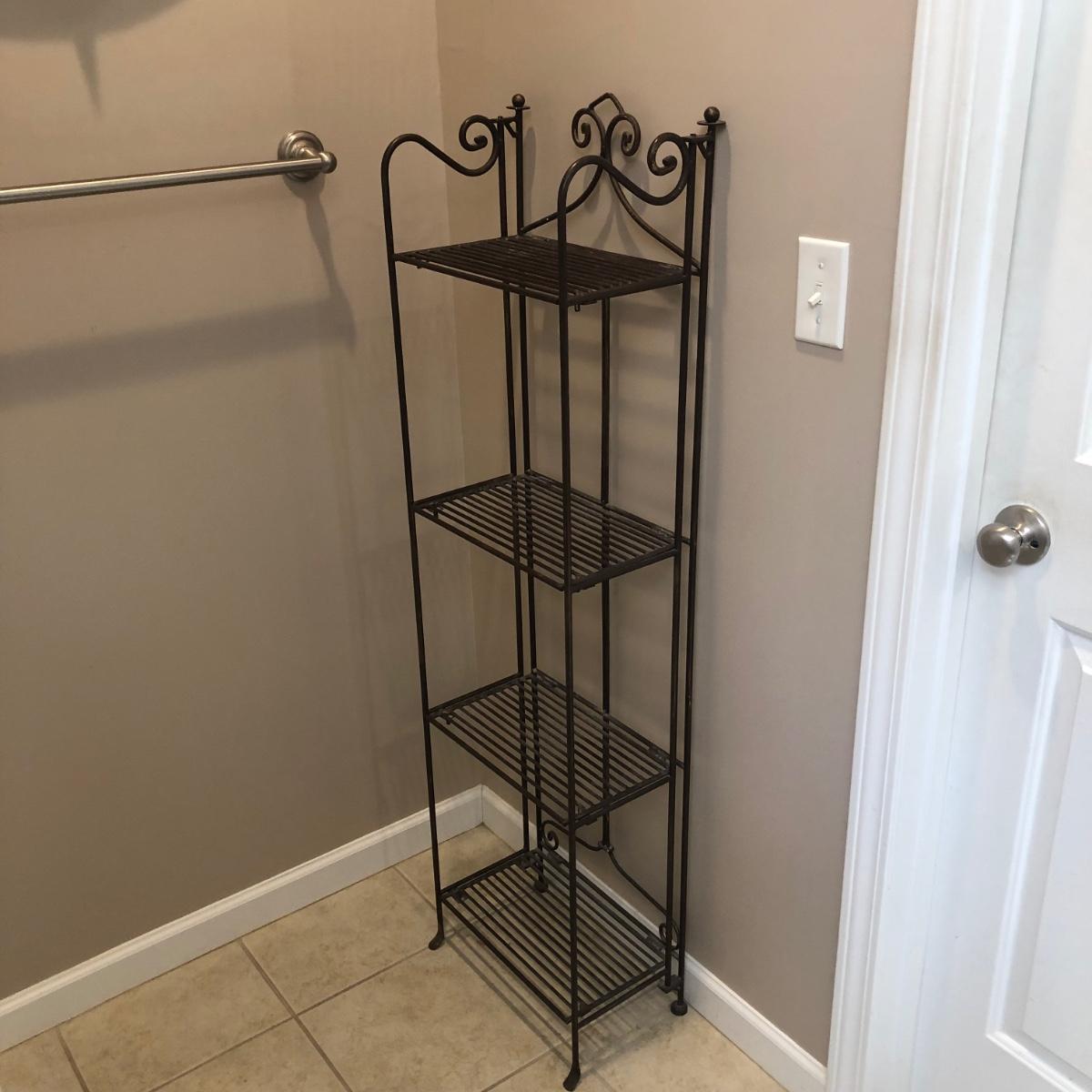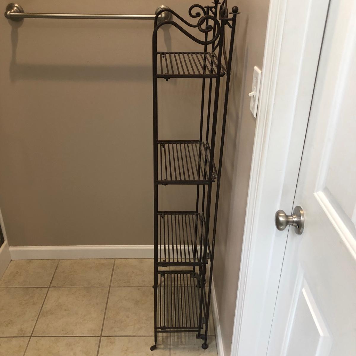 This folding four shelf unit is all metal and a copper brown color. It is sturdy and measures almost 15” x 9” x 53”. Local pick up only.
