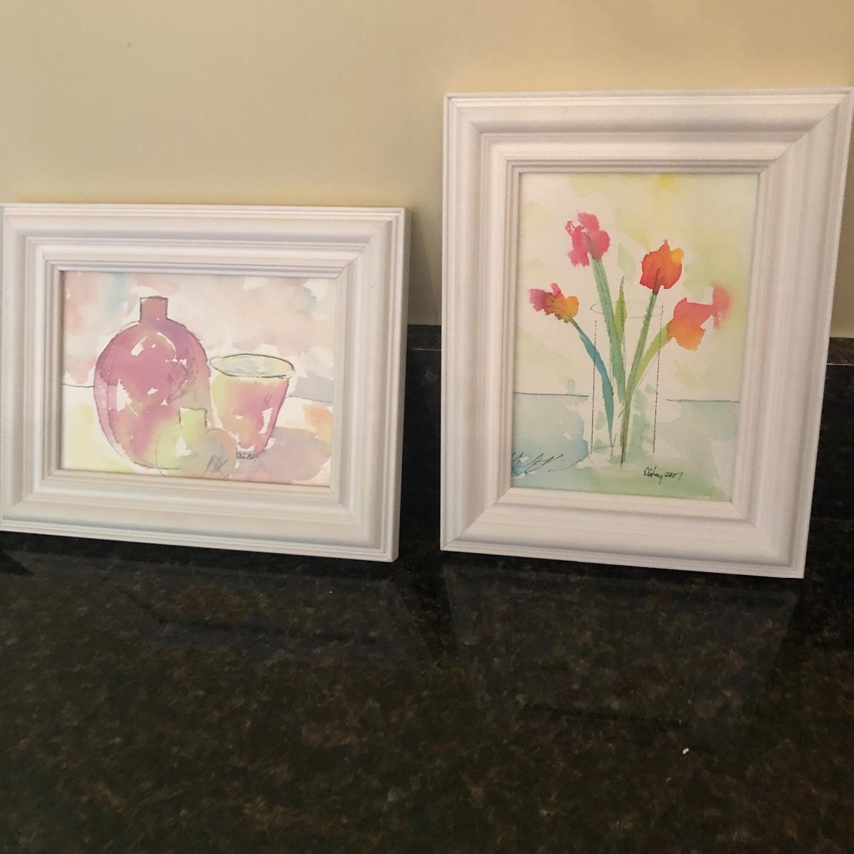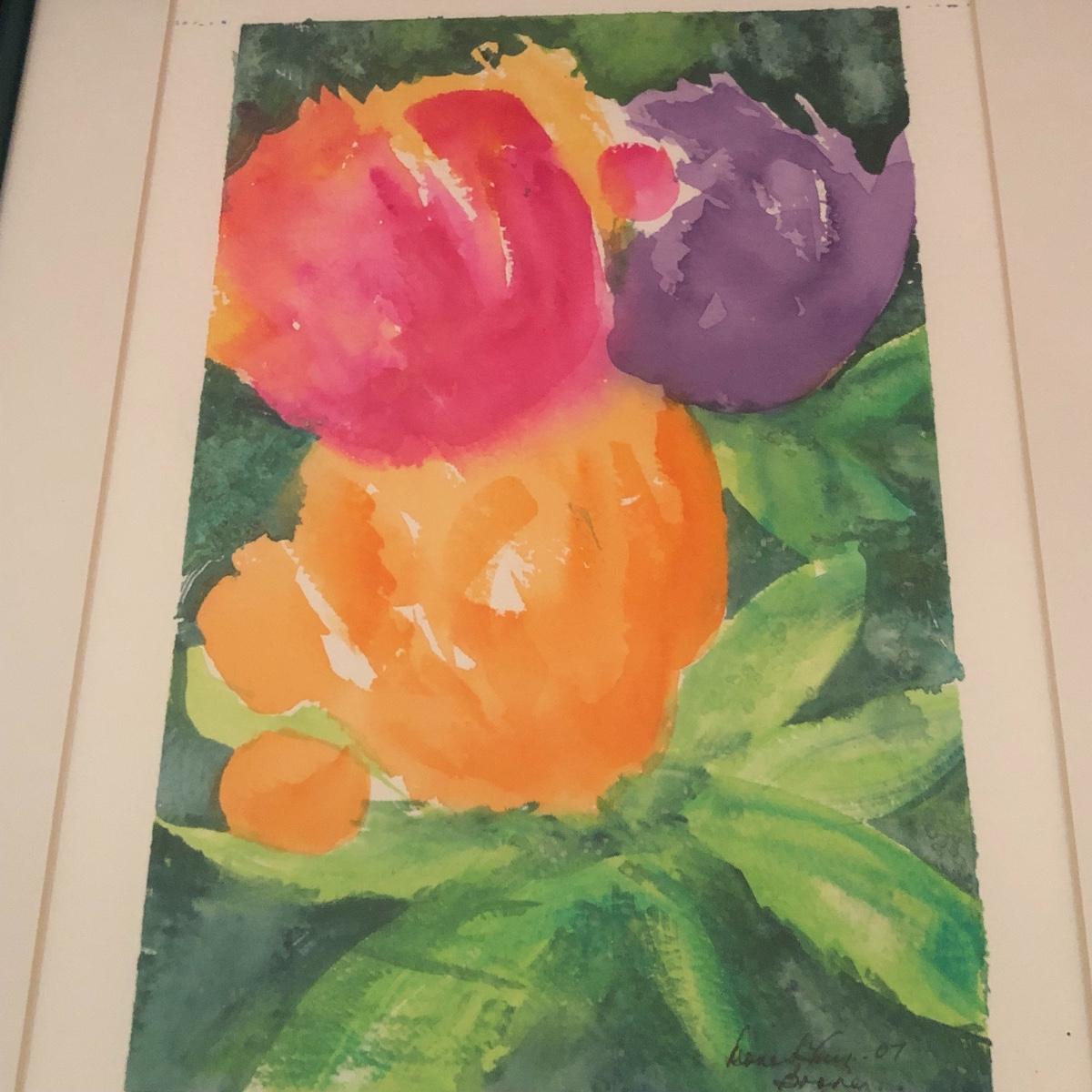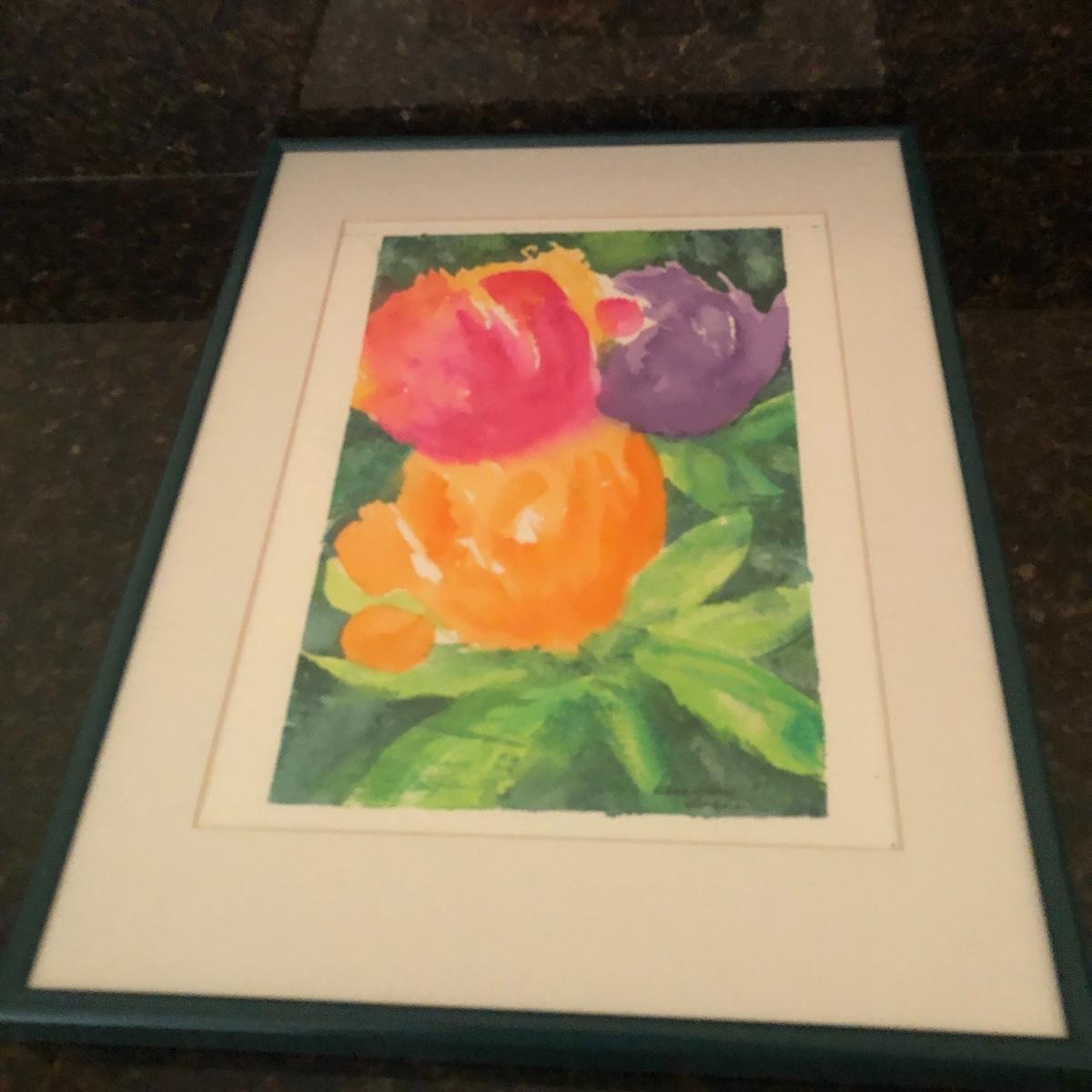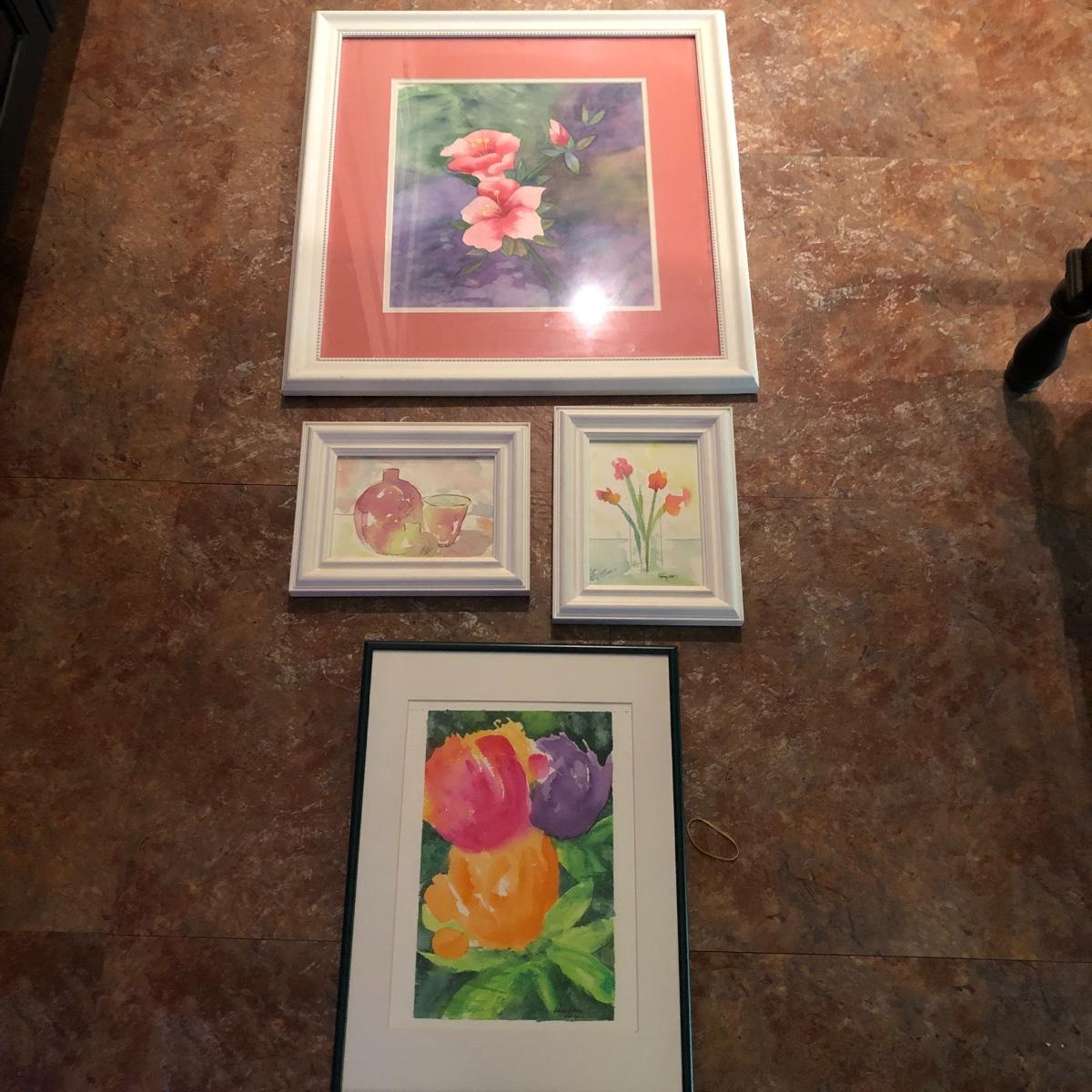 This lot contains four watercolors. The two smaller watercolors in the white frames approximately measures 7.5” x 10” and 10” x 7.5”. Note signature and date of 2007. The flowers in the green metal frame measures 12.5” x 16”. Note signature in the lower right corner. The last watercolor measures 21.5” x 20.5”. Shipping Available.