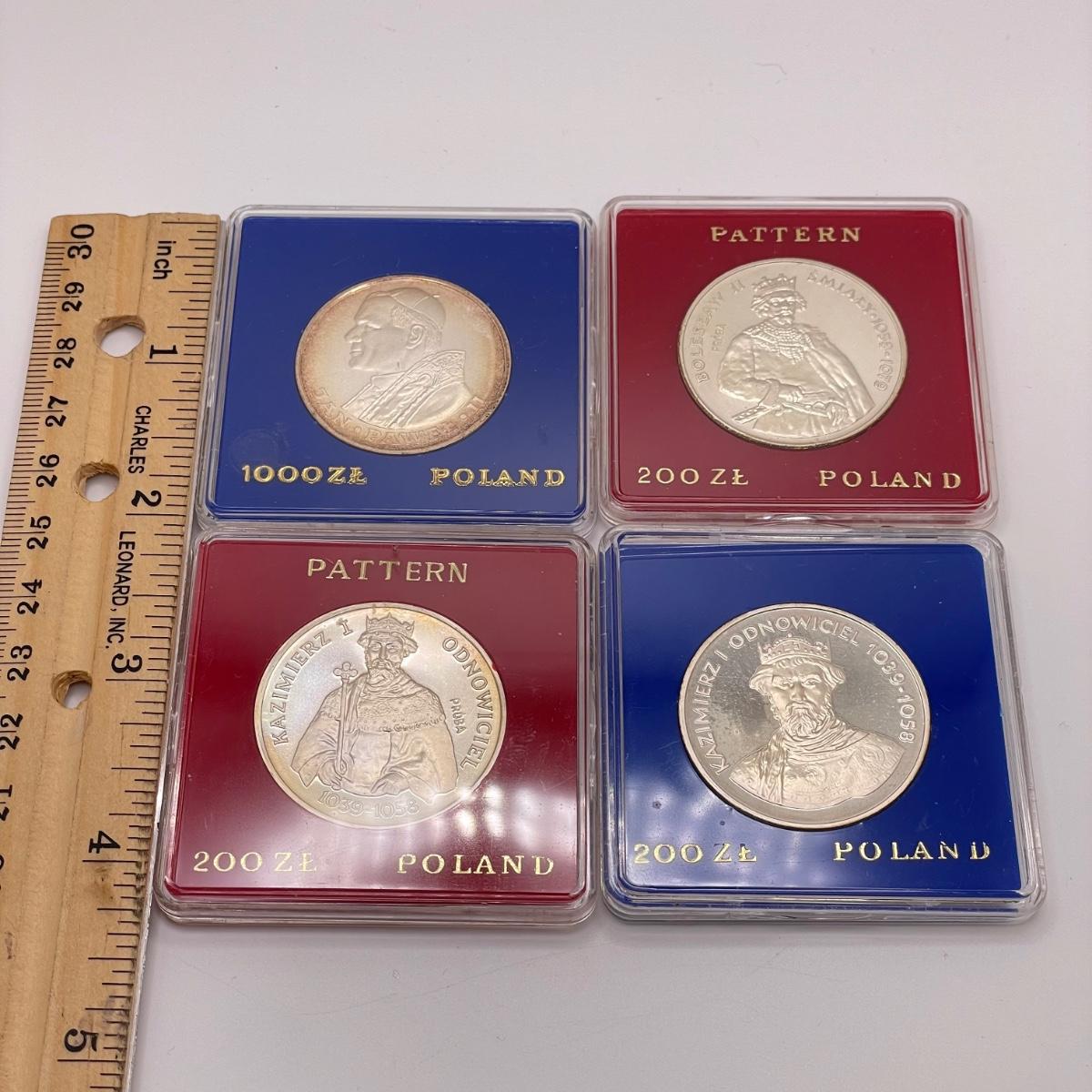 Four silver Polish coins, housed in plastic and appear uncirculated. All sales are final. No returns or refunds. Please bid accordingly. Shipping available.