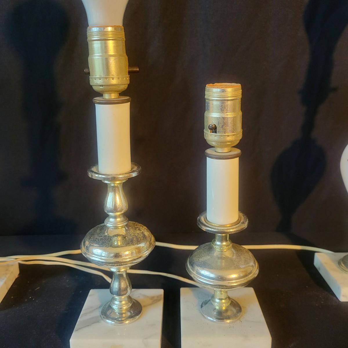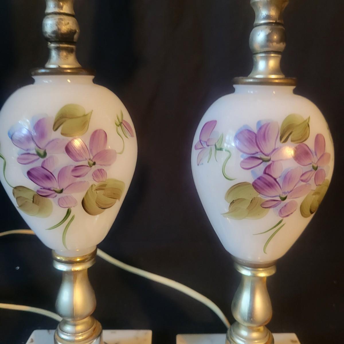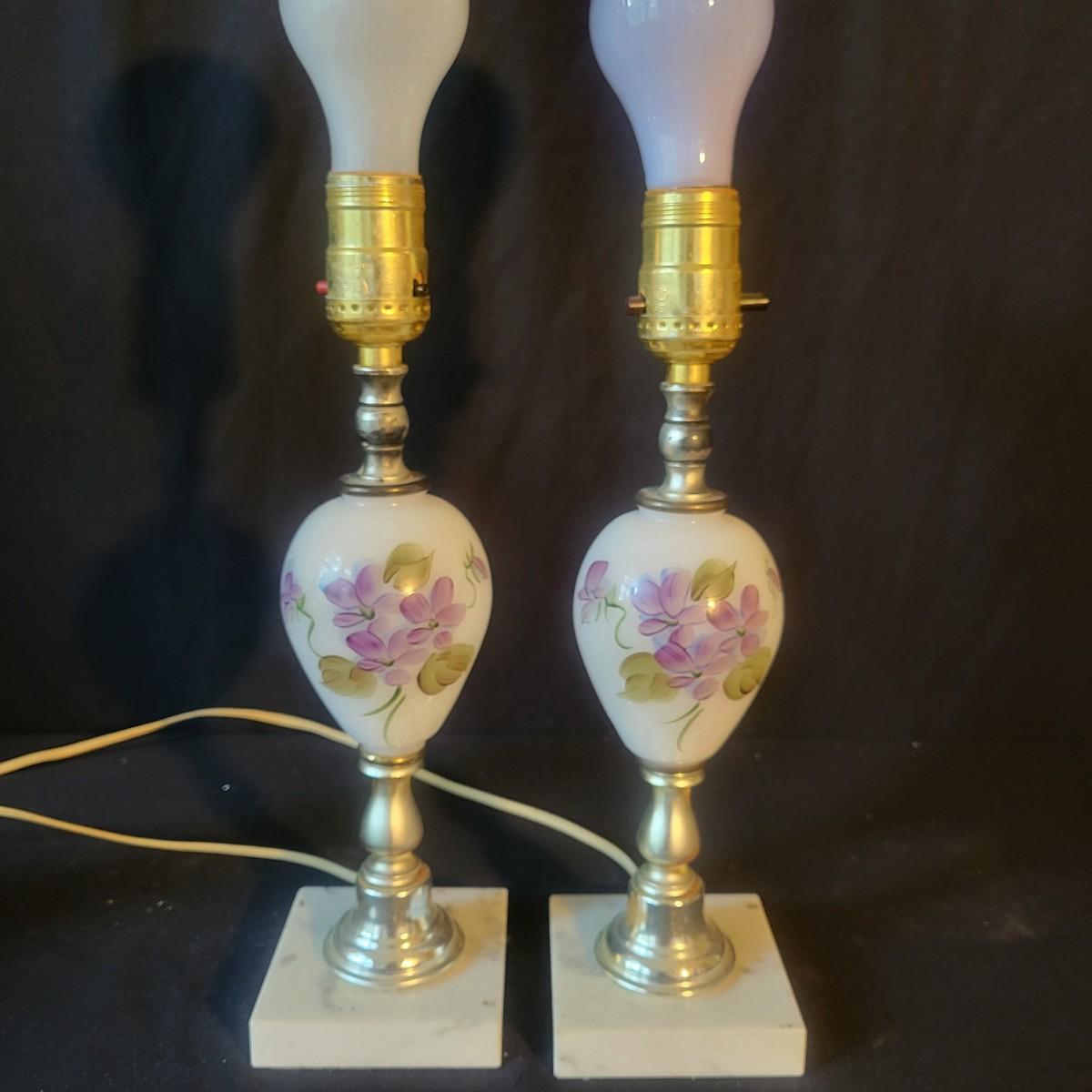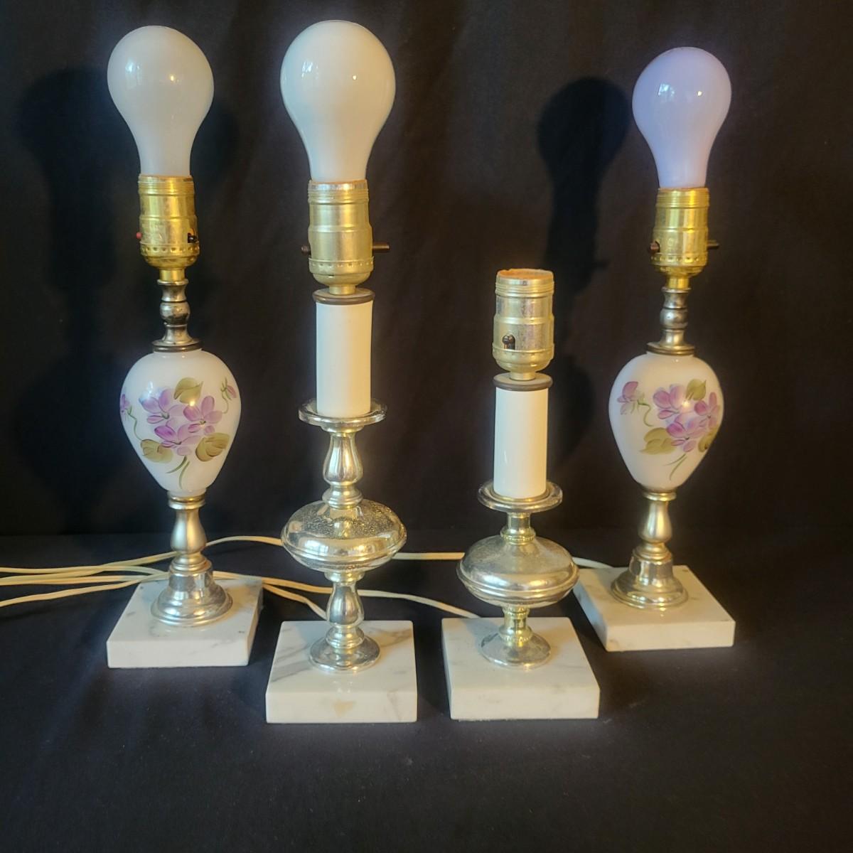 Four small lamps with marble bases and silver metal stems in good condition. All lamps were tested and work. Two lamps also have a glass accent with a design of violets painted on them. Largest lamp measures approximately 3.5" x 15.5" Local pickup only