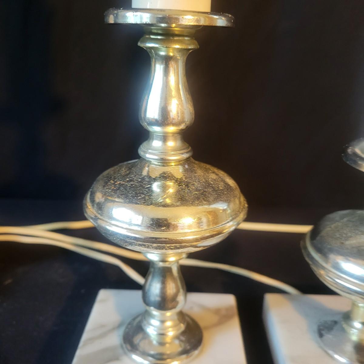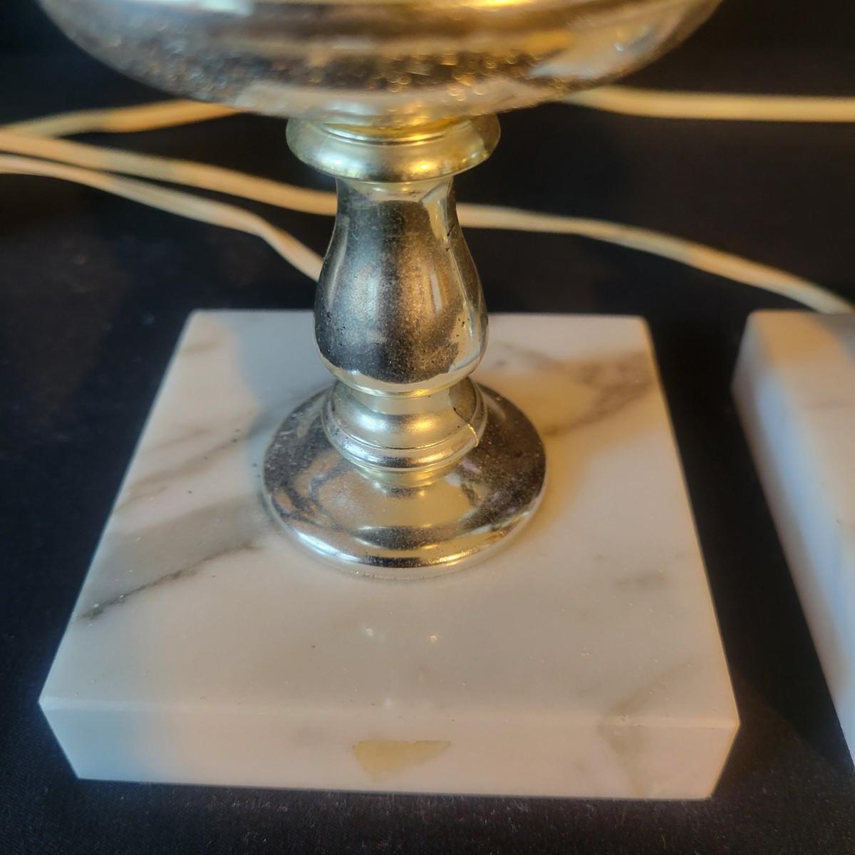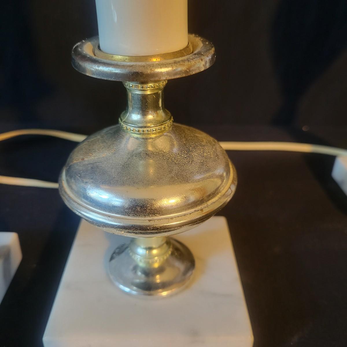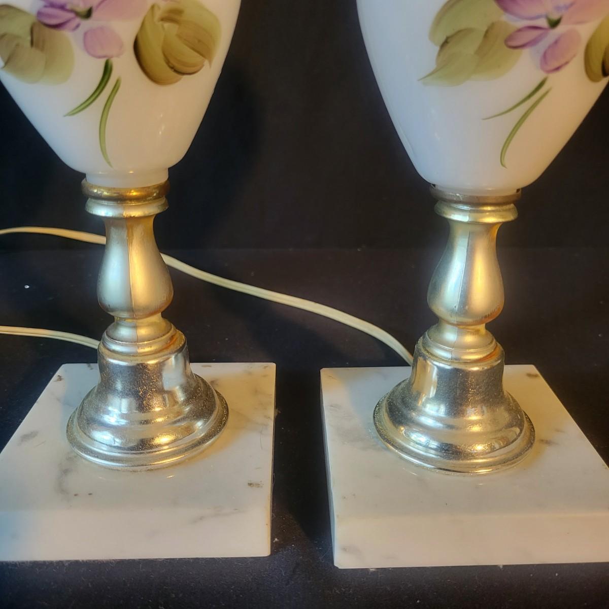 Four small lamps with marble bases and silver metal stems in good condition. All lamps were tested and work. Two lamps also have a glass accent with a design of violets painted on them. Largest lamp measures approximately 3.5" x 15.5" Local pickup only