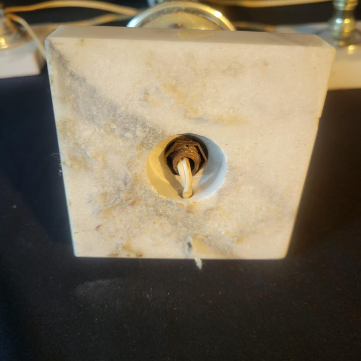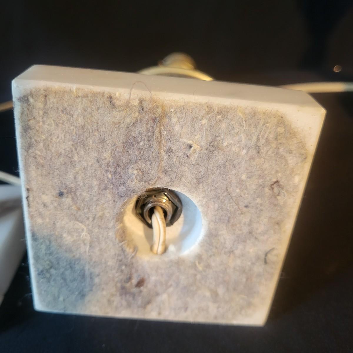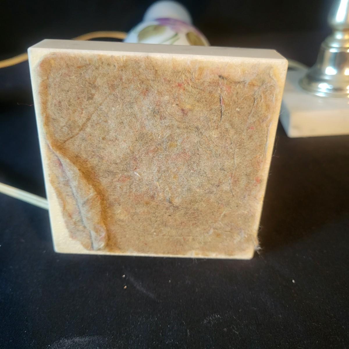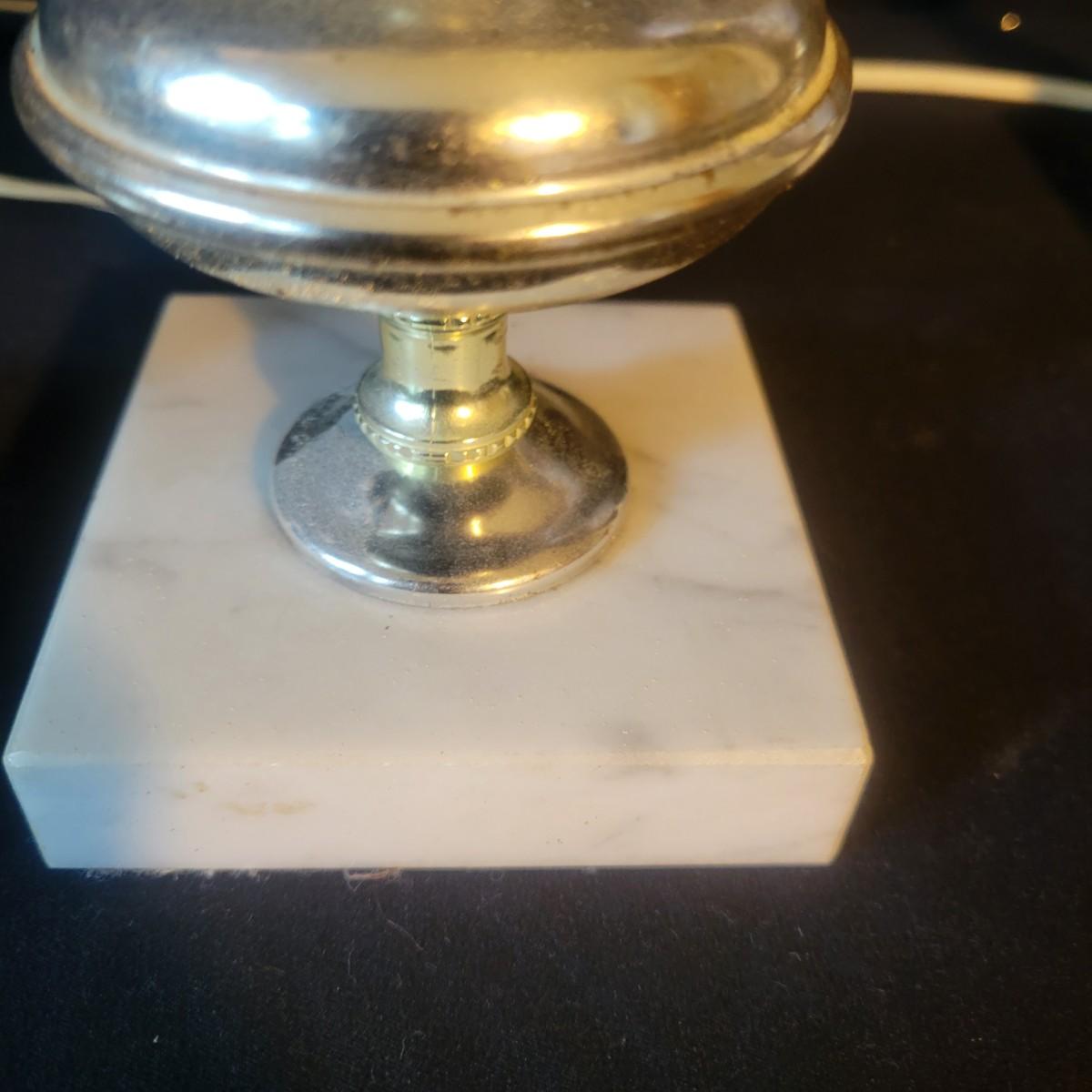 Four small lamps with marble bases and silver metal stems in good condition. All lamps were tested and work. Two lamps also have a glass accent with a design of violets painted on them. Largest lamp measures approximately 3.5" x 15.5" Local pickup only