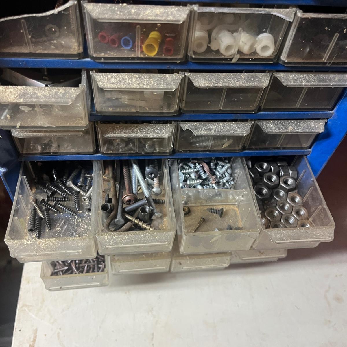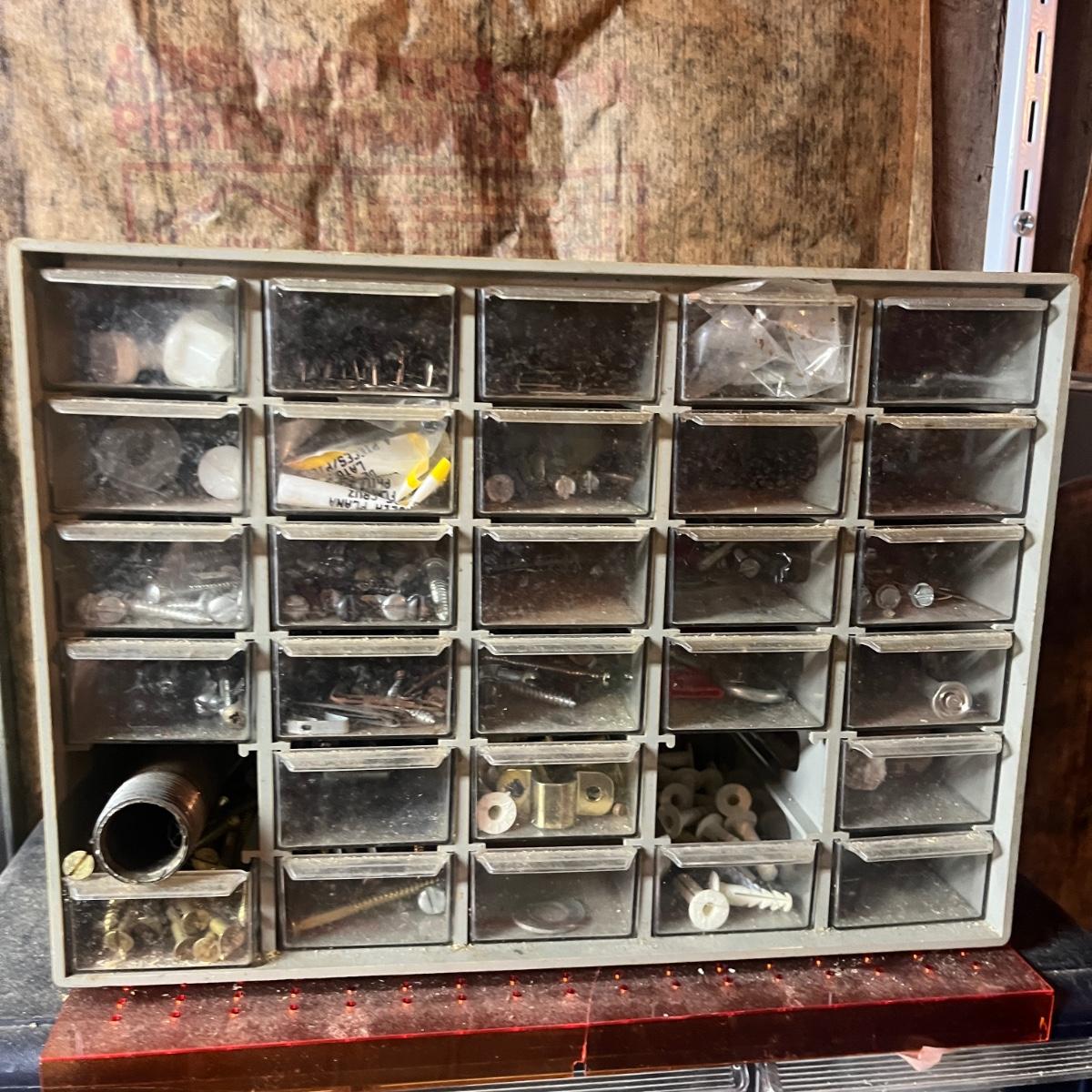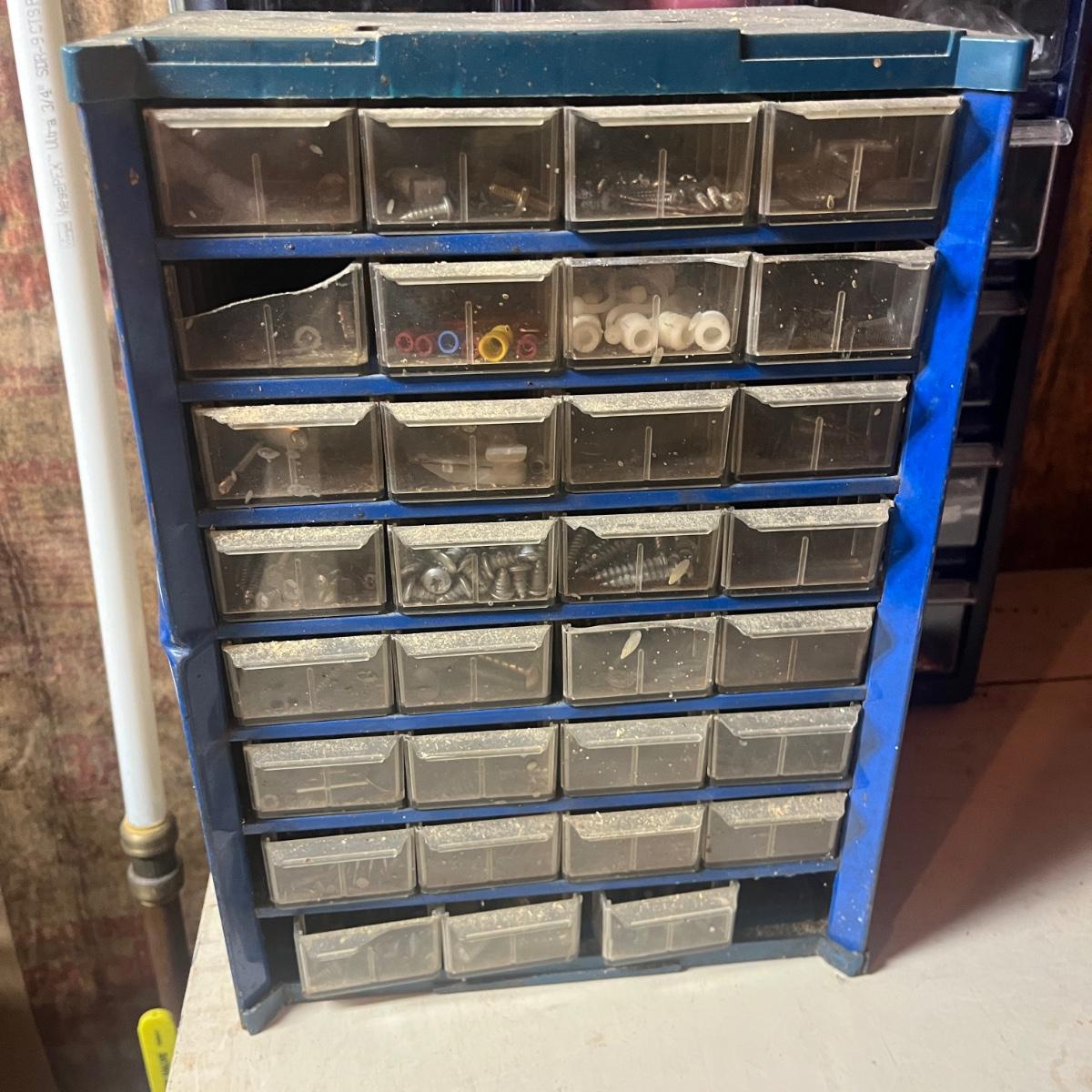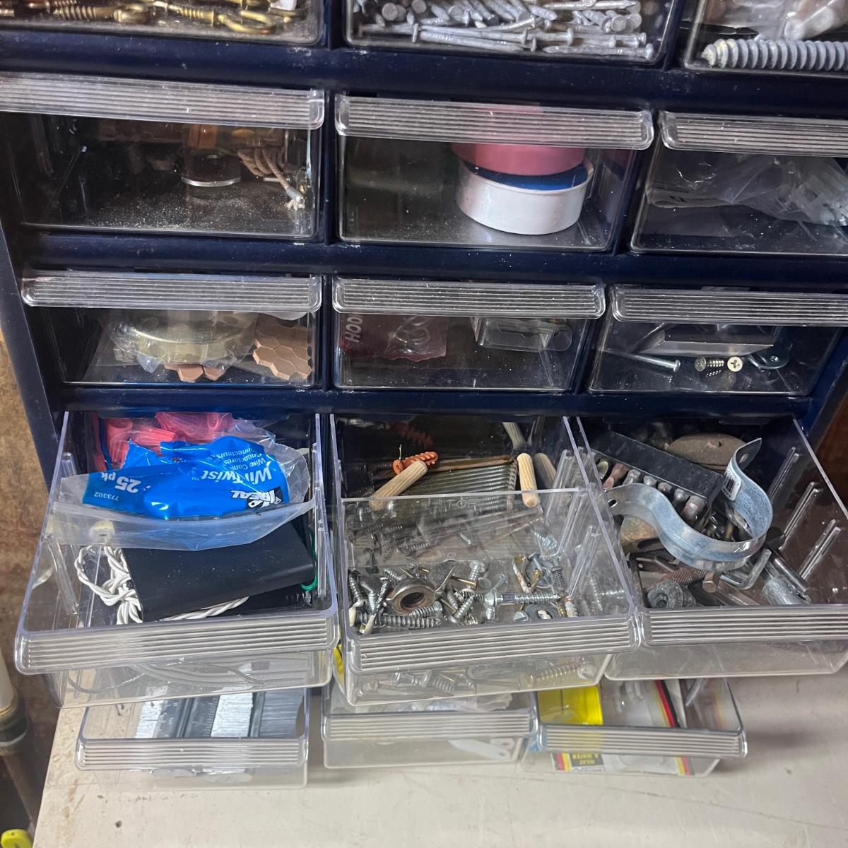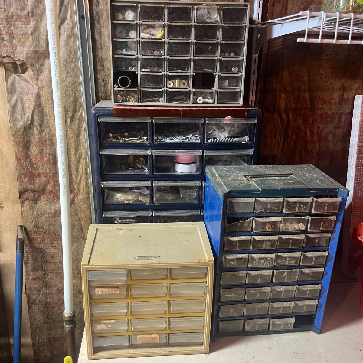 Lot includes three plastic small parts cabinets with contents and one metal small parts cabinet with contents. Contents are screws, nuts, bolts, anchors, nails and more. Largest cabinet measures 15” x 7” x 18”H.