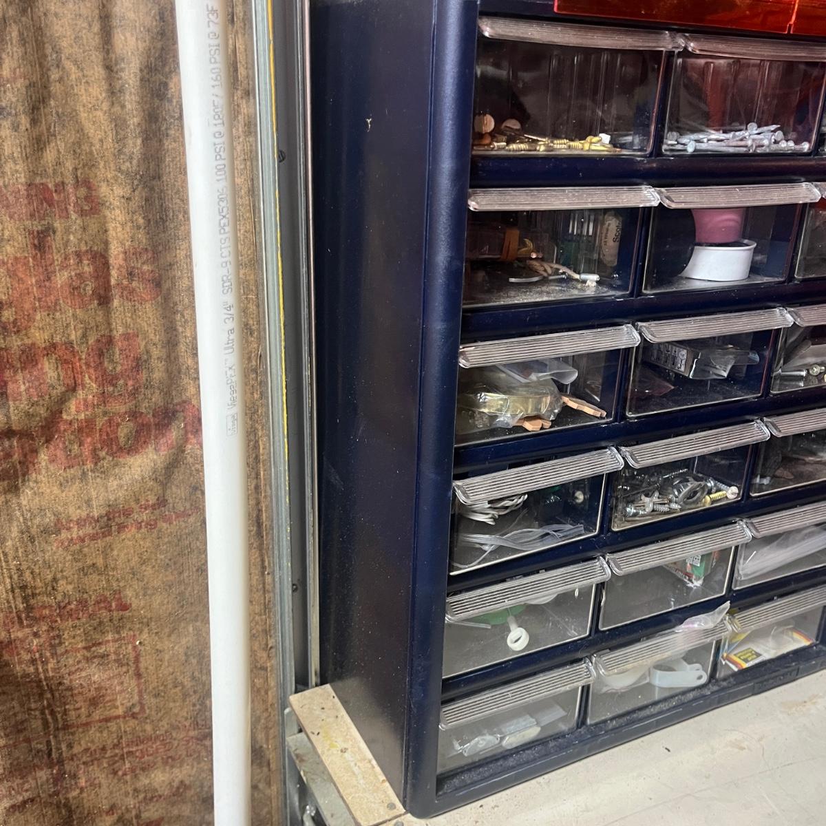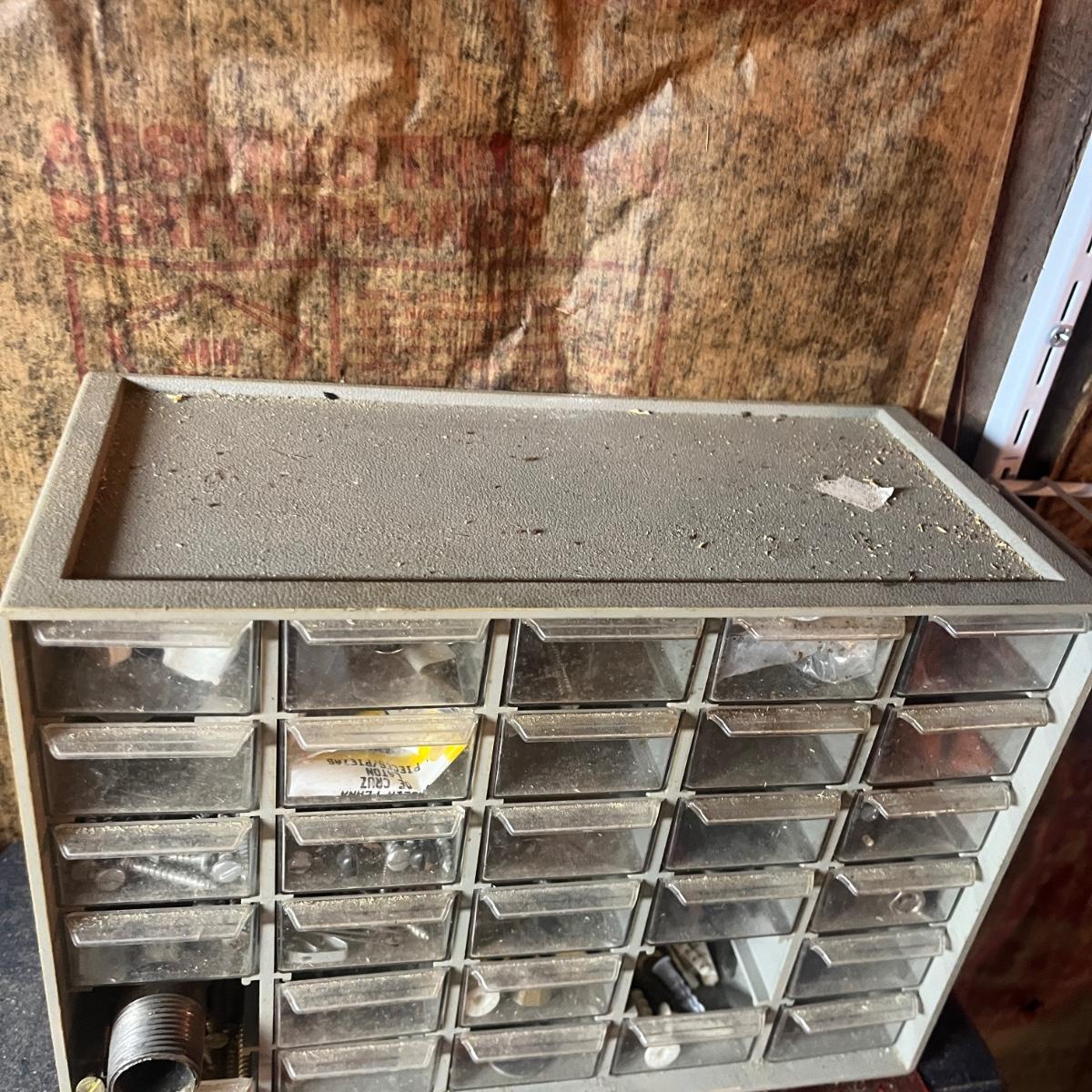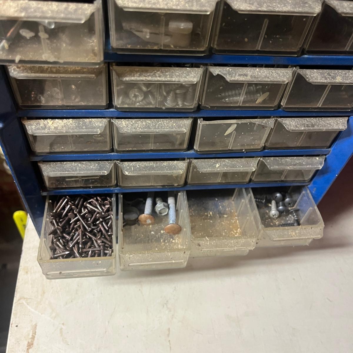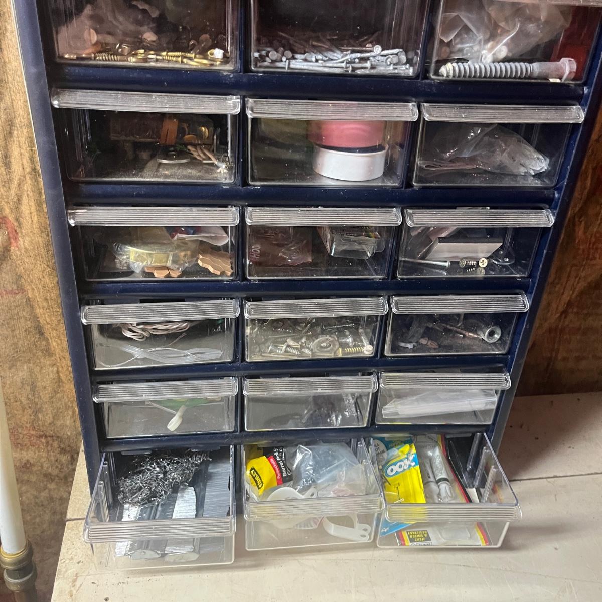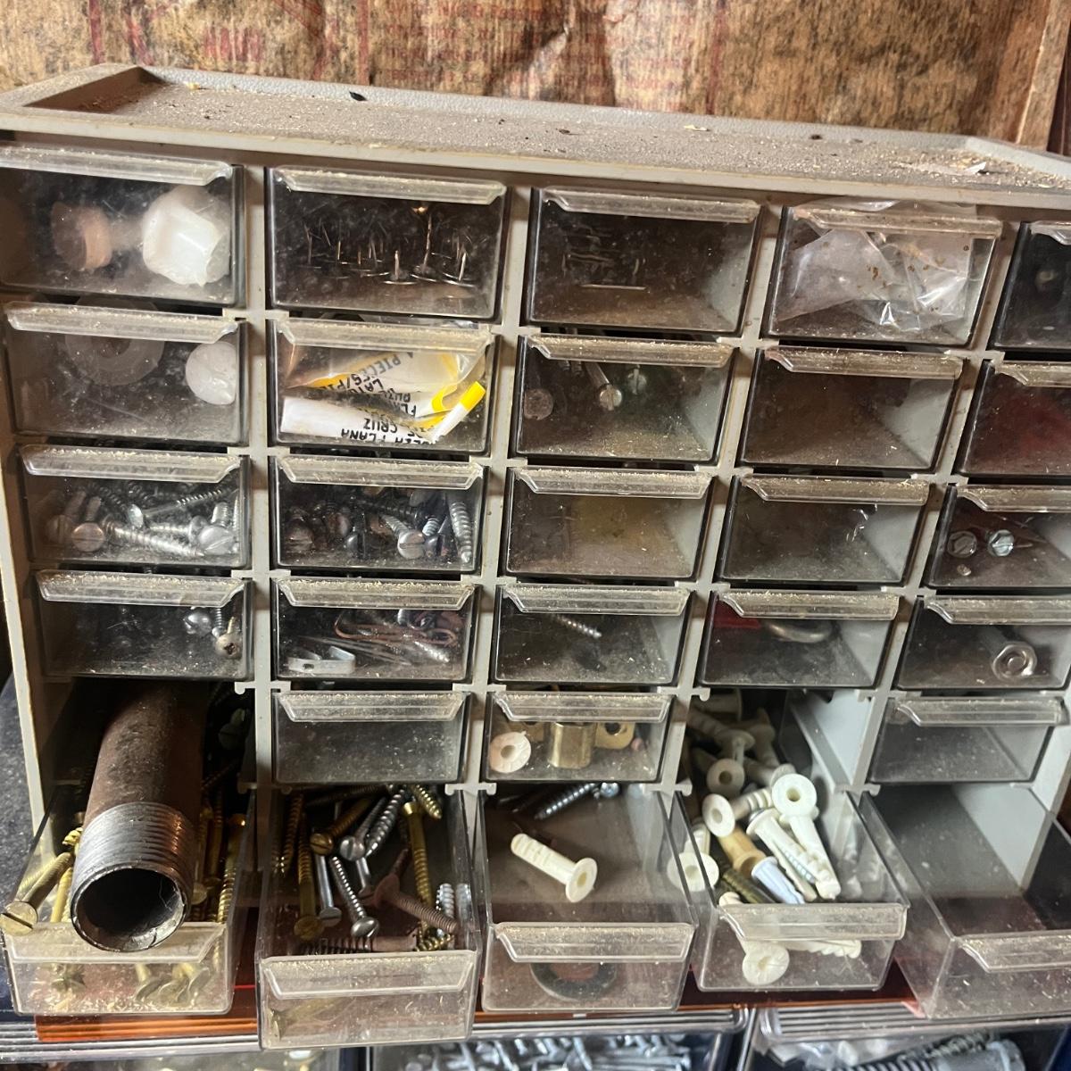 Lot includes three plastic small parts cabinets with contents and one metal small parts cabinet with contents. Contents are screws, nuts, bolts, anchors, nails and more. Largest cabinet measures 15” x 7” x 18”H.