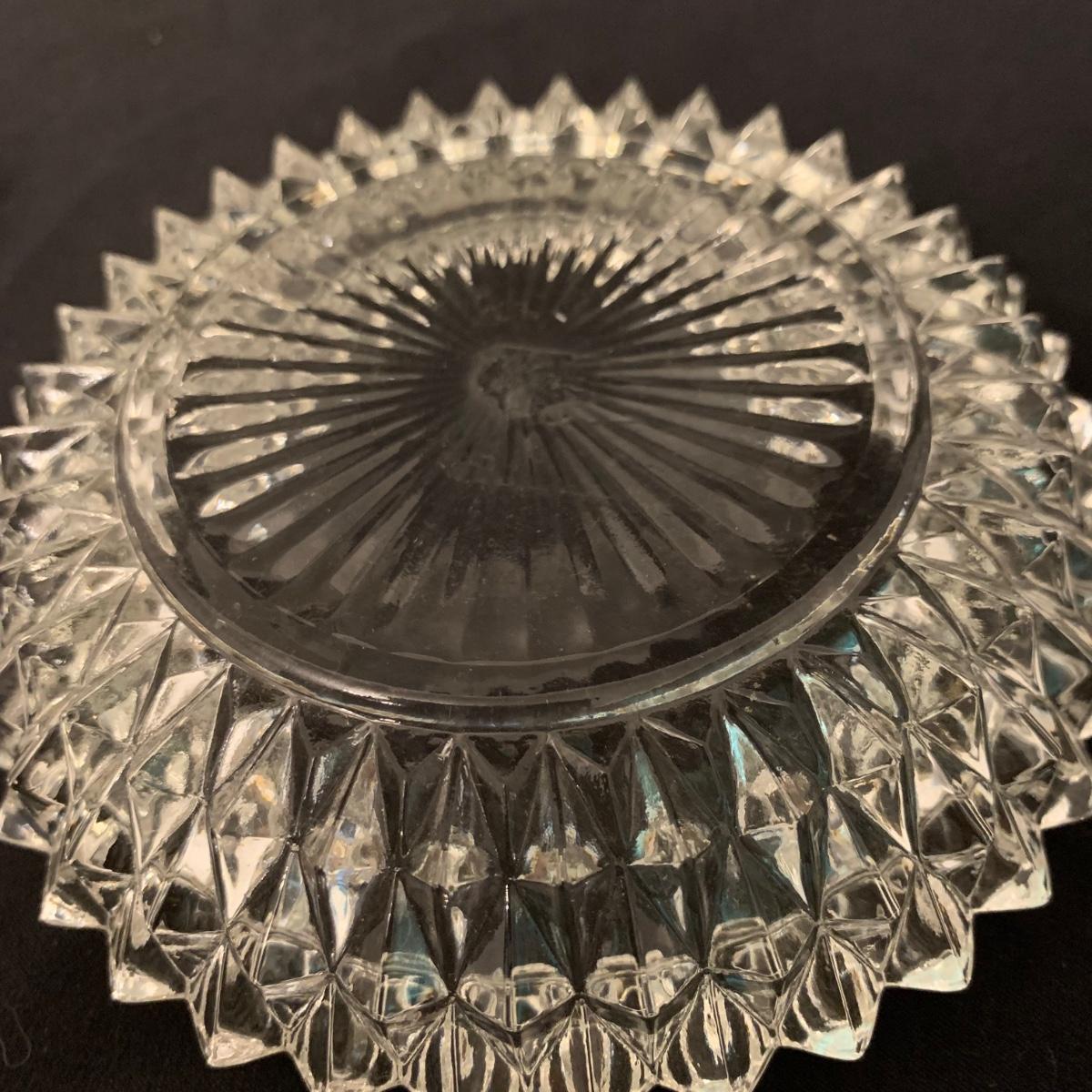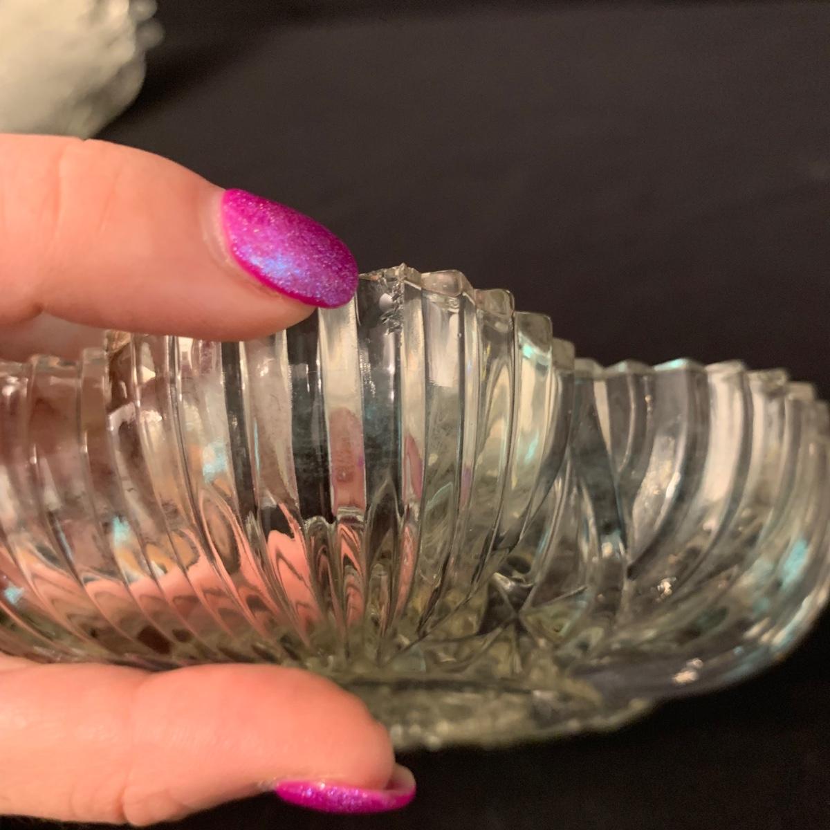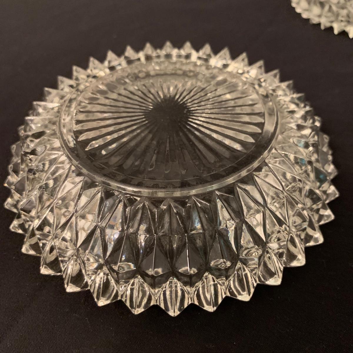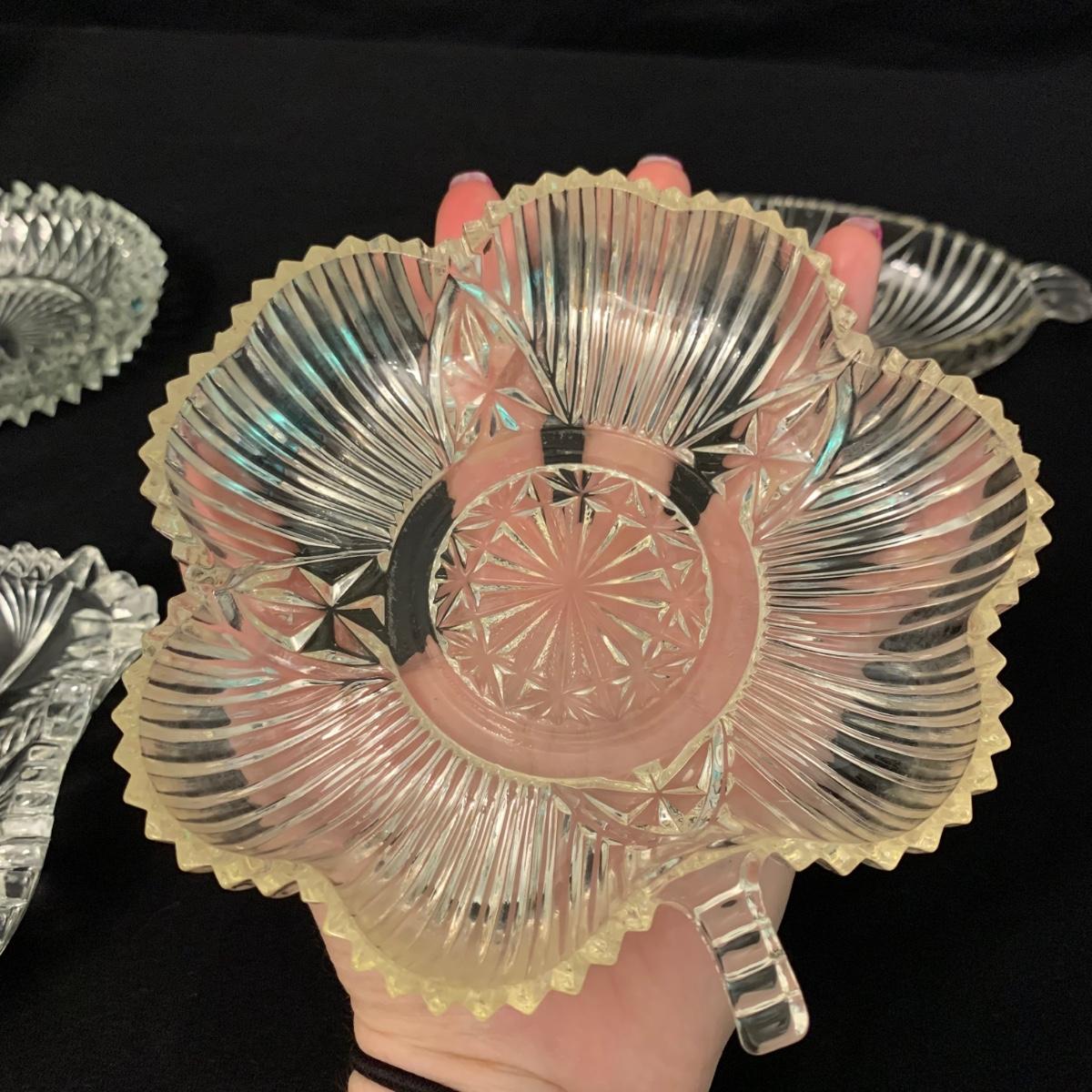 Four small sets of small dishes. All appear to be formed glass. One set of two clover shaped dishes, one set of two rectangular dishes, one set of four oval dishes, and one set of four round ashtrays that could instead be used as candy dishes if desired. Photos with hand are for size reference. Items appear to be in good condition. The clover dishes are in fair condition with one having a small chip and the other with a bit of cloudiness. Oval dishes measure 4” x 9”. Shipping available.