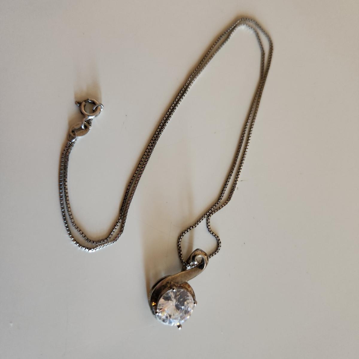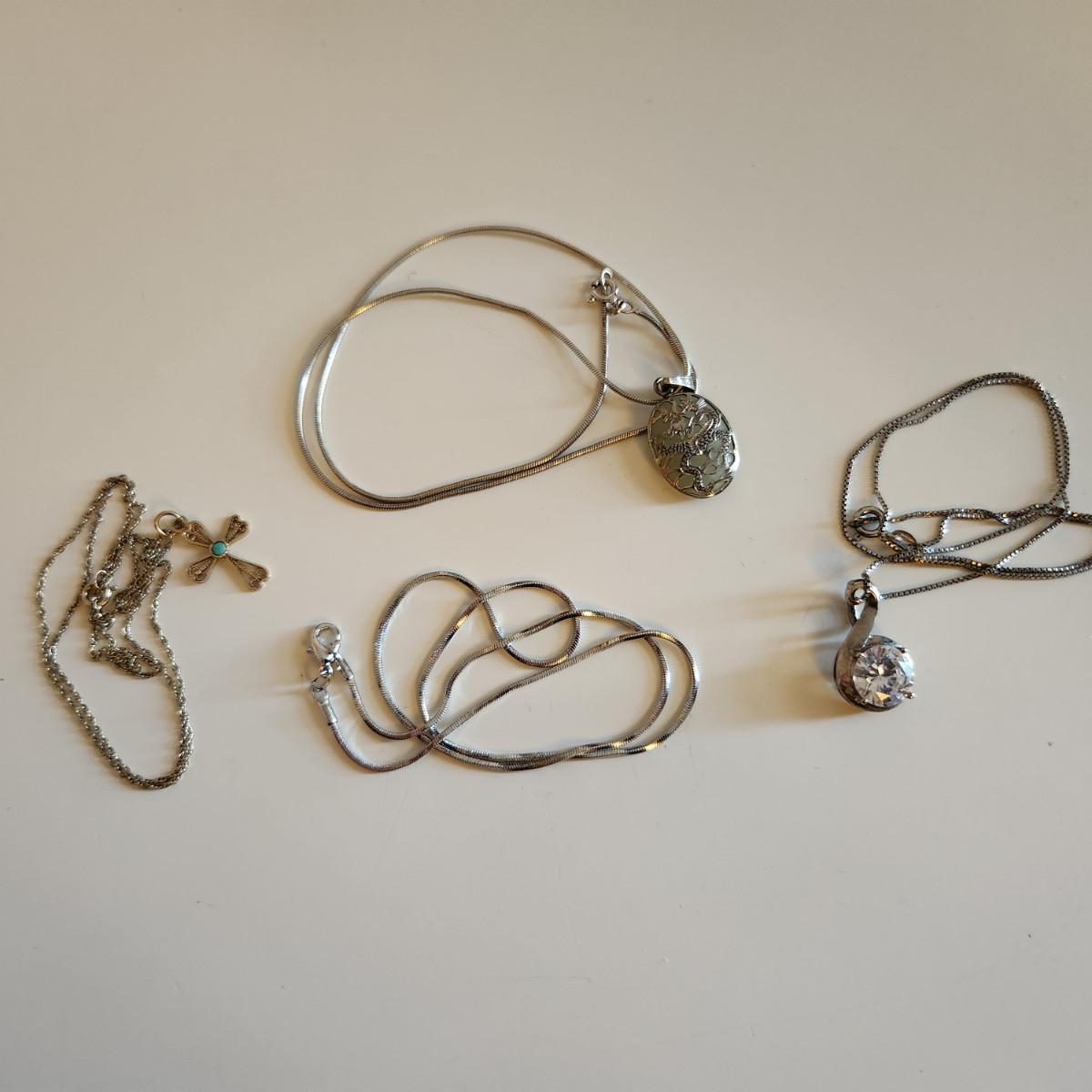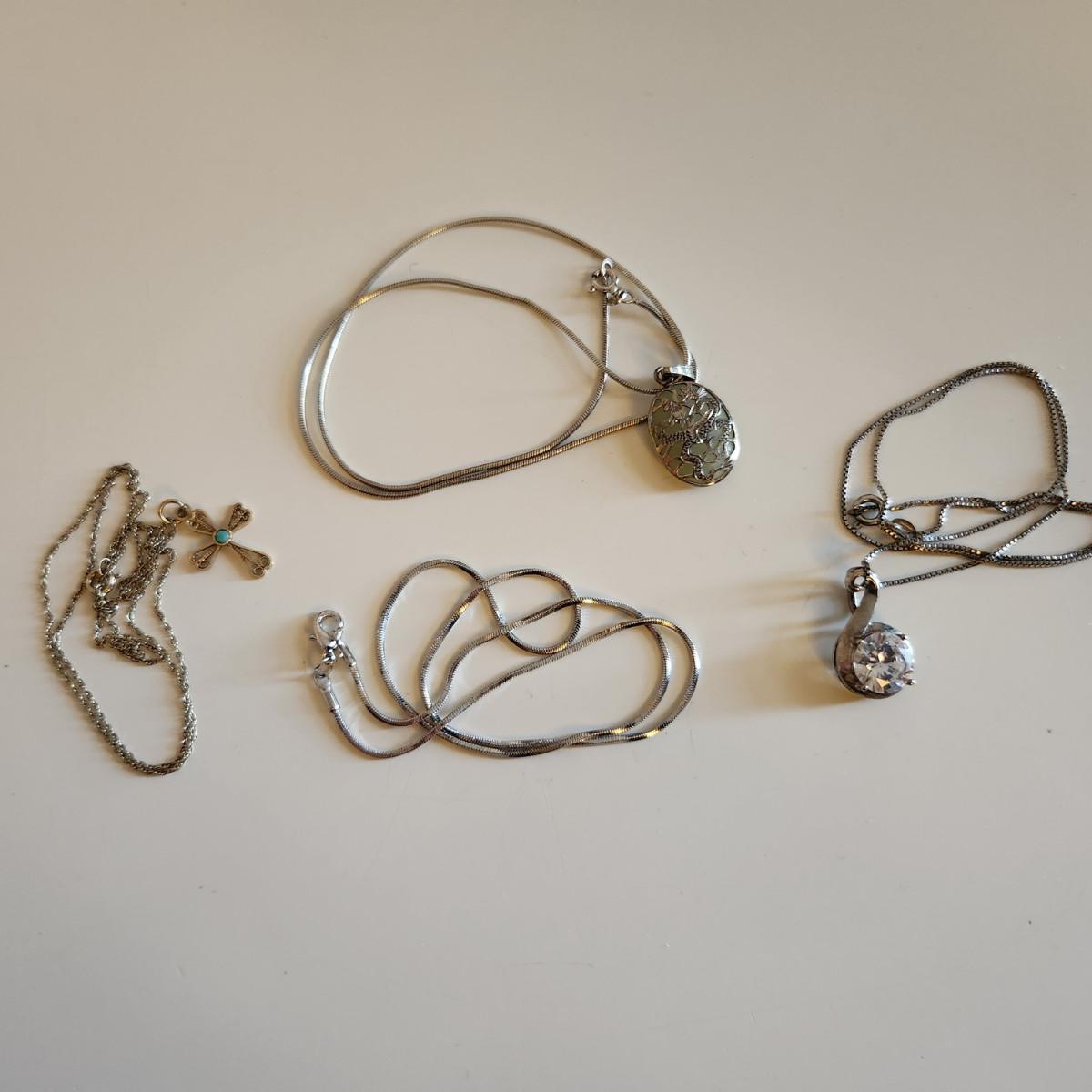 This auction lot is for Four Sterling Silver Necklaces. Three necklace are marked 925. There is a 16-inch necklace with a large cut glass stone, another 14-inch necklace with a pendant of silver overlay on jade stone, a very delicate 17-inch chain with a lacey crucifix and an unmarked 14-inch woven chain. Buying as a lot.