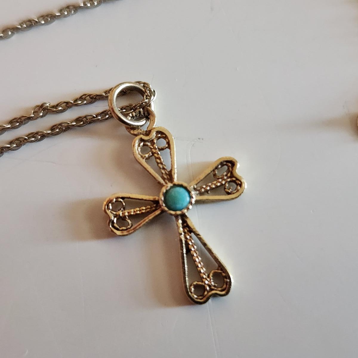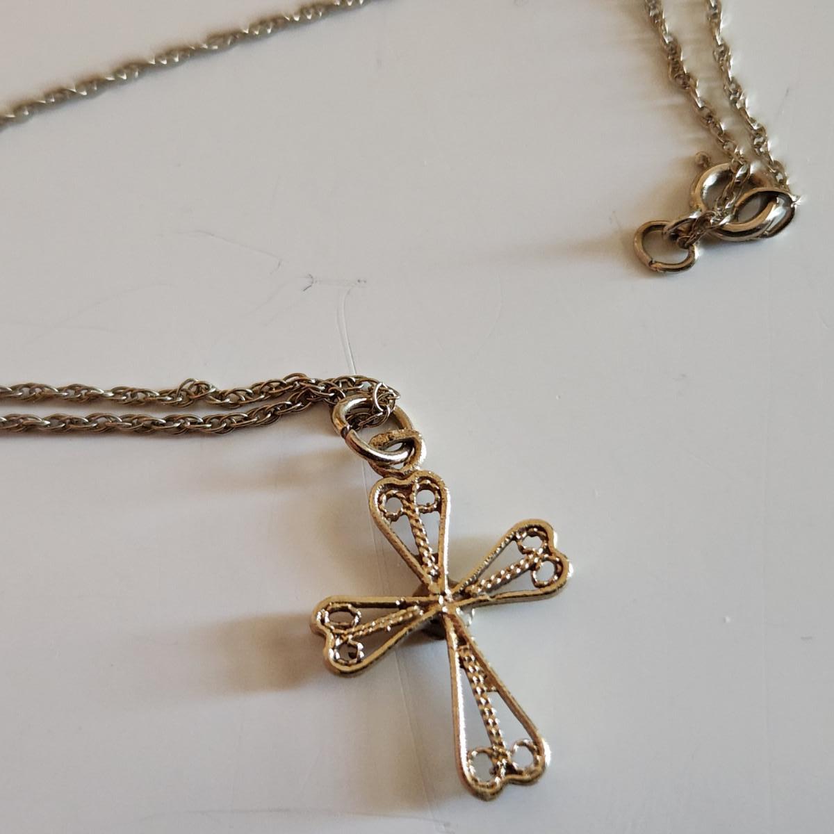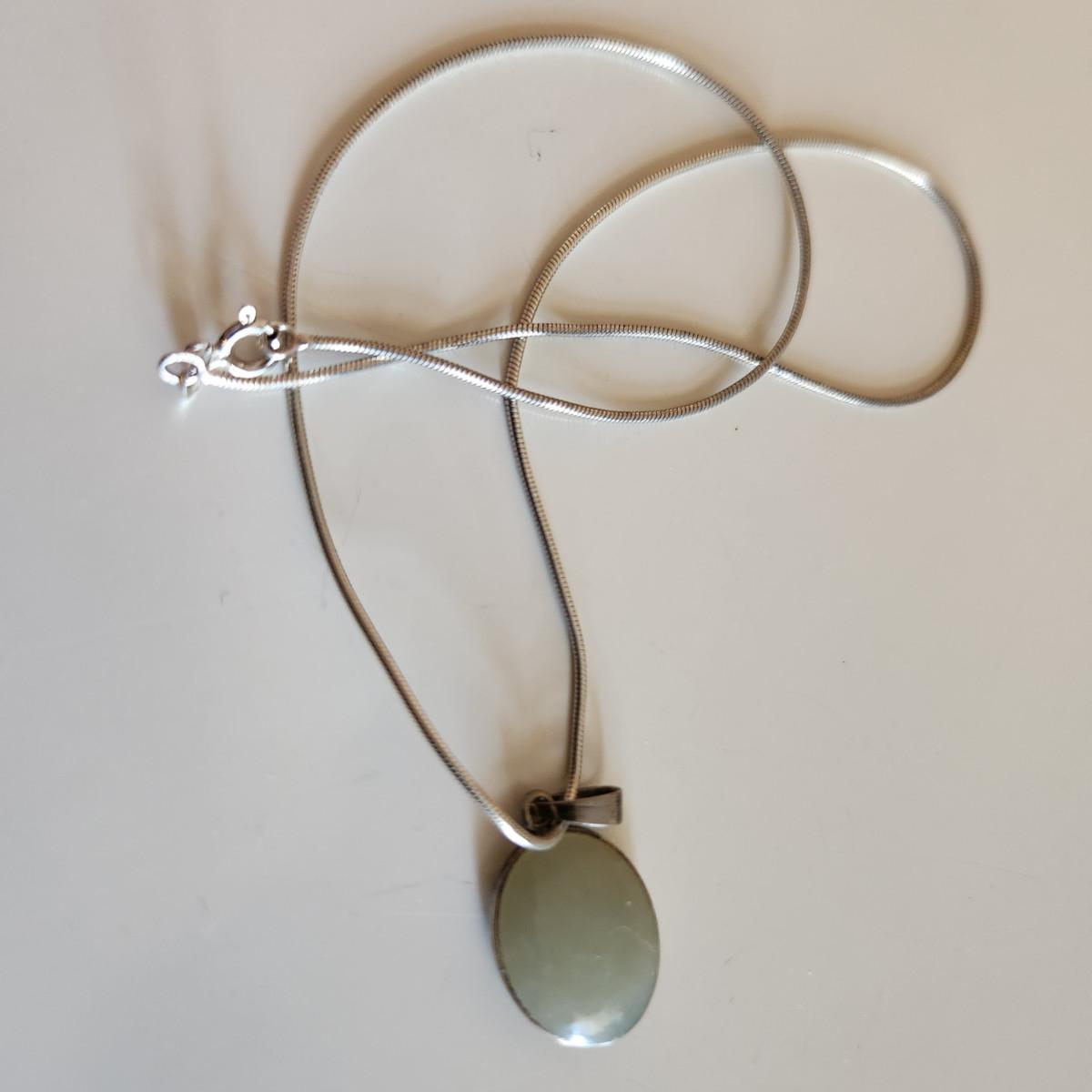 This auction lot is for Four Sterling Silver Necklaces. Three necklace are marked 925. There is a 16-inch necklace with a large cut glass stone, another 14-inch necklace with a pendant of silver overlay on jade stone, a very delicate 17-inch chain with a lacey crucifix and an unmarked 14-inch woven chain. Buying as a lot.