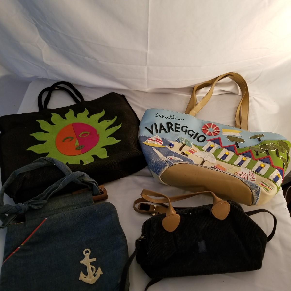 A quartet of summer bags. Cloth, canvas and other materials. Largest bag measures 19" wide. There is some wear on a couple of the bags. See photos for detail. Shipping available.