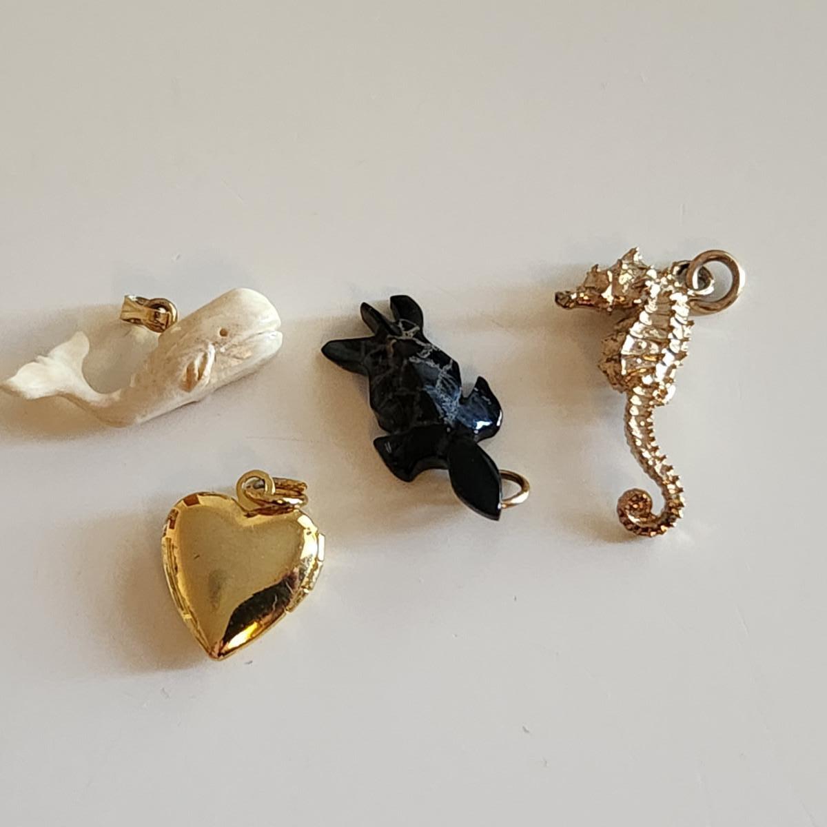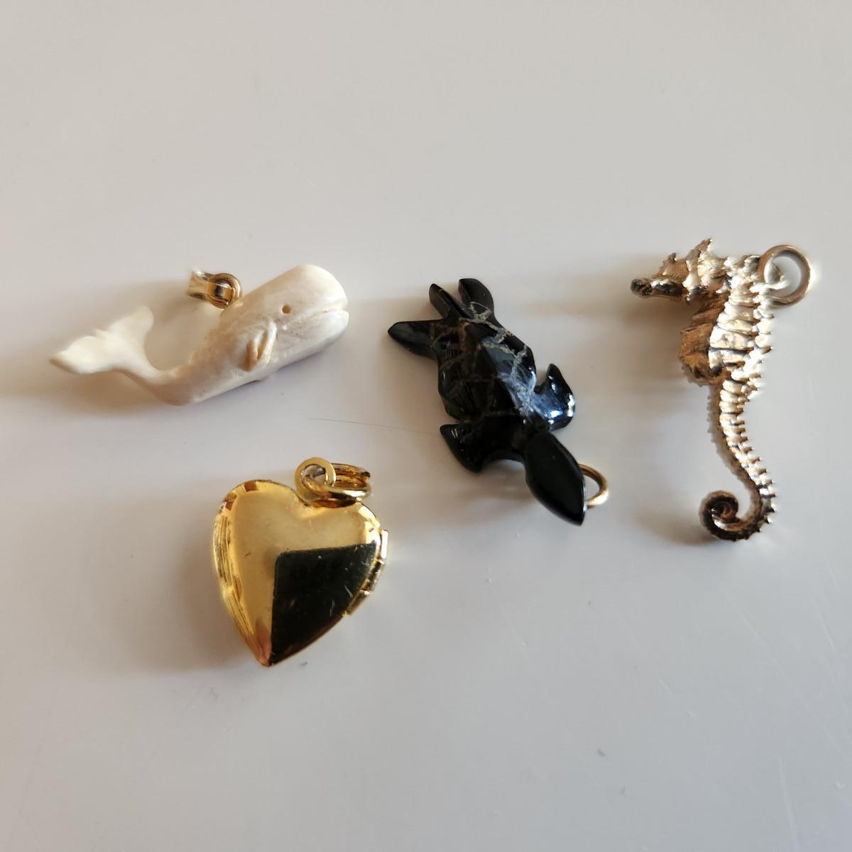 This auction lot is for Four Sweet Charms. This charms where in the bottom of a small dresser jewelry box in a recent estate. There is a small carved white whale, a carved stone turtle, a sea horse and a gold-tone heart locket in this group.