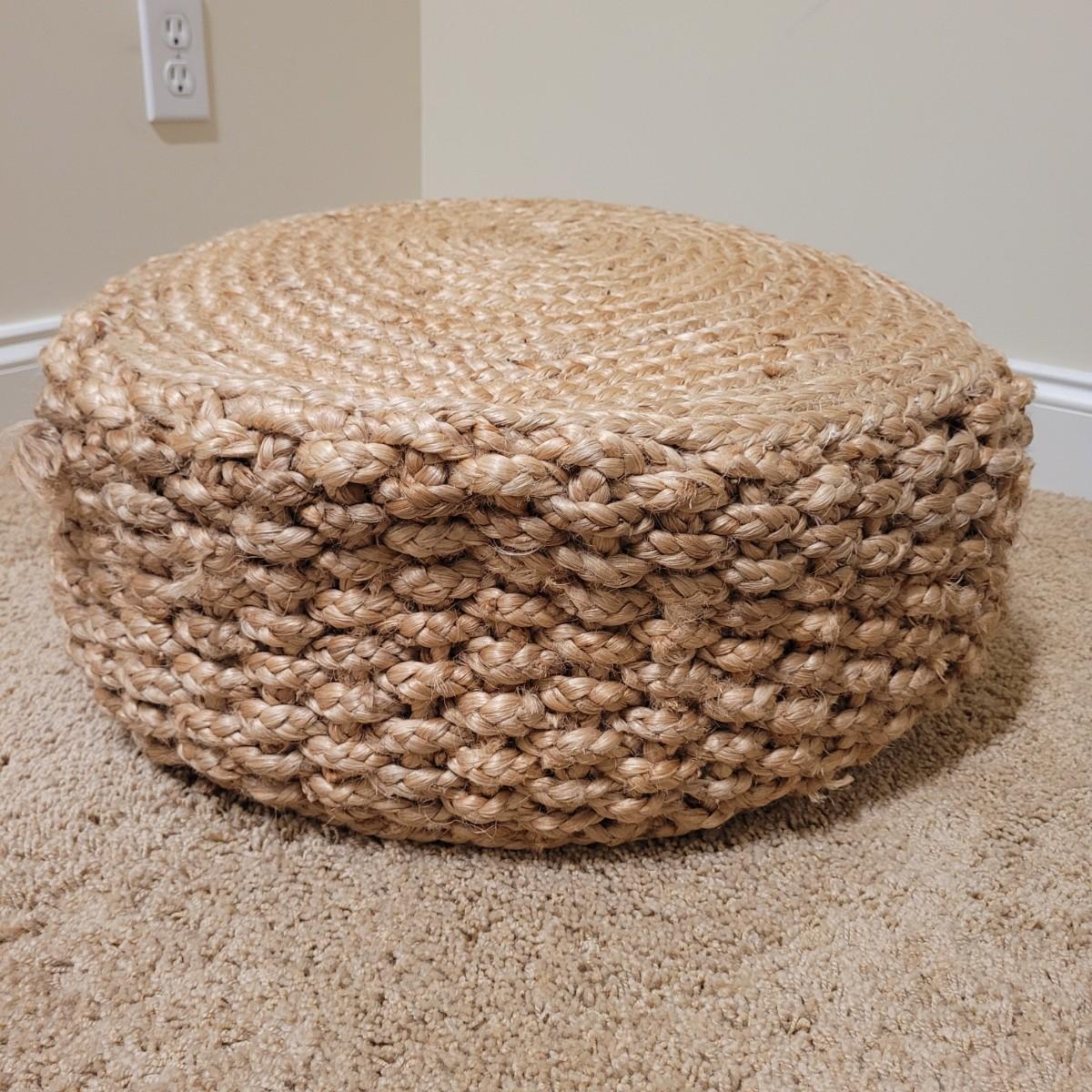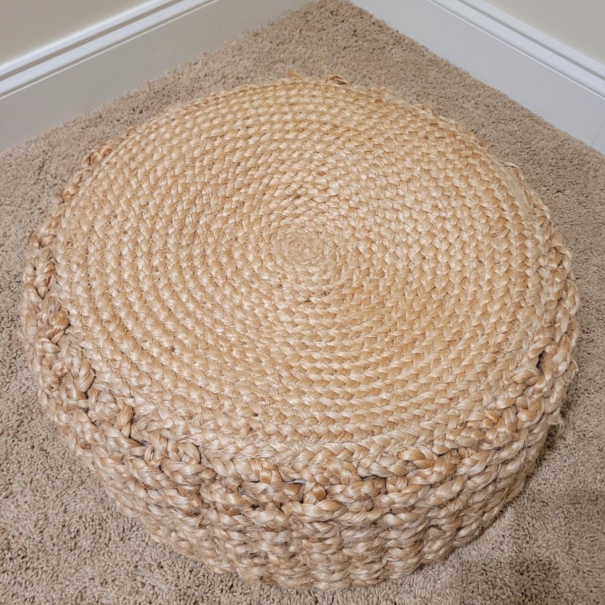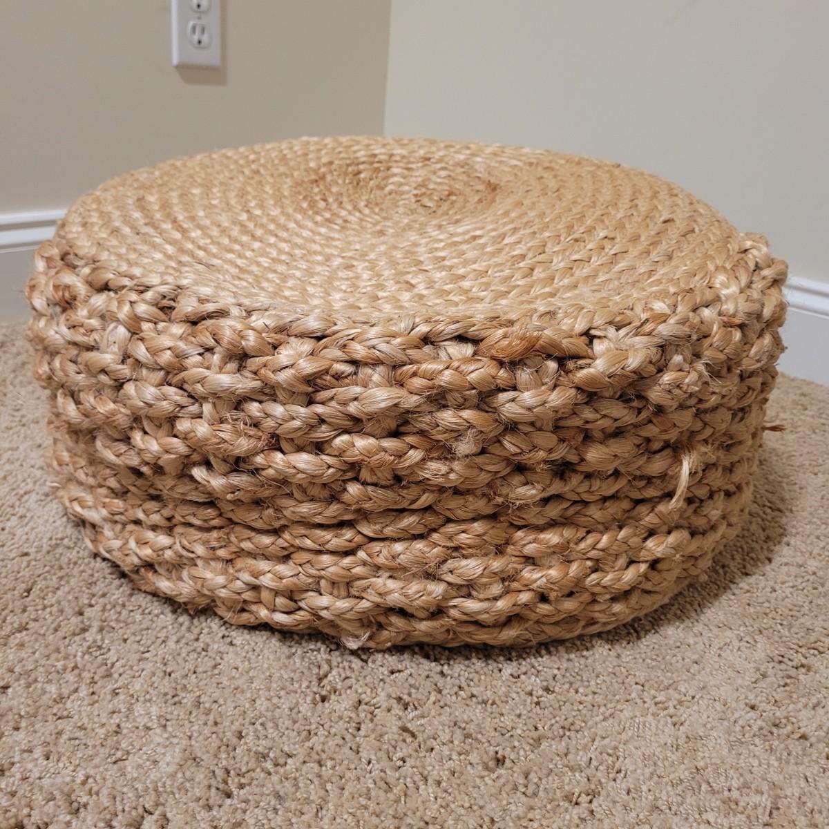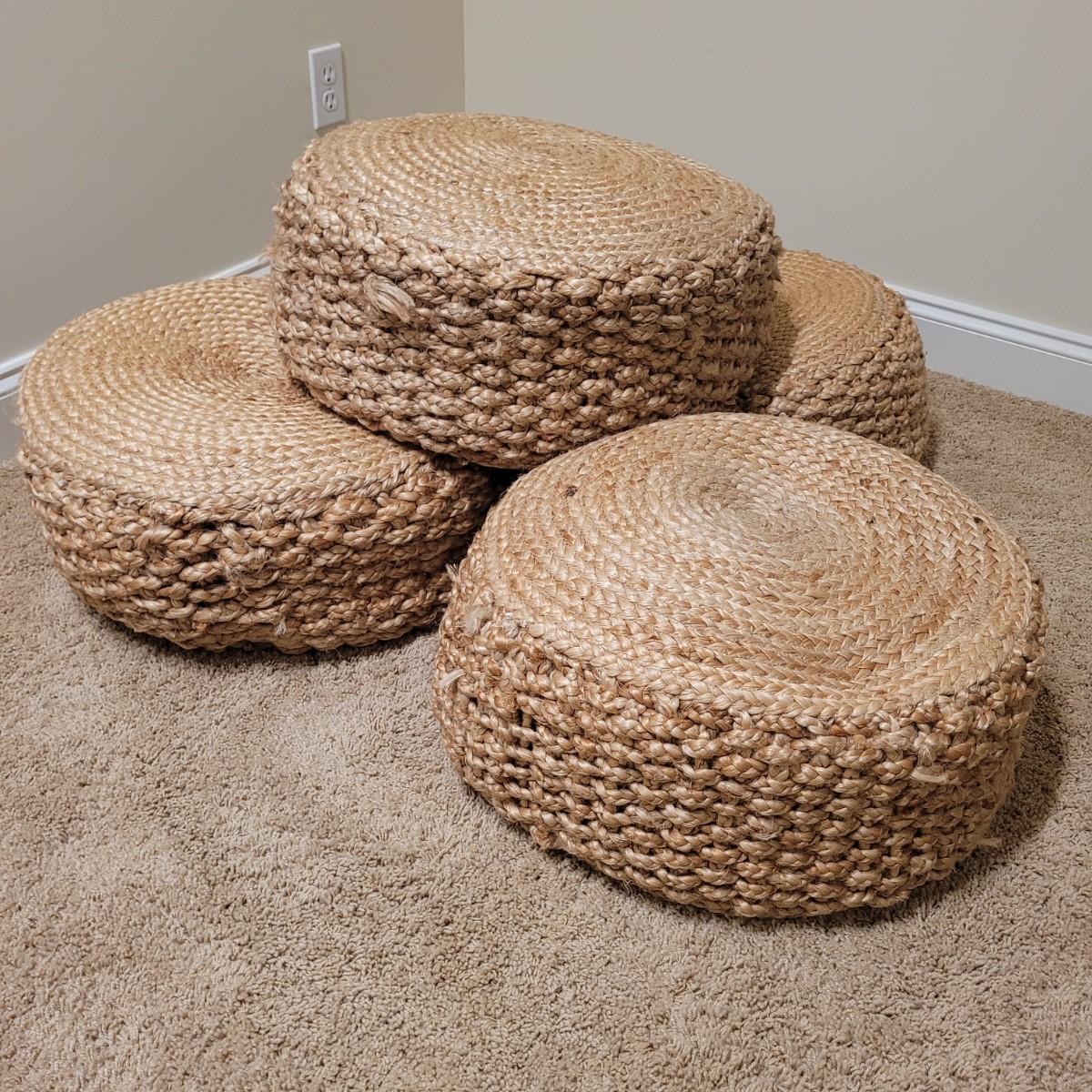 This lot includes four braided jute ottomans. These ottomans are matching. They are made from a stiff braided fiber and stuffed for support. They can be used as a footstool or seat. Some of the fibers are lightly damaged across the four items. See photos for more detail. Individually, the ottomans measure 22" x 22" x 10"H.