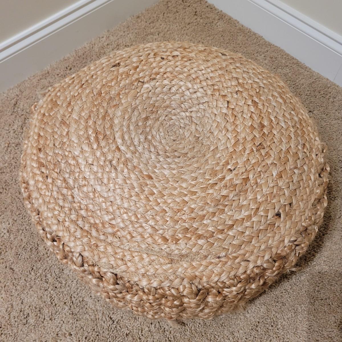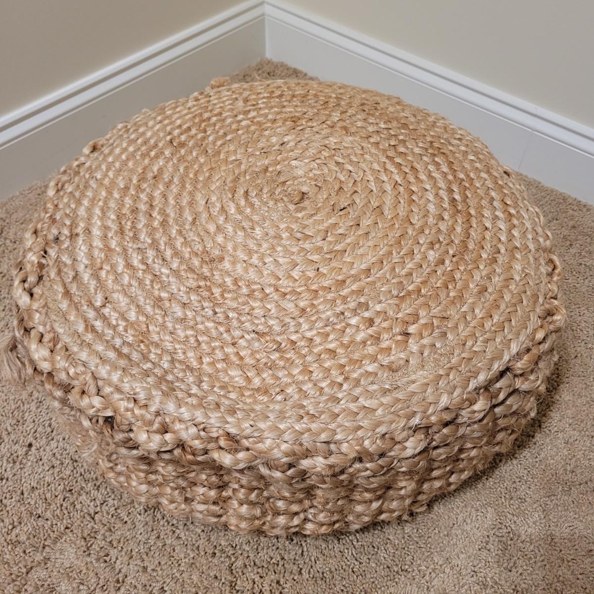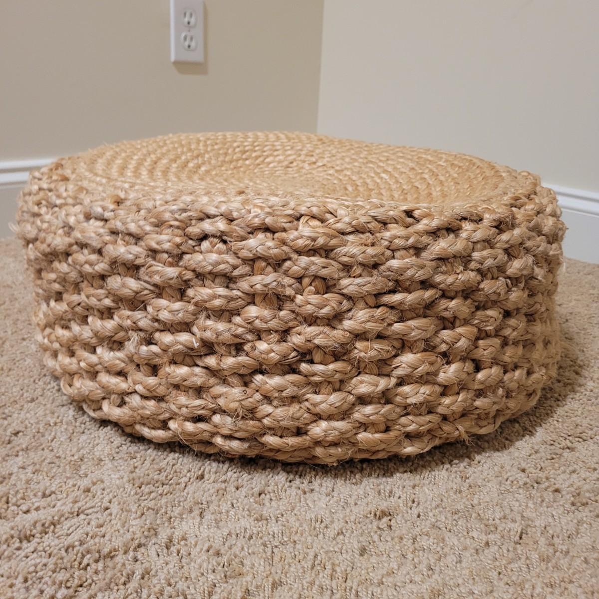 This lot includes four braided jute ottomans. These ottomans are matching. They are made from a stiff braided fiber and stuffed for support. They can be used as a footstool or seat. Some of the fibers are lightly damaged across the four items. See photos for more detail. Individually, the ottomans measure 22" x 22" x 10"H.