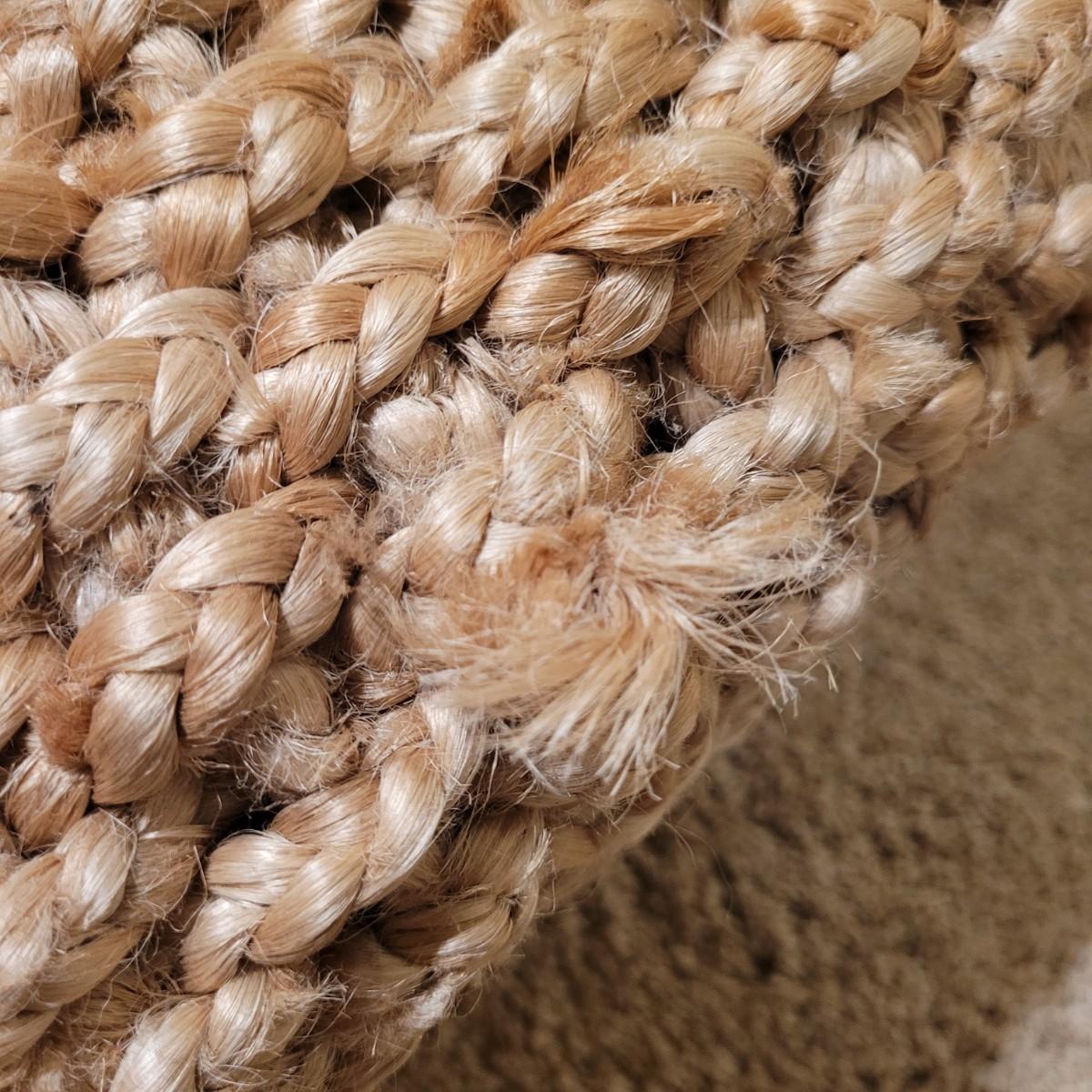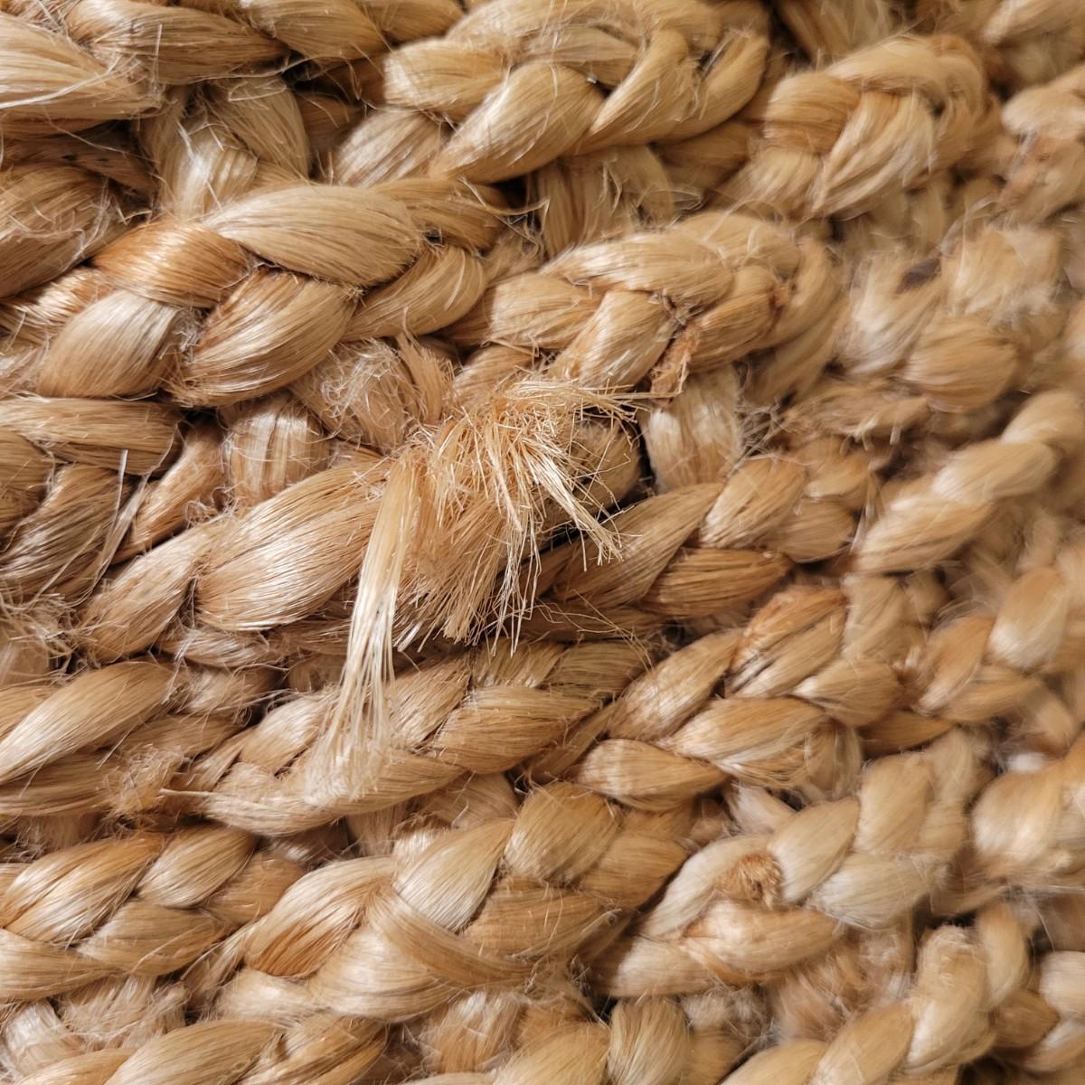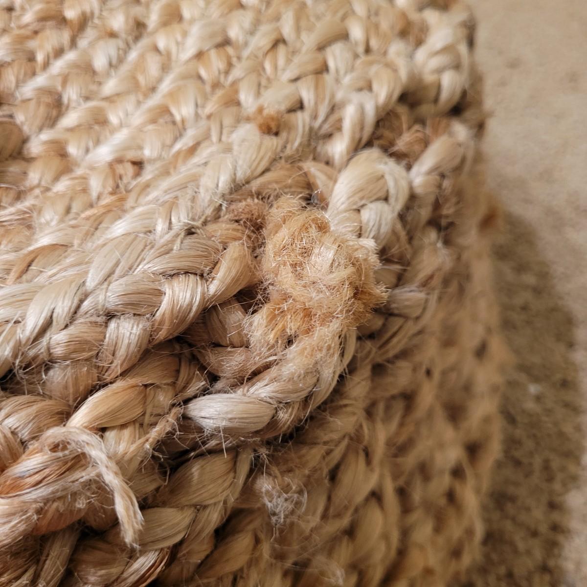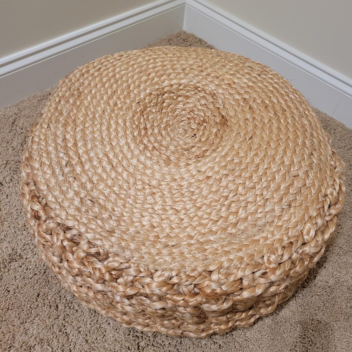 This lot includes four braided jute ottomans. These ottomans are matching. They are made from a stiff braided fiber and stuffed for support. They can be used as a footstool or seat. Some of the fibers are lightly damaged across the four items. See photos for more detail. Individually, the ottomans measure 22" x 22" x 10"H.