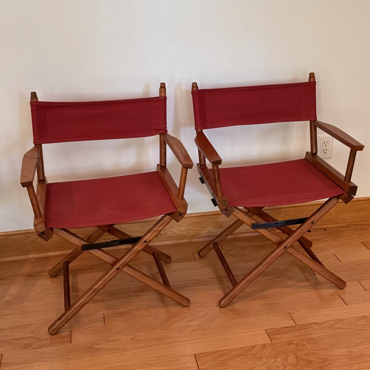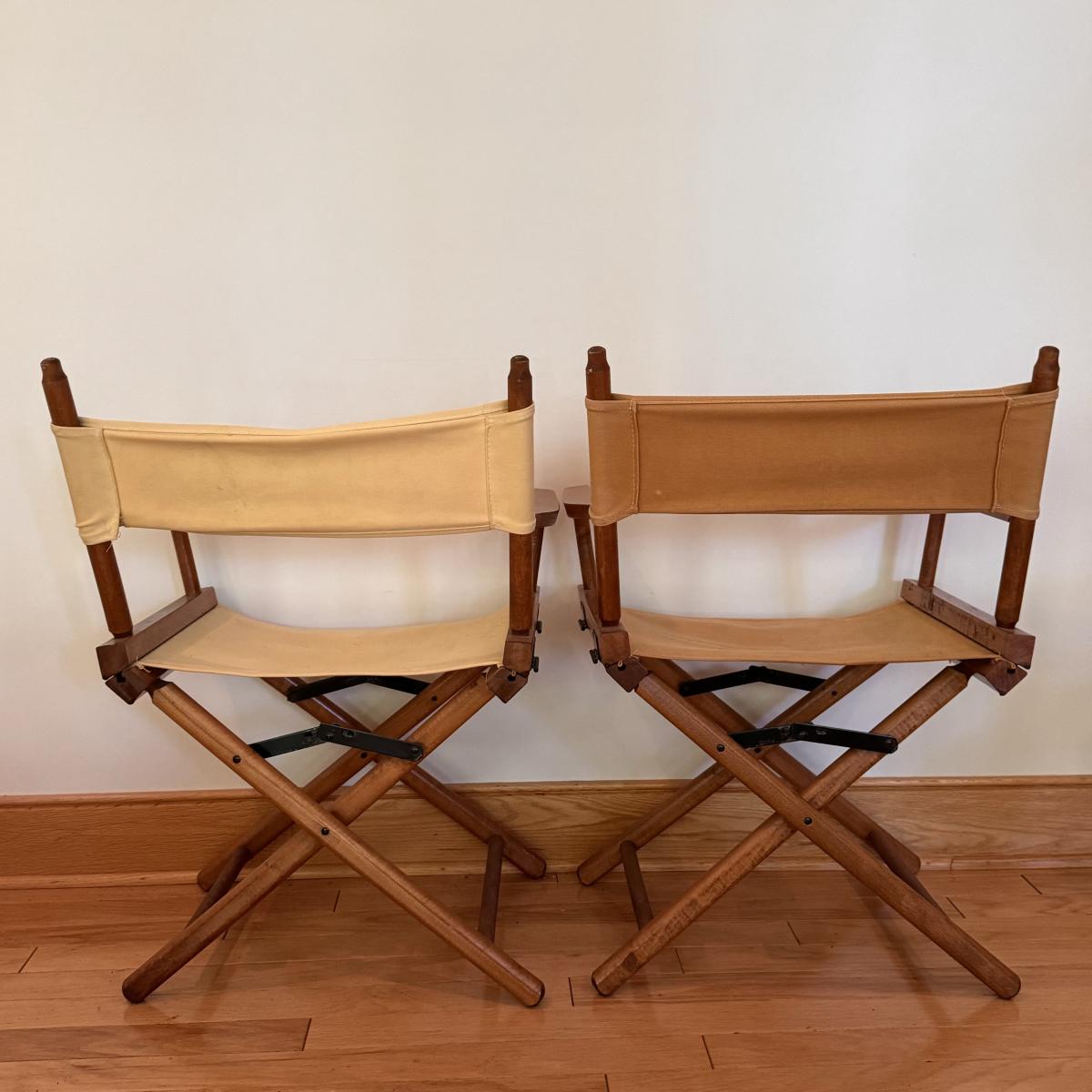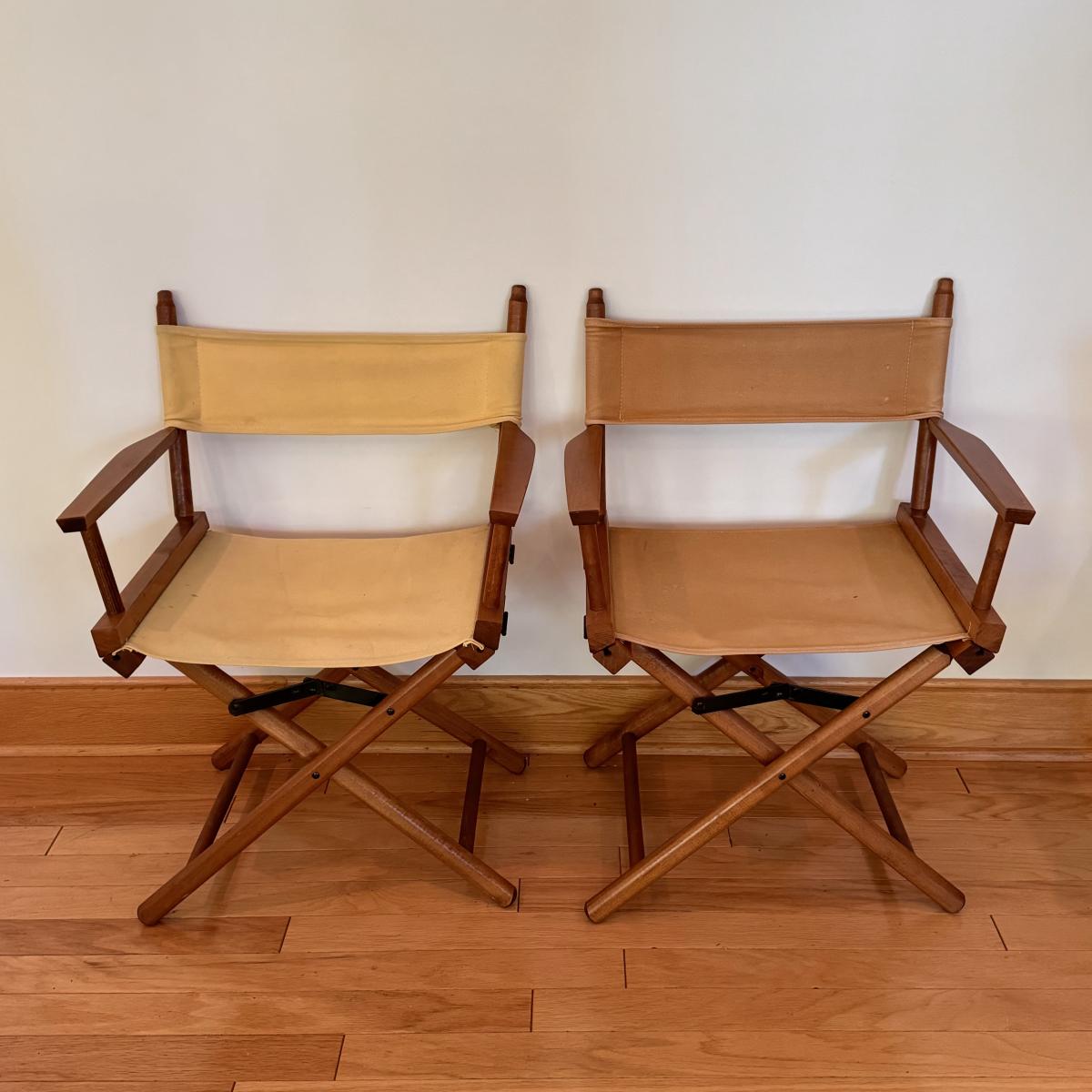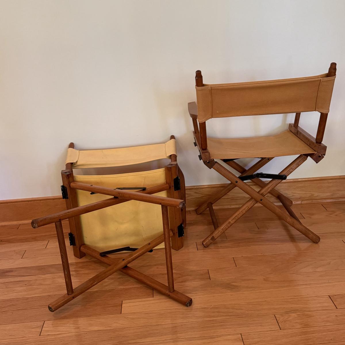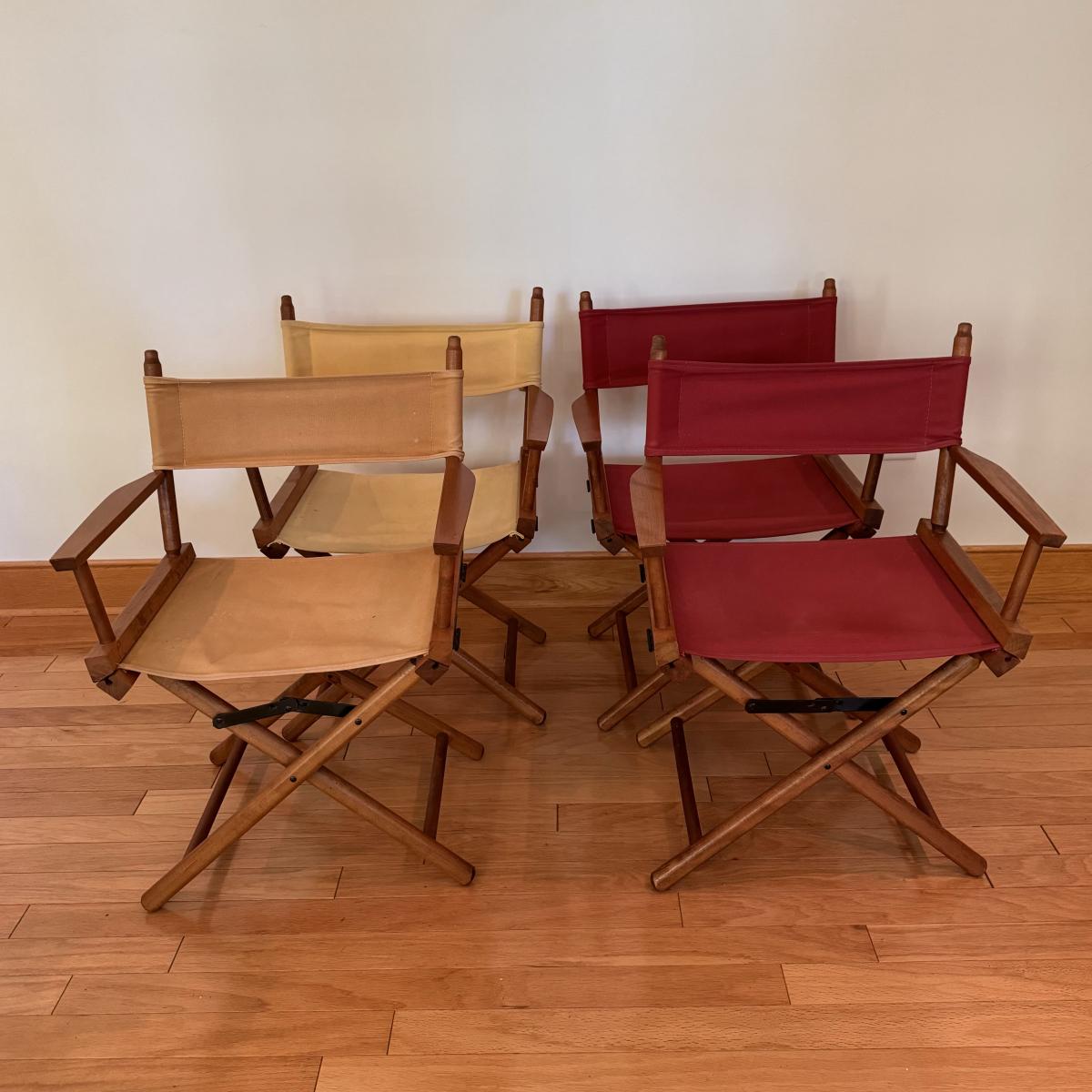 This lot includes four Telescope directors chairs in various colors. There are two red chairs, one yellow, and one tan. The base of the chairs is wood and the seat and back are made of fabric. The chairs individually measure 23.5” x 18” x 33”H. The seats measure 18” x 15” x 17”H from the ground. Local pickup only.