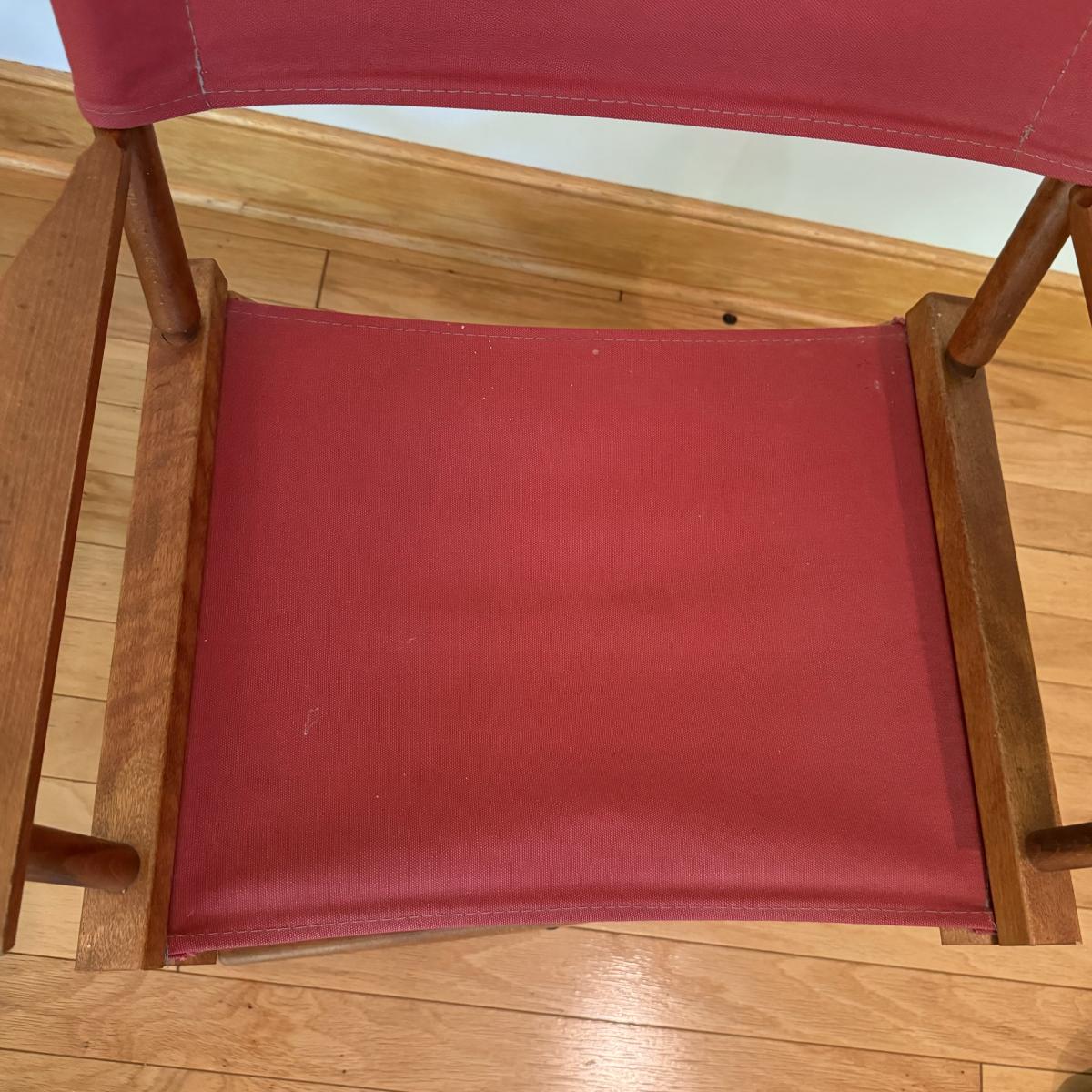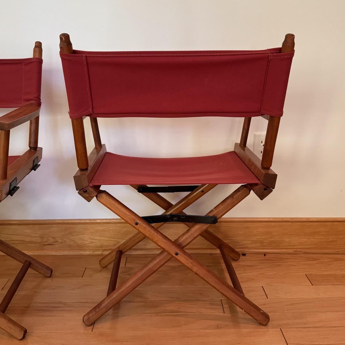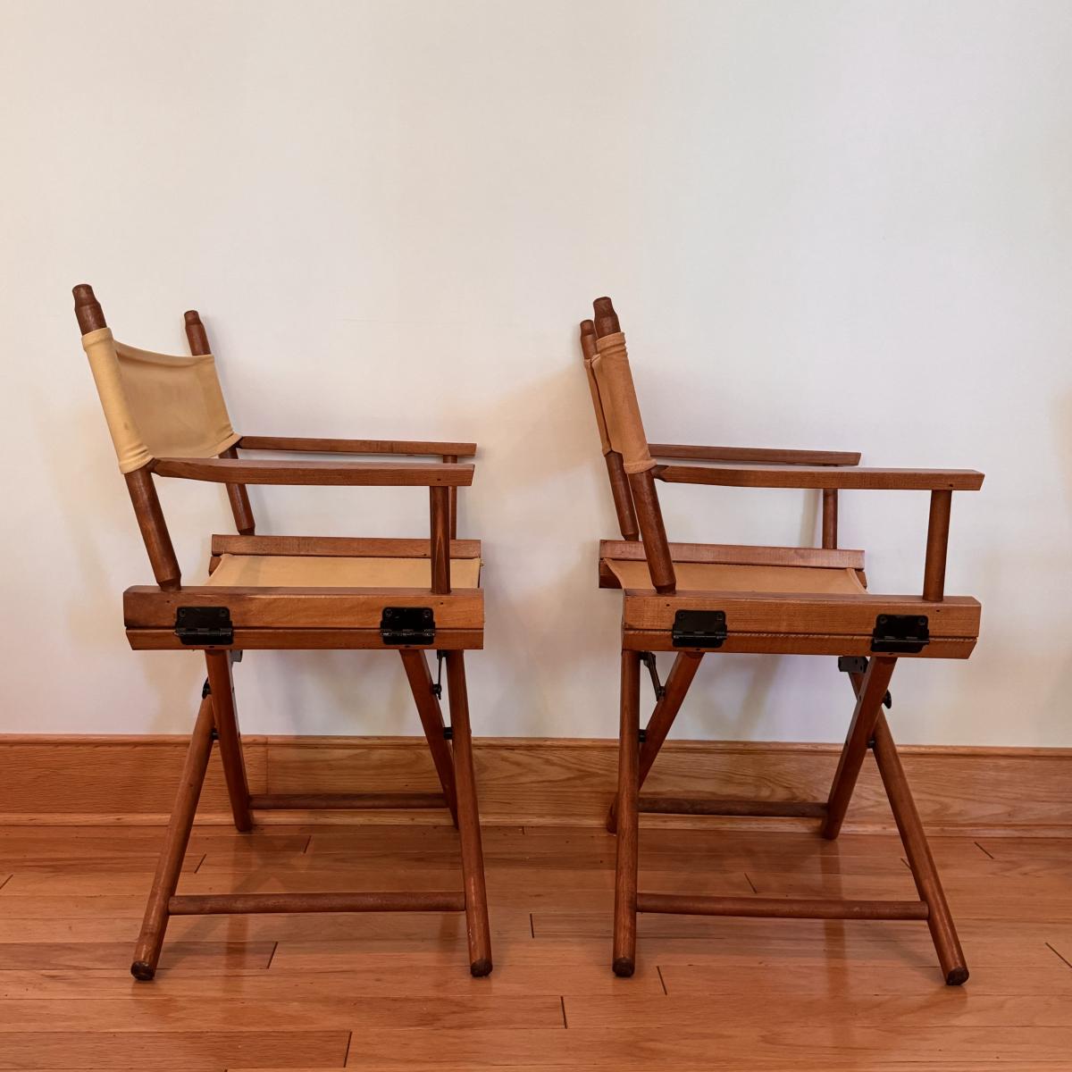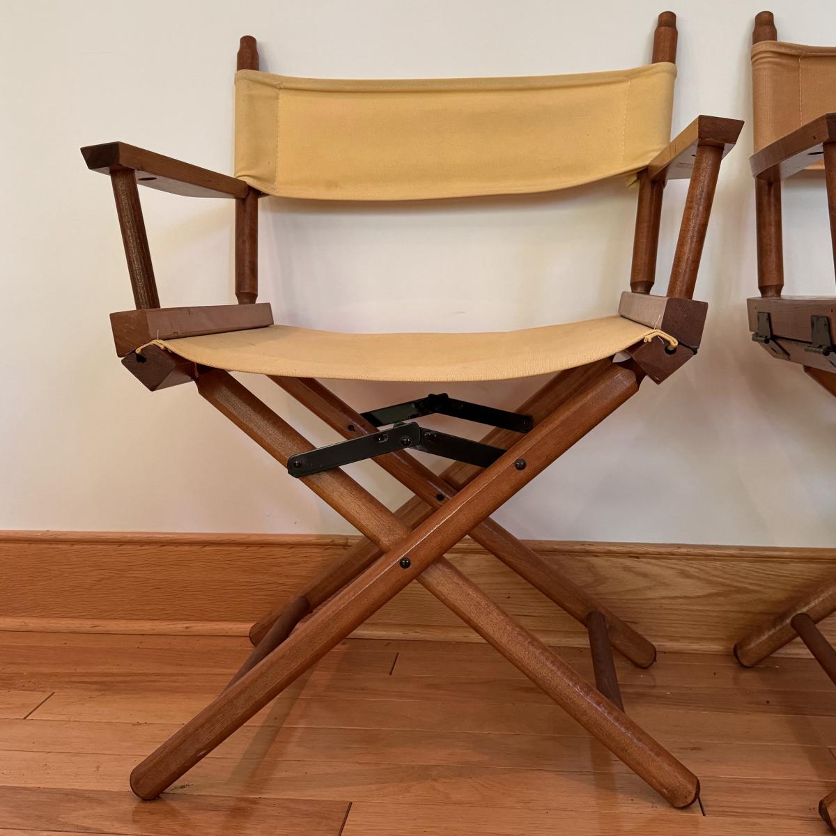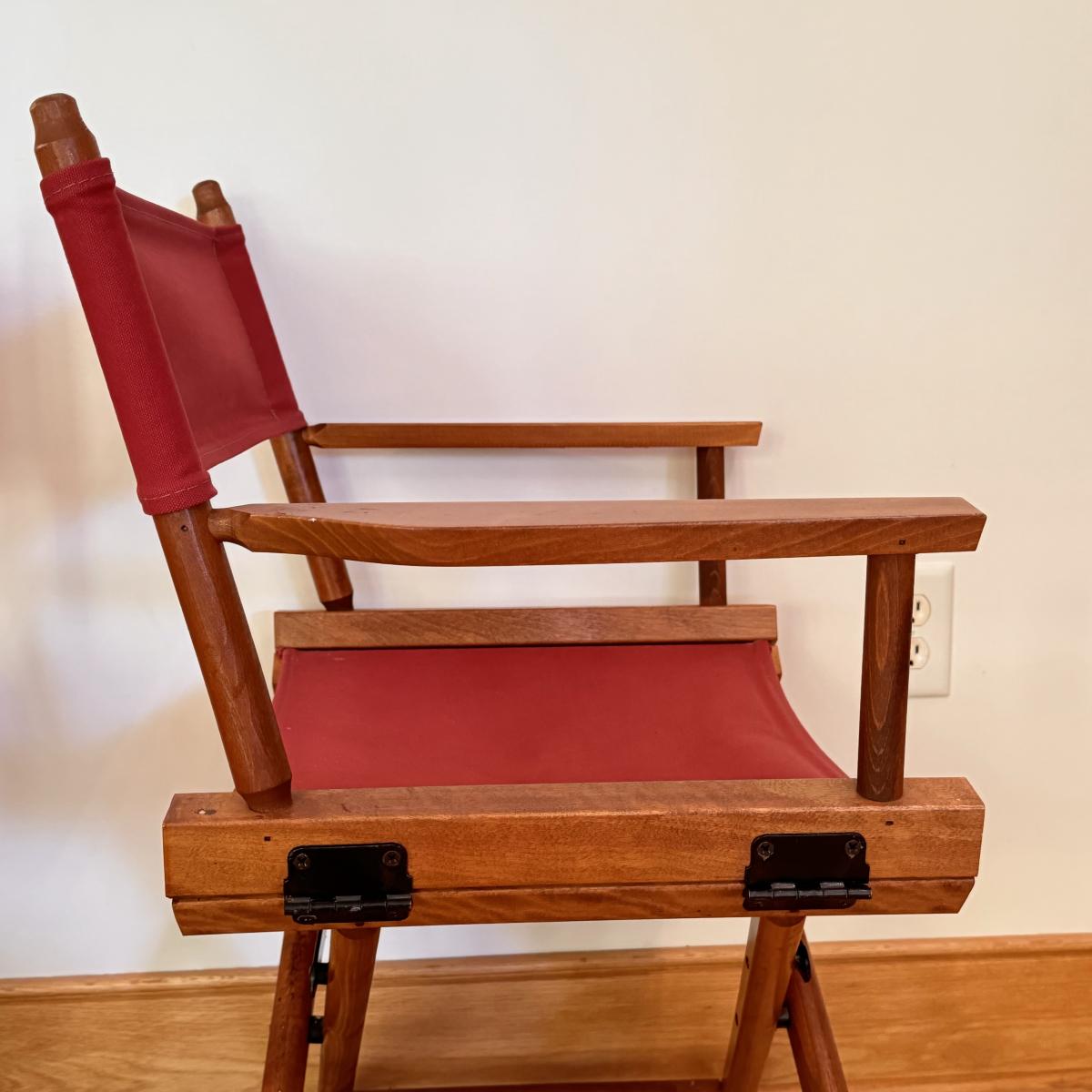 This lot includes four Telescope directors chairs in various colors. There are two red chairs, one yellow, and one tan. The base of the chairs is wood and the seat and back are made of fabric. The chairs individually measure 23.5” x 18” x 33”H. The seats measure 18” x 15” x 17”H from the ground. Local pickup only.