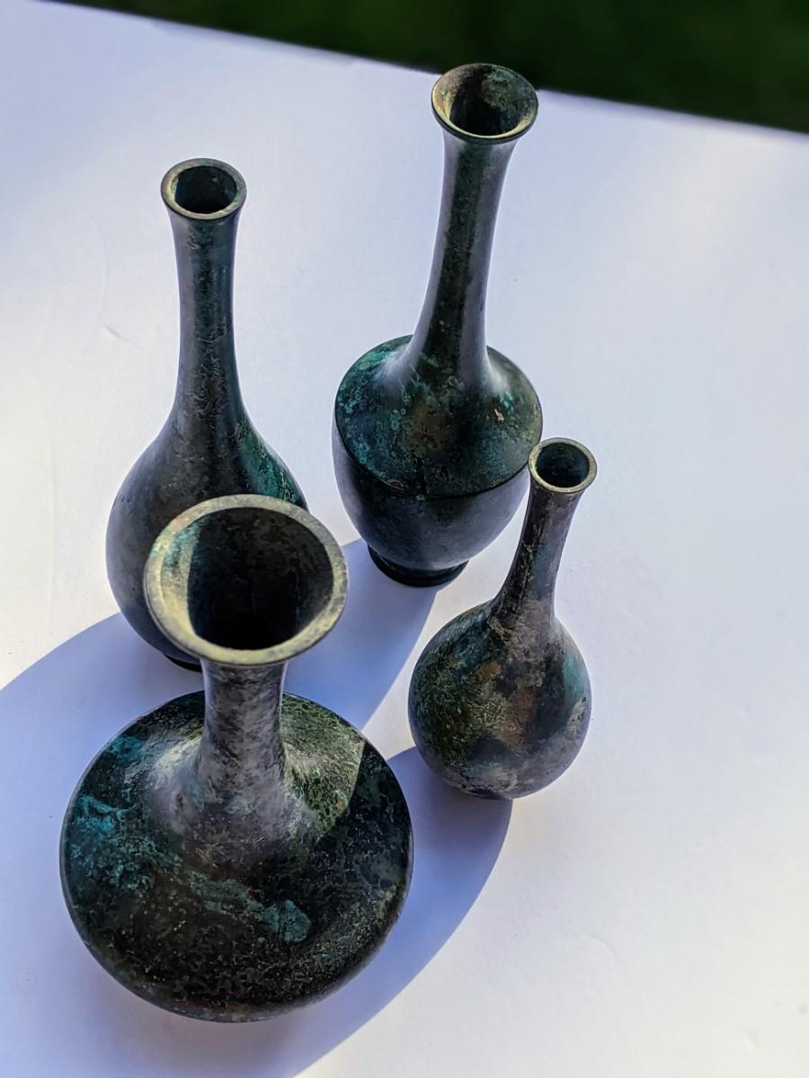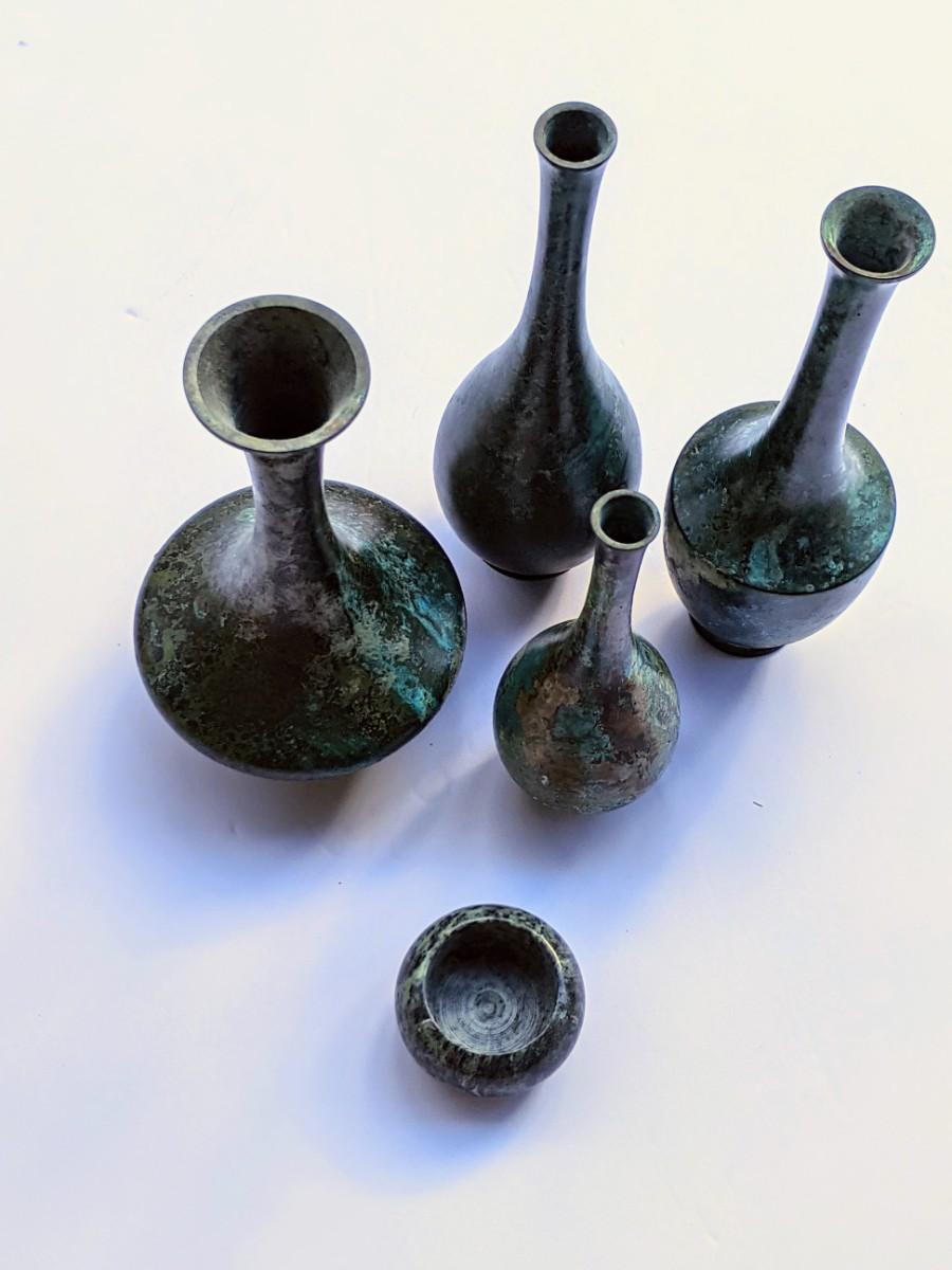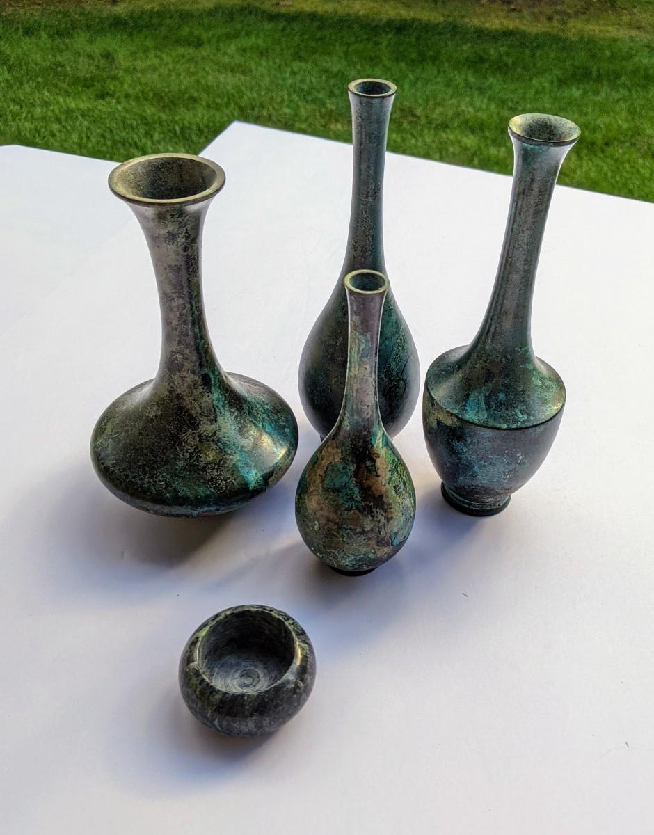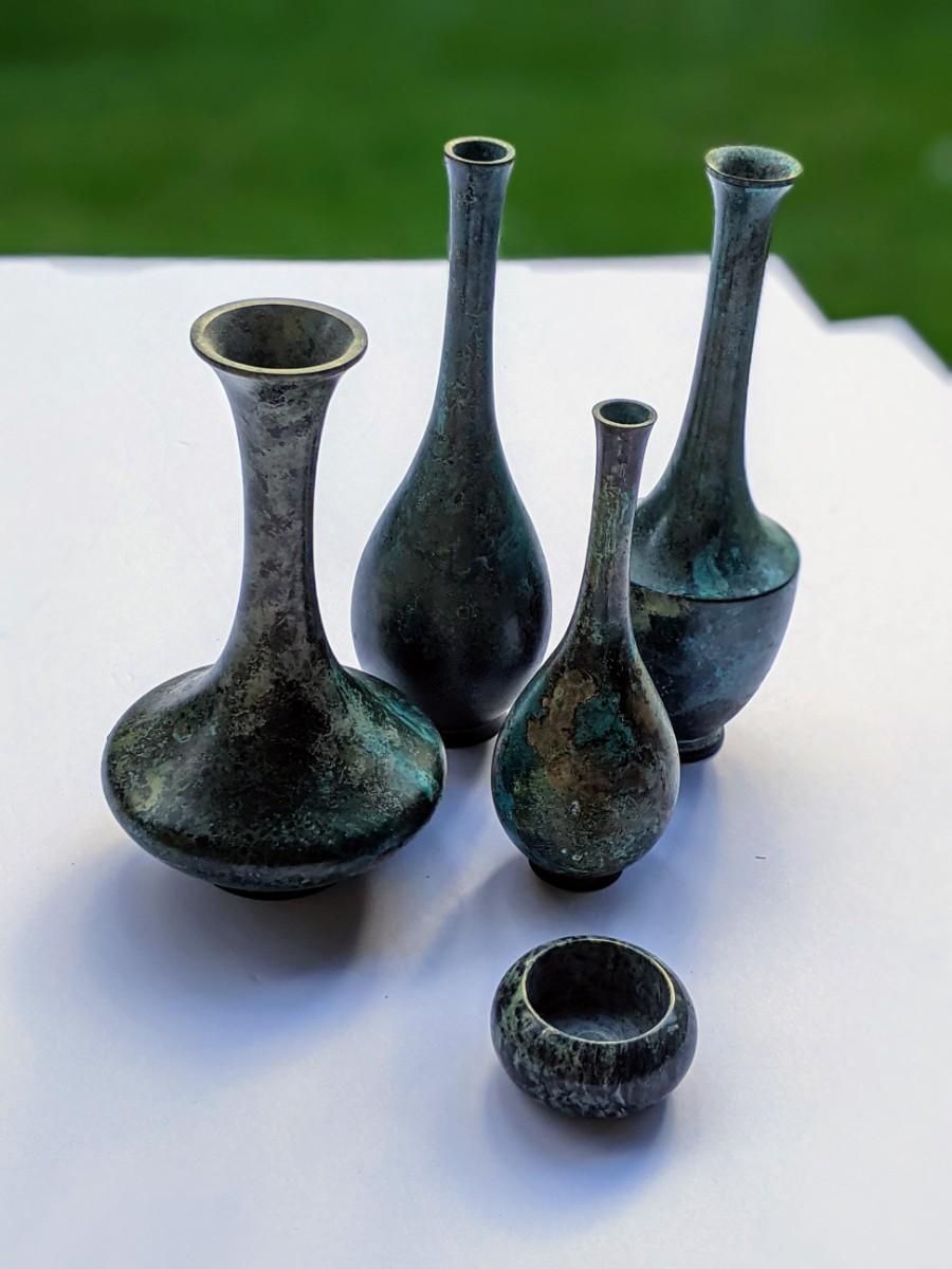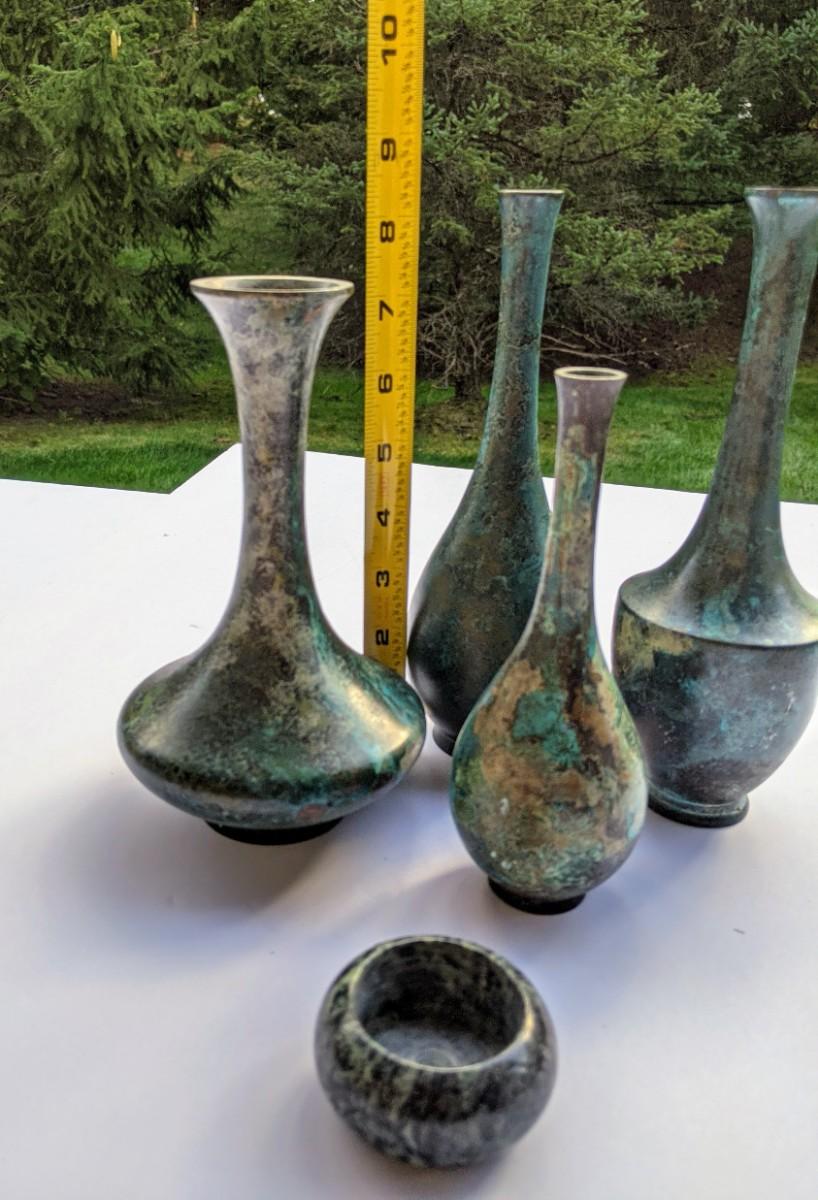Four thin metal vases and votive holder