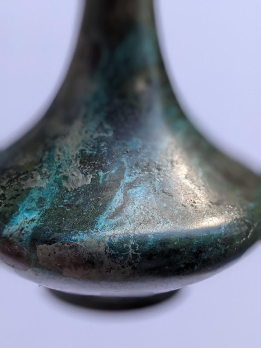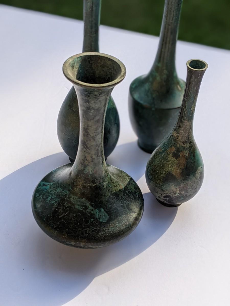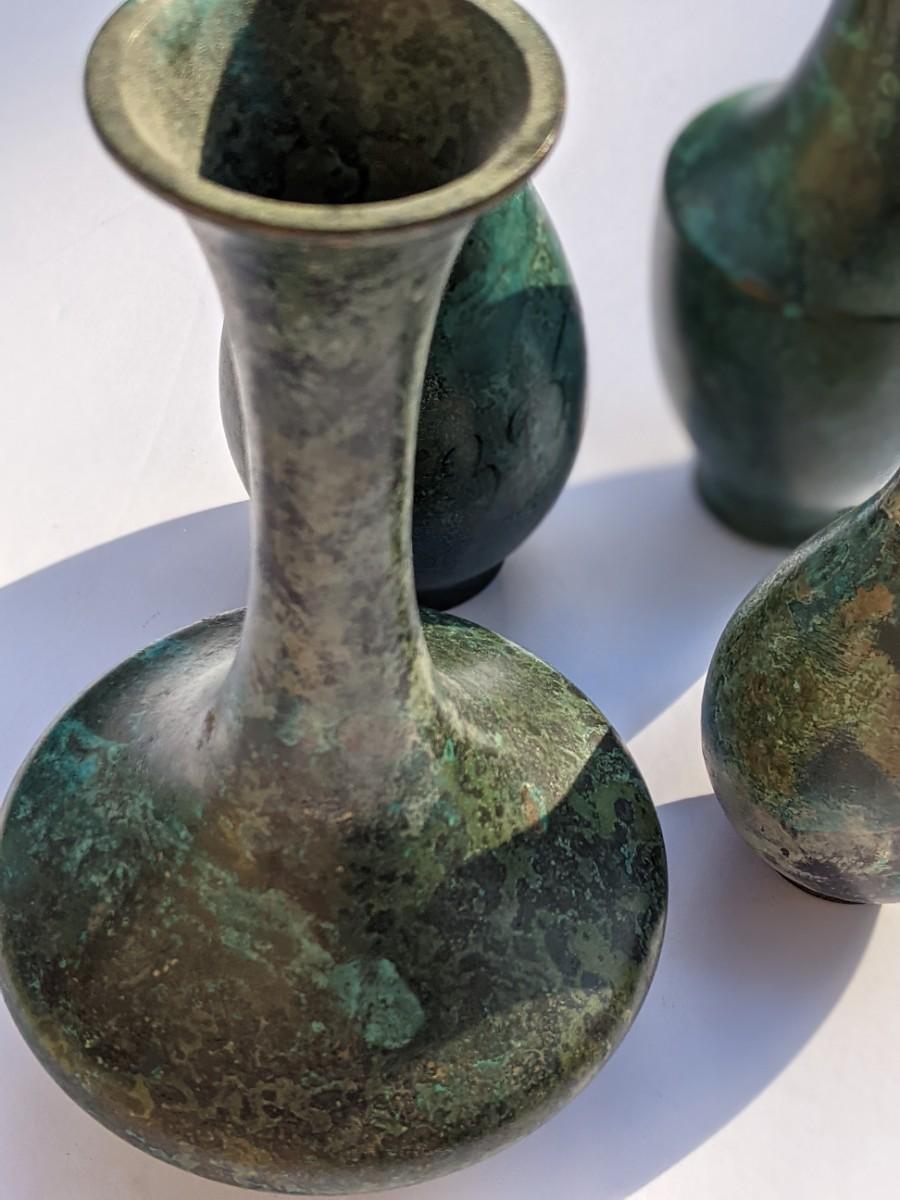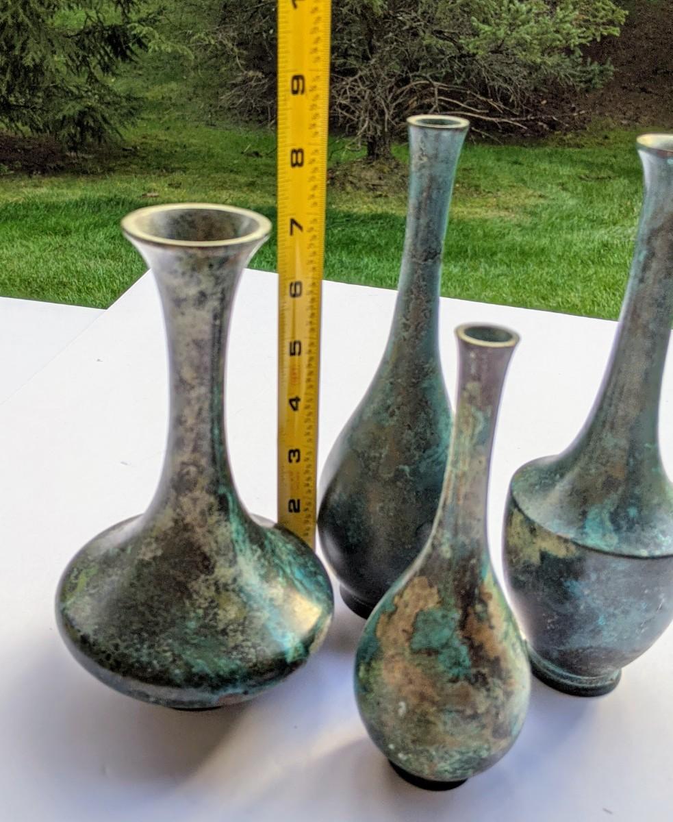 Four thin metal vases and votive holder