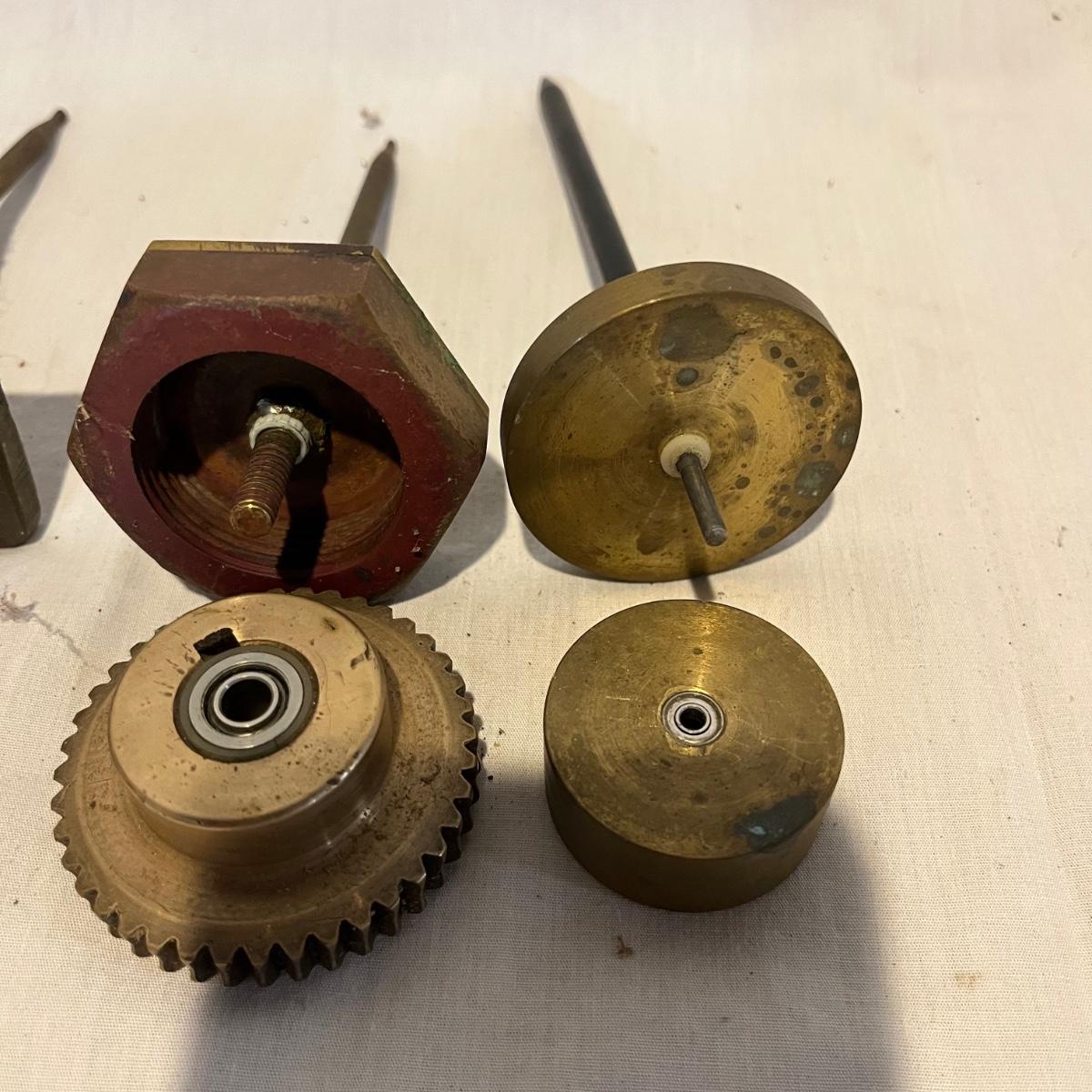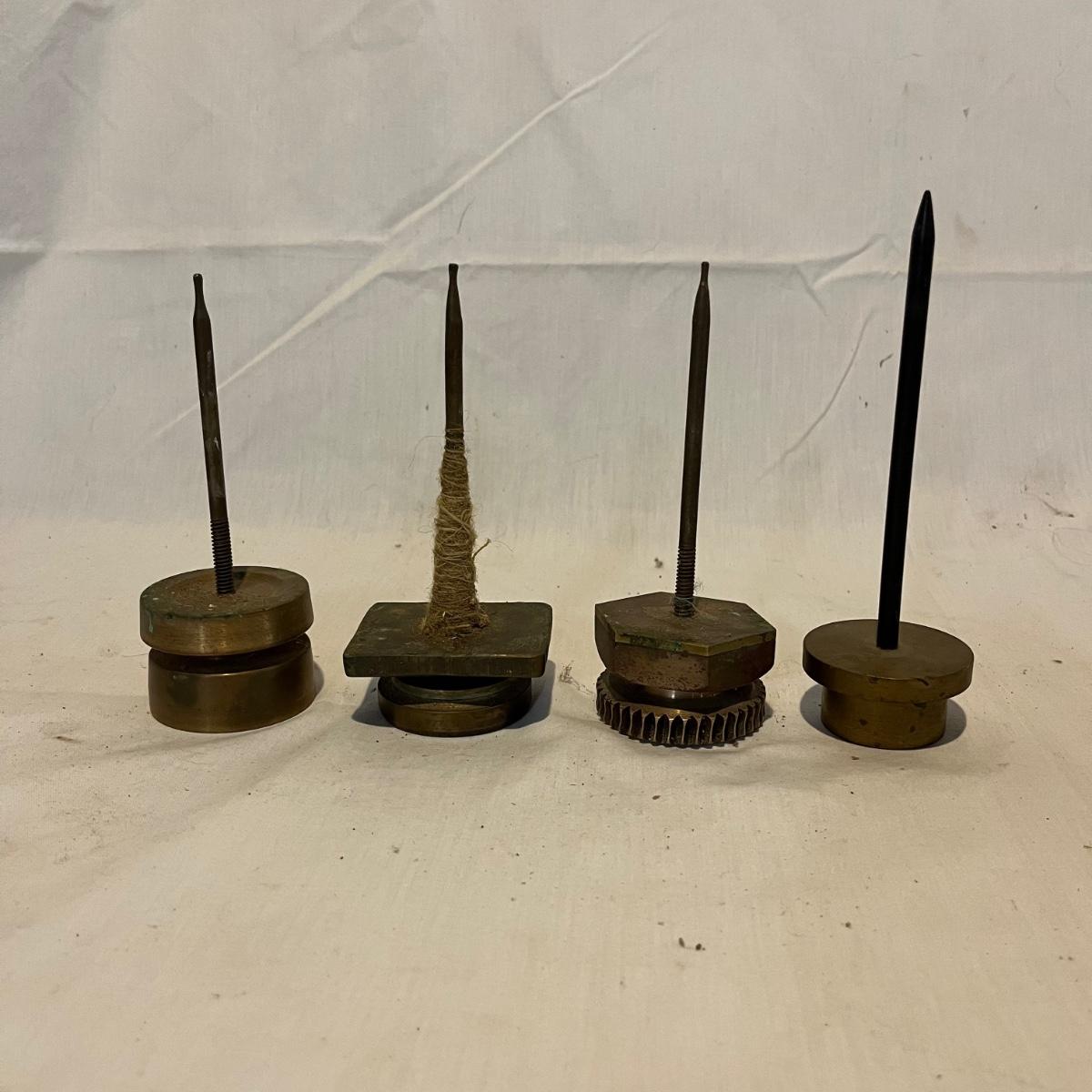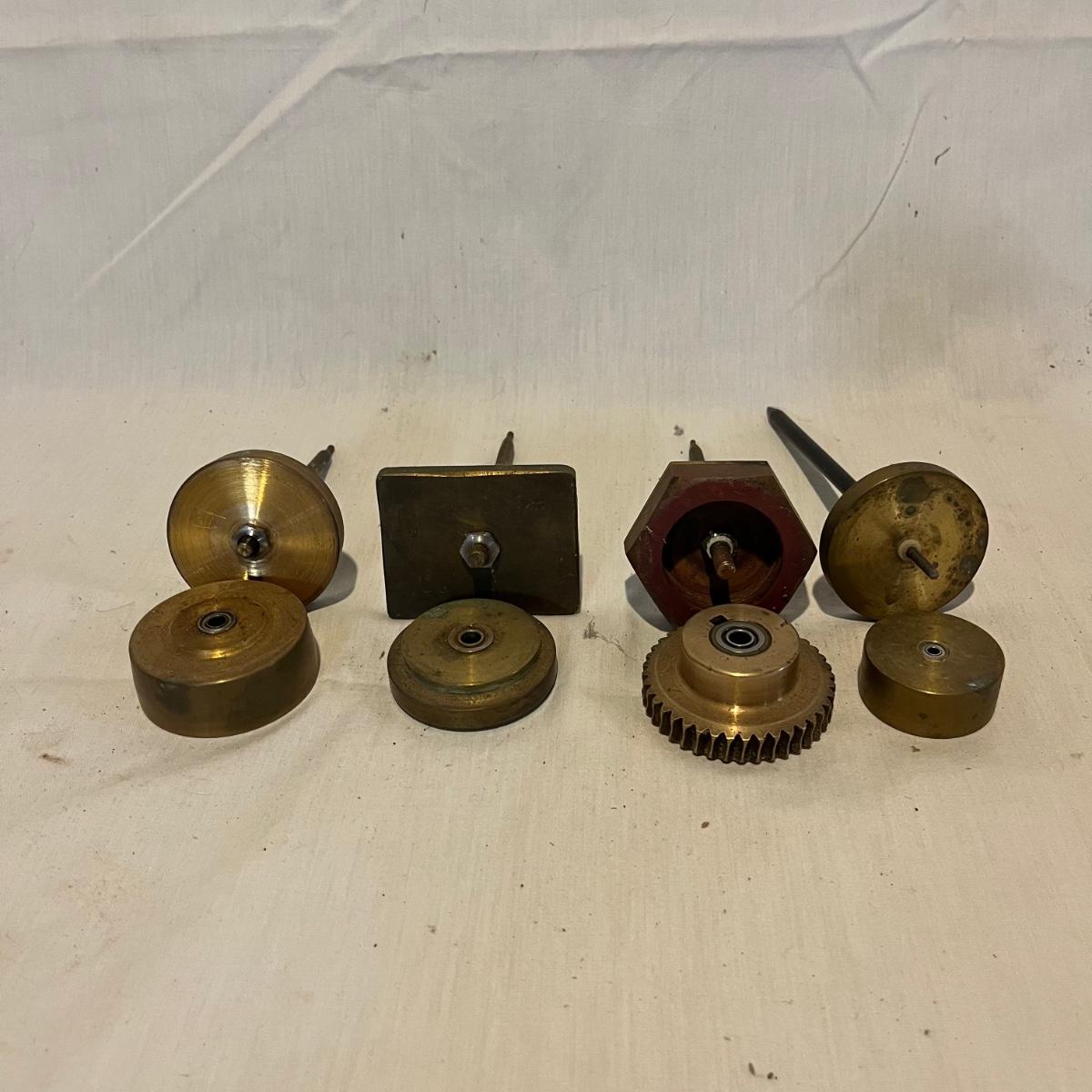 Lot includes four thread winders that are brass with ball bearings. Tallest piece measures 6.5” tall.