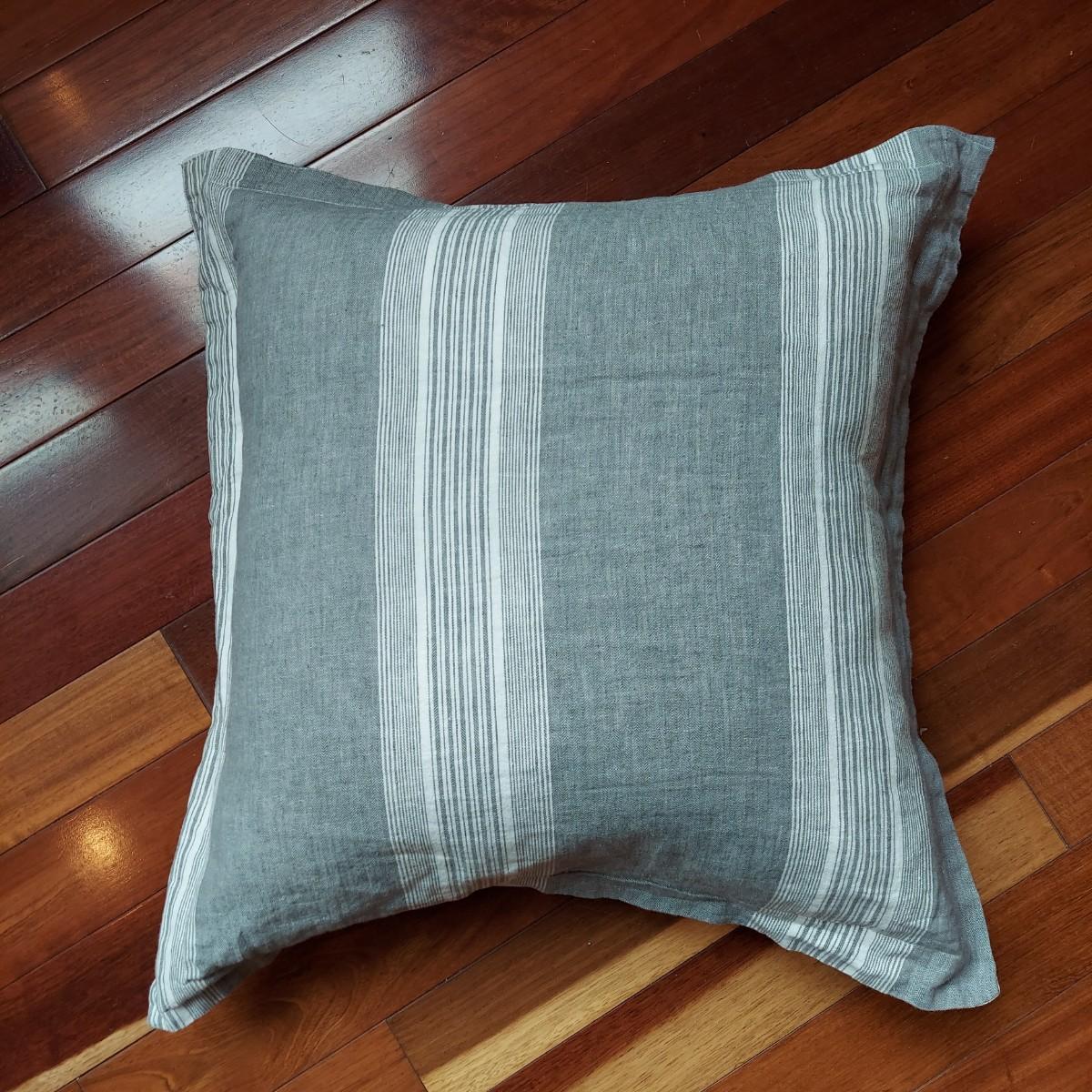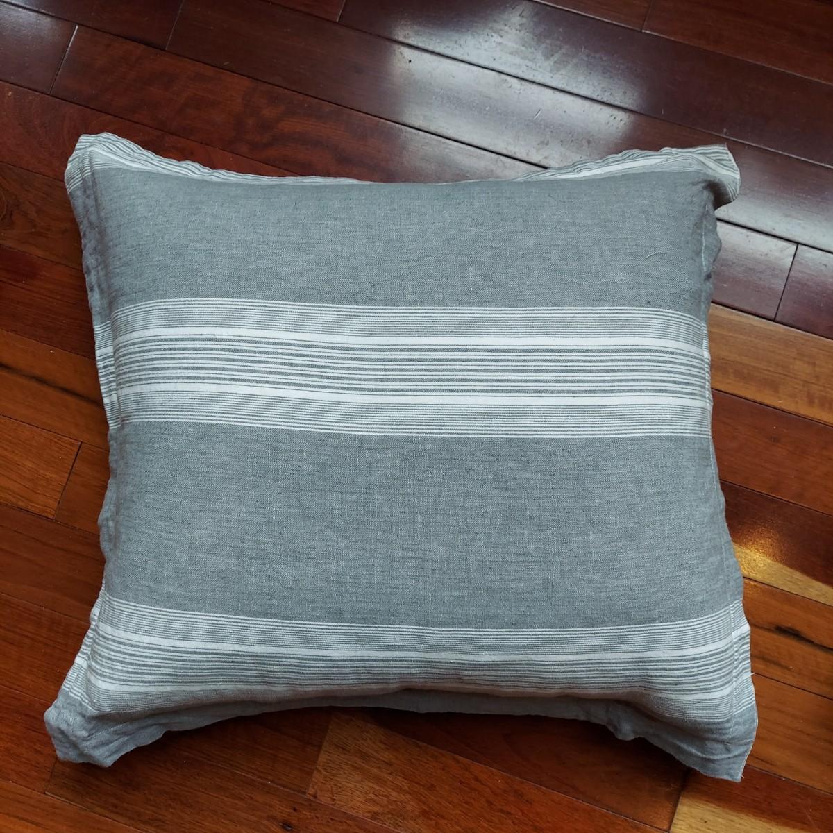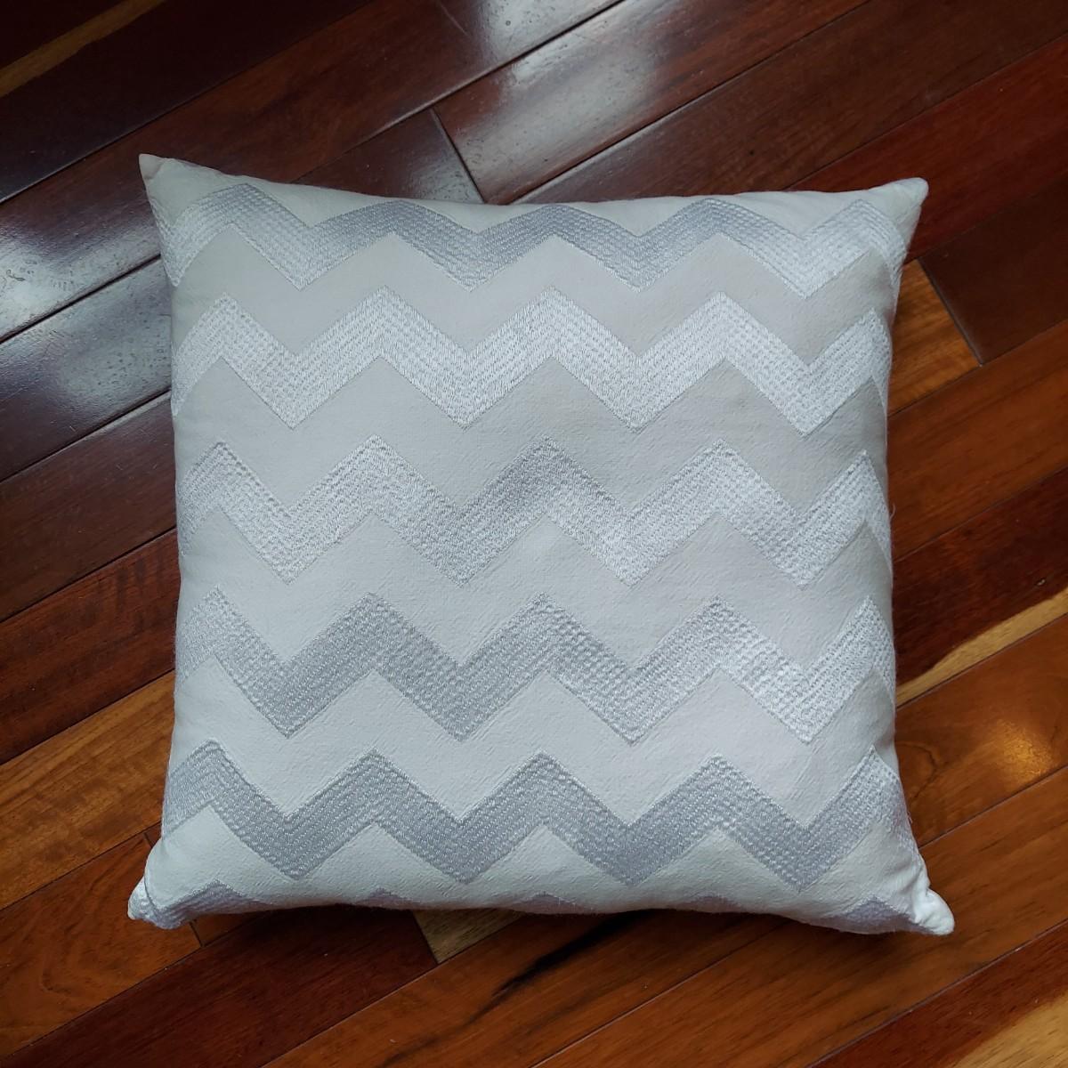 Lot includes four decorative throw pillows in shades of white, tan and grey. The two large grey and white striped pillows measure 22”x 22". The medium white pillow with chevron stripe is 16” x 17". The medium printed pillow is 16”x 16". The two large pillows have slip covers. The two medium pillows have zip cases. These items are from a pet owned house. Shipping available. Shipping certain items can be costly. We suggest contacting our preferred local shipping provider, Postage Express, with dimensions and getting an estimate before bidding: (828) 670-5501 or postageexpress@yahoo.com.