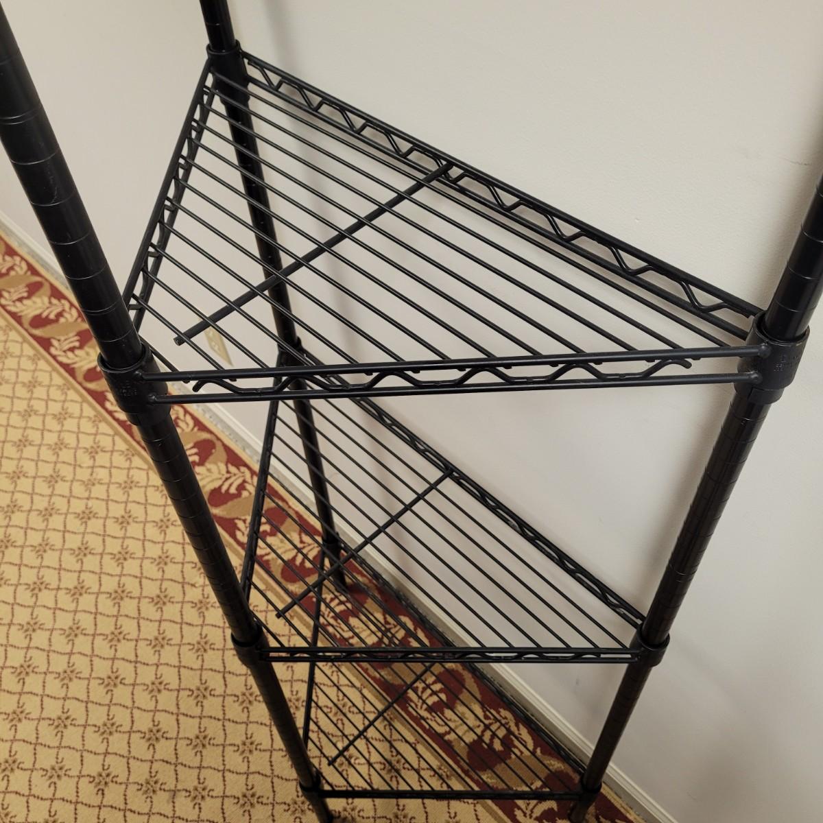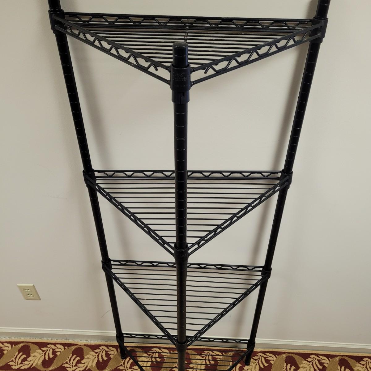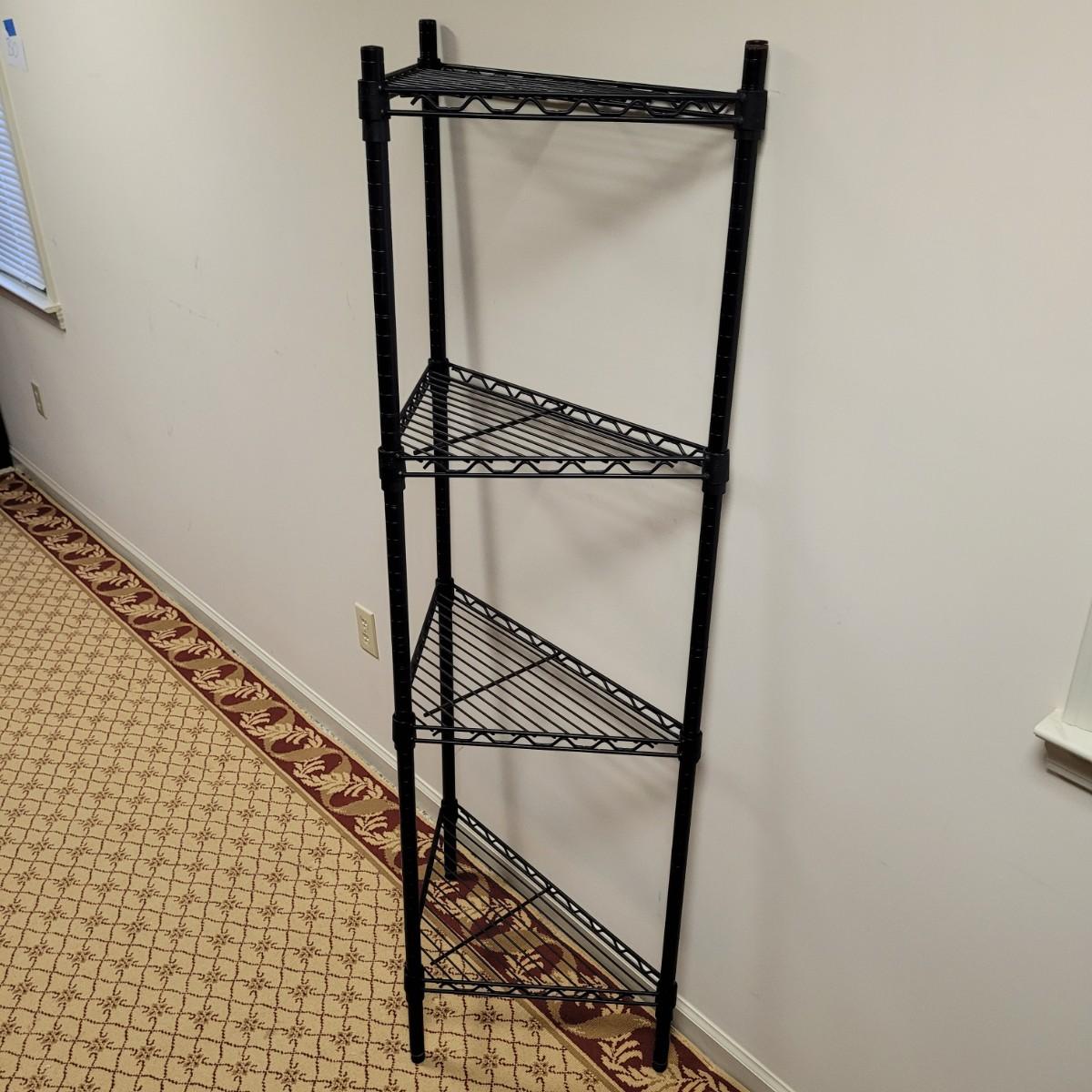 This lot includes a Durastyle brand black metal wire rack designed to fit the corner of a room. It has four tiers of shelves that are adjustable. No extra hardware is included.