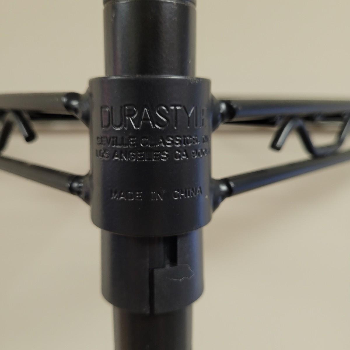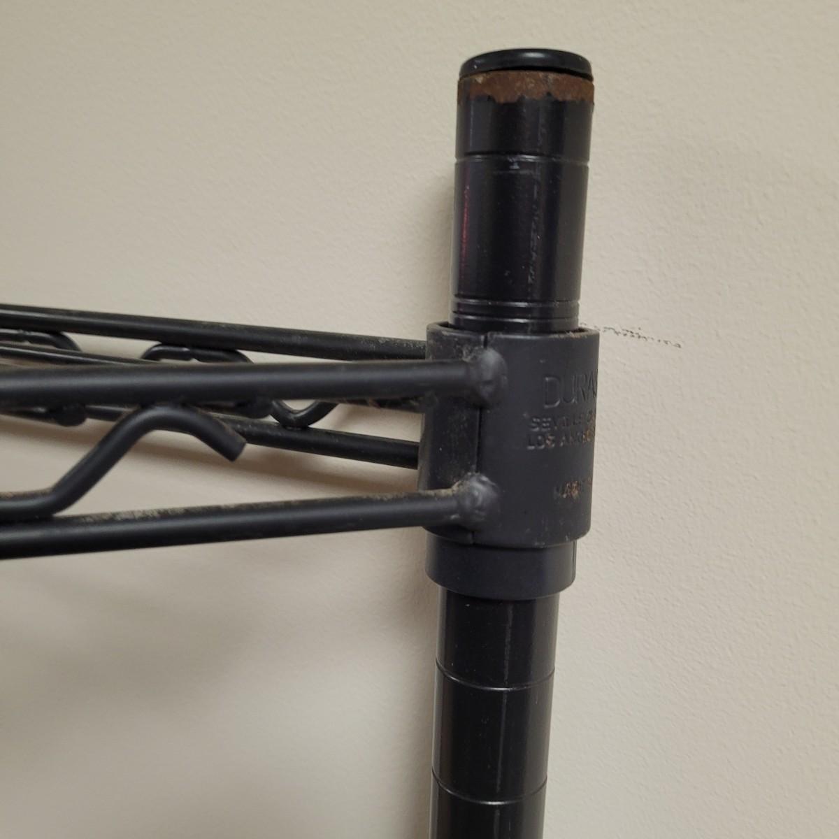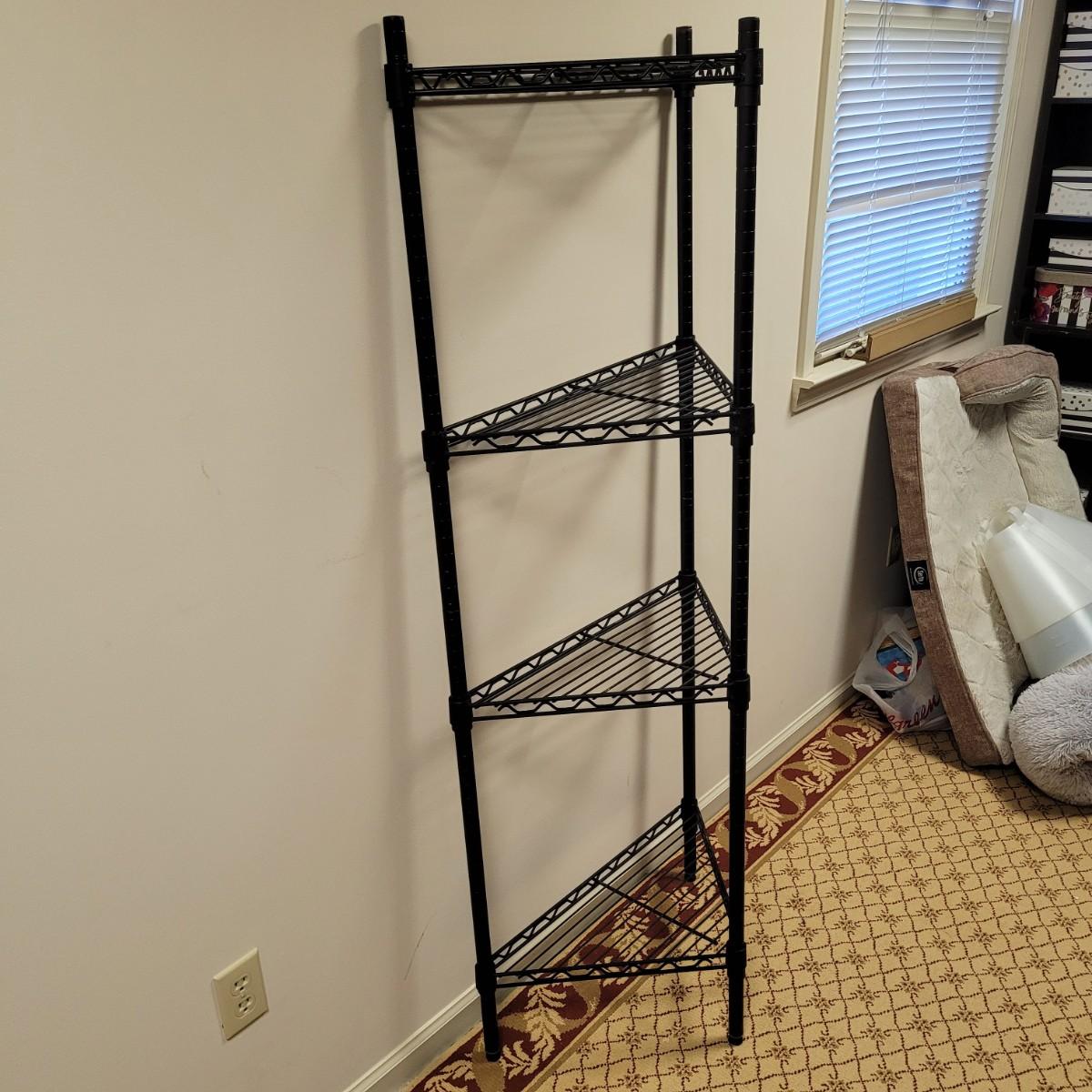 This lot includes a Durastyle brand black metal wire rack designed to fit the corner of a room. It has four tiers of shelves that are adjustable. No extra hardware is included.