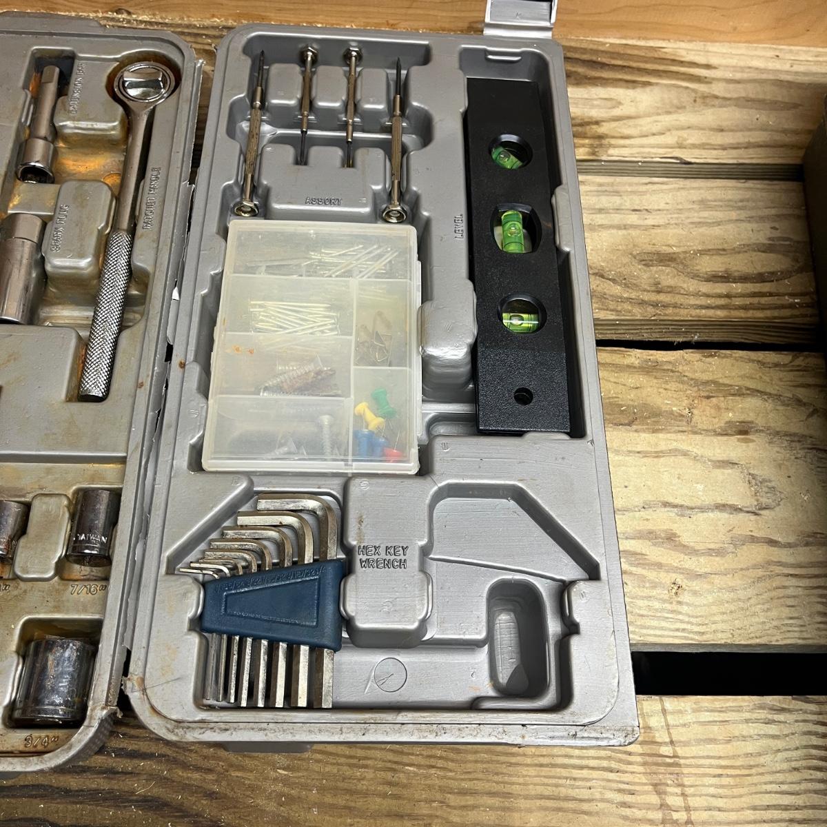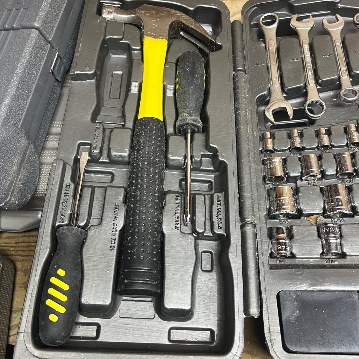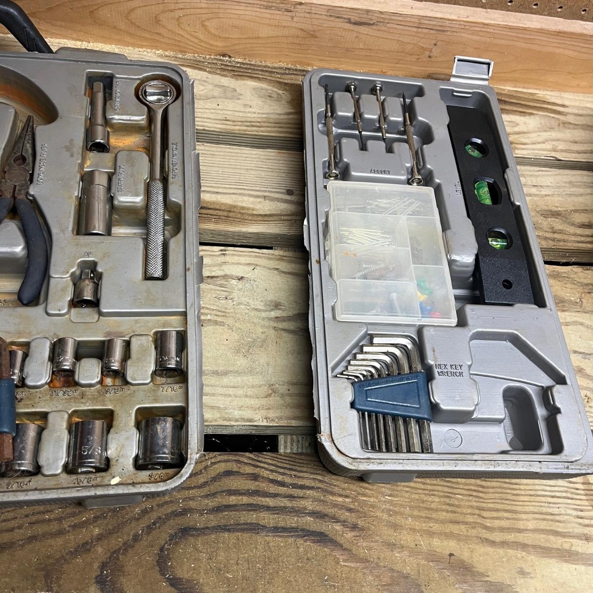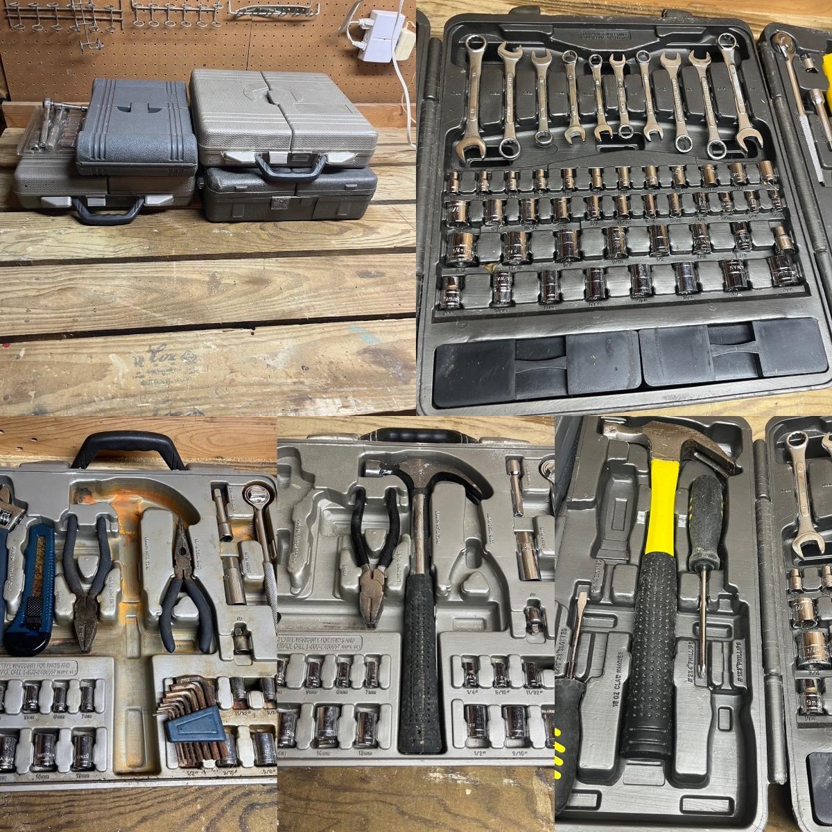 Lot includes a Sharper Image toolkit in plastic carrying case and three more toolkits in plastic carrying cases. Toolkits have a variety of hand tools. Sharper Image measures 14” x 4” x 16”H. Kits are missing some tools and one case has come apart, see pictures.