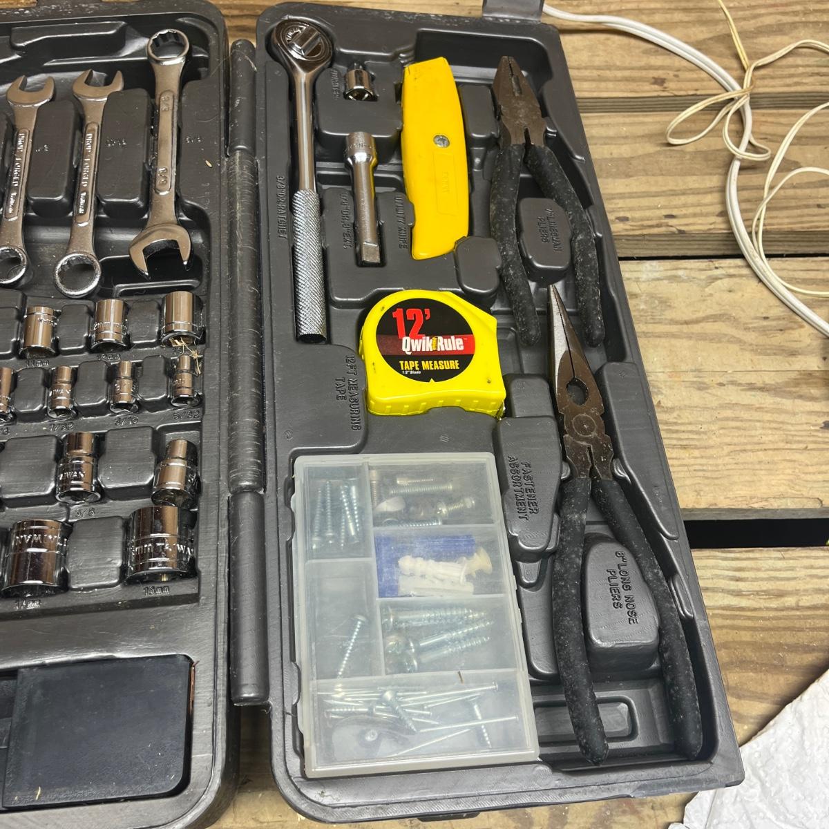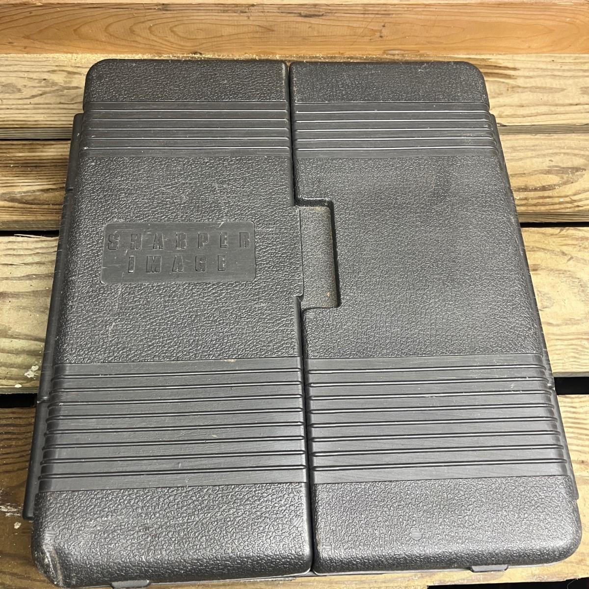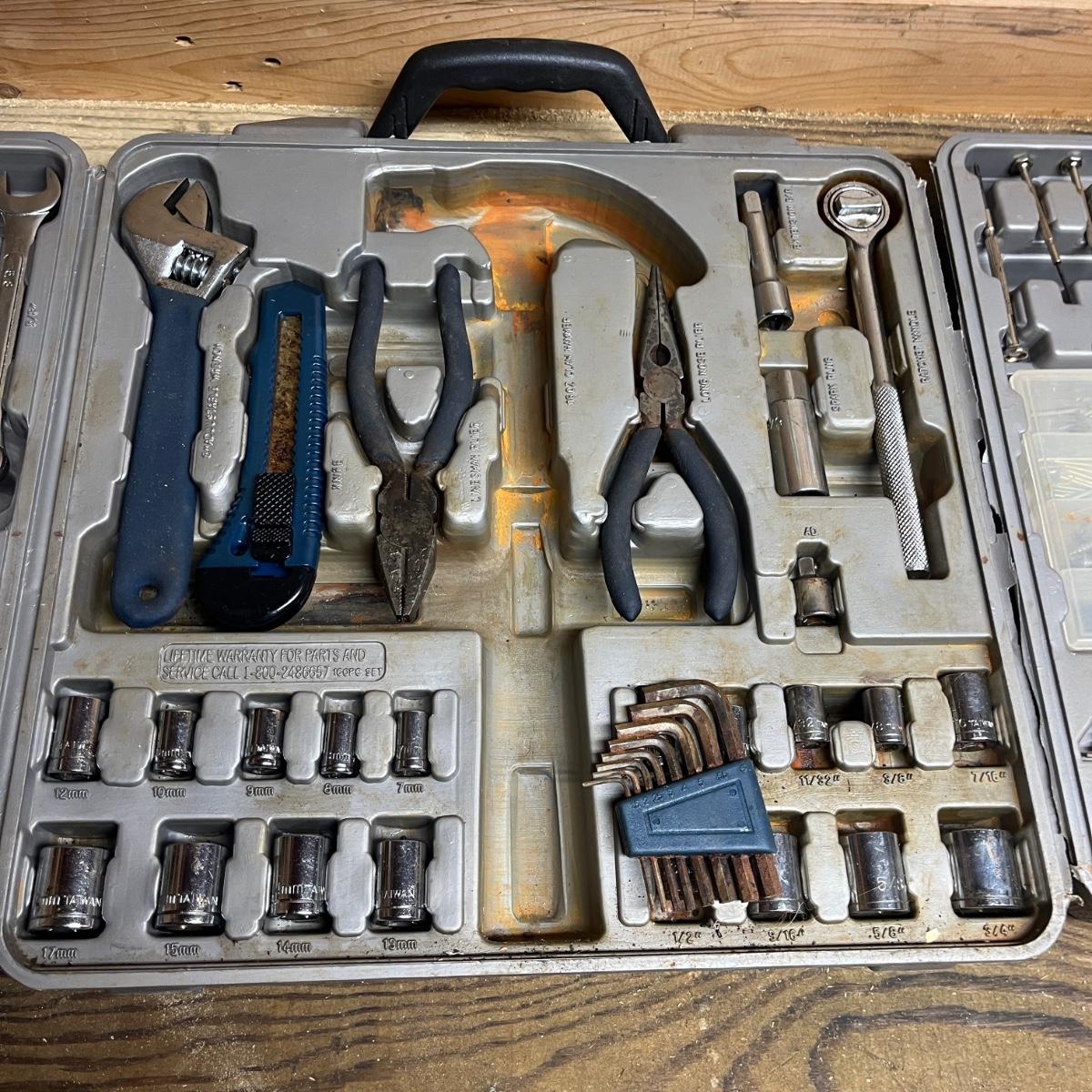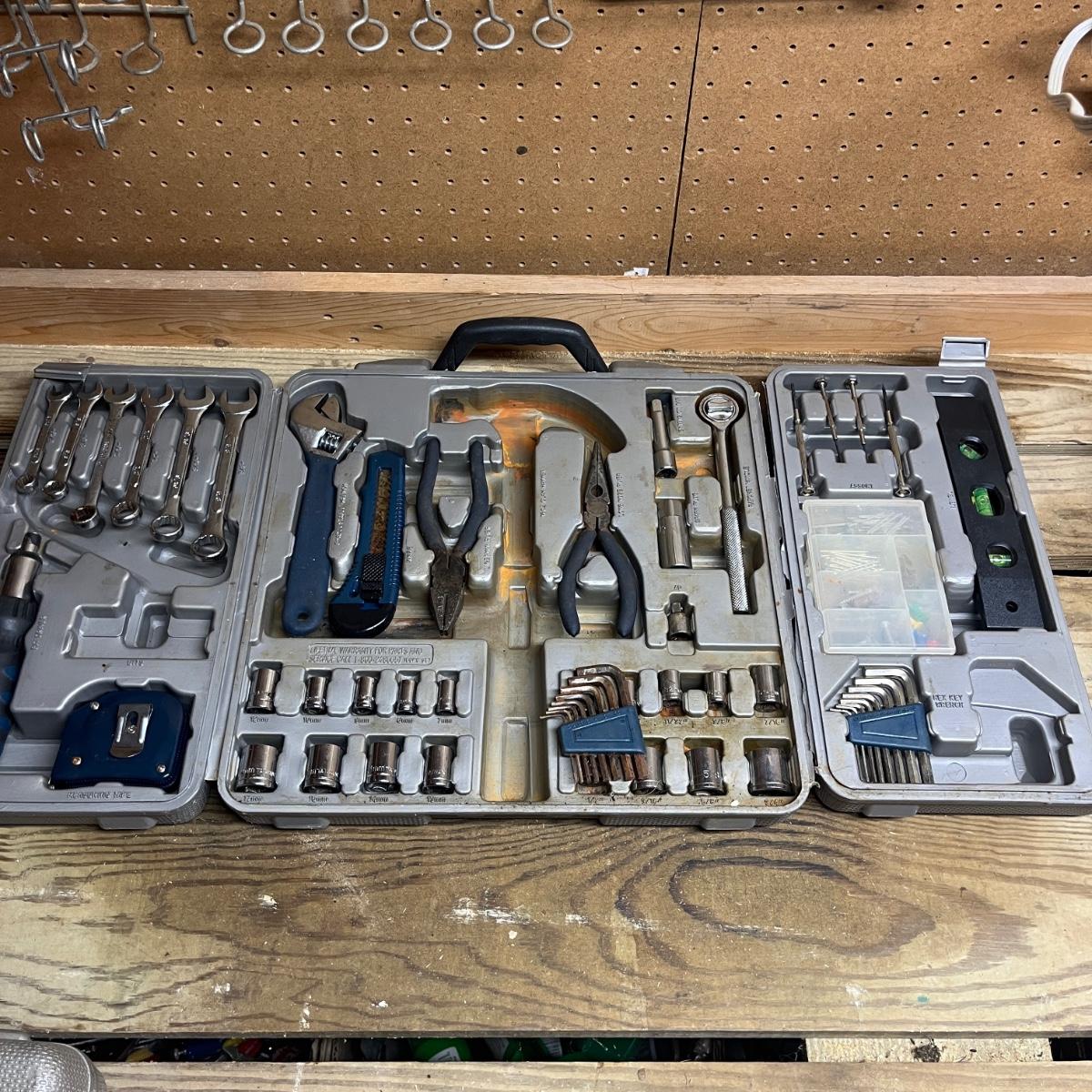 Lot includes a Sharper Image toolkit in plastic carrying case and three more toolkits in plastic carrying cases. Toolkits have a variety of hand tools. Sharper Image measures 14” x 4” x 16”H. Kits are missing some tools and one case has come apart, see pictures.