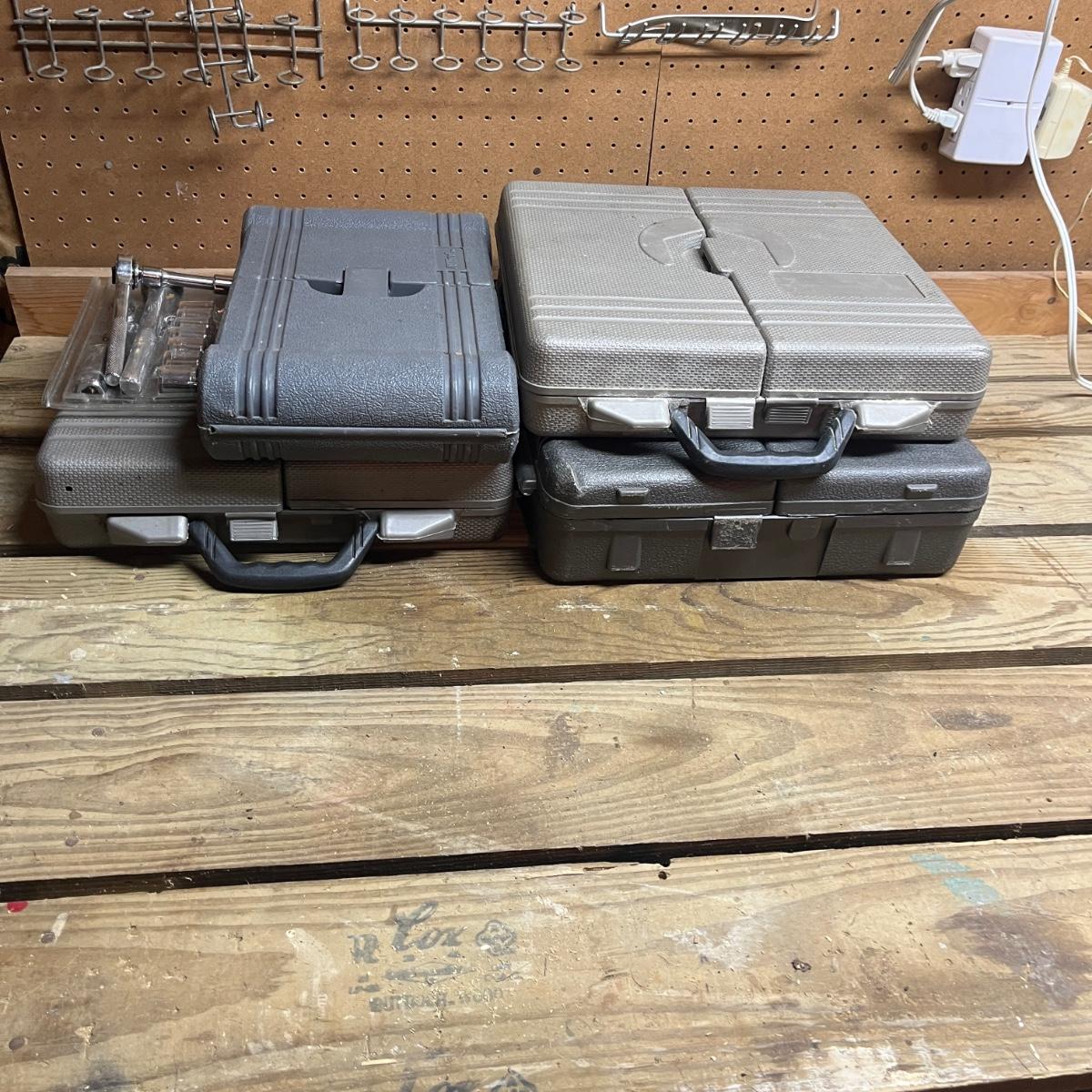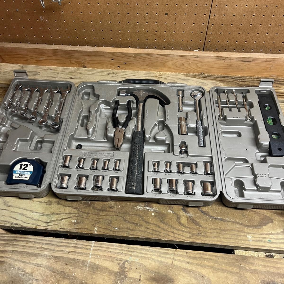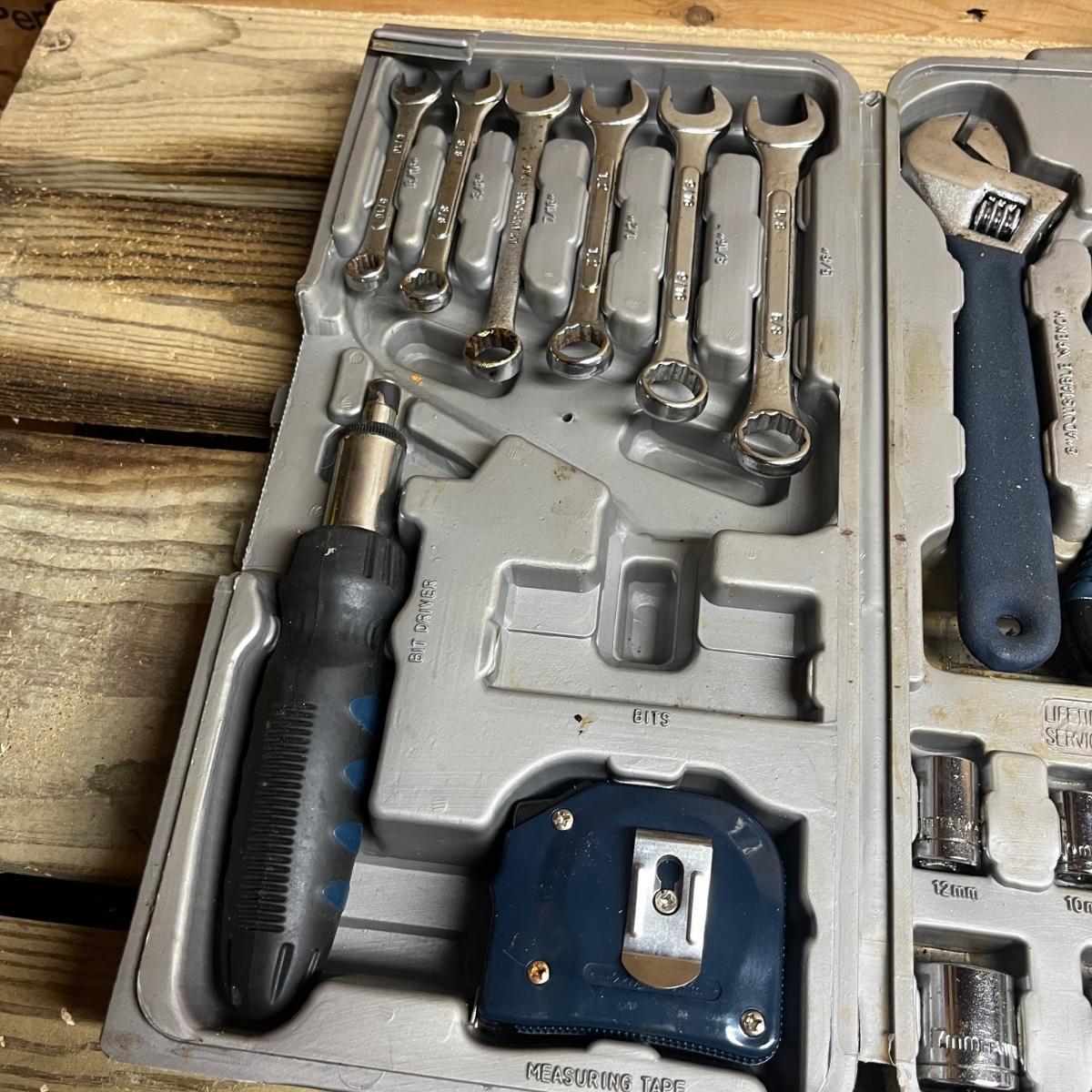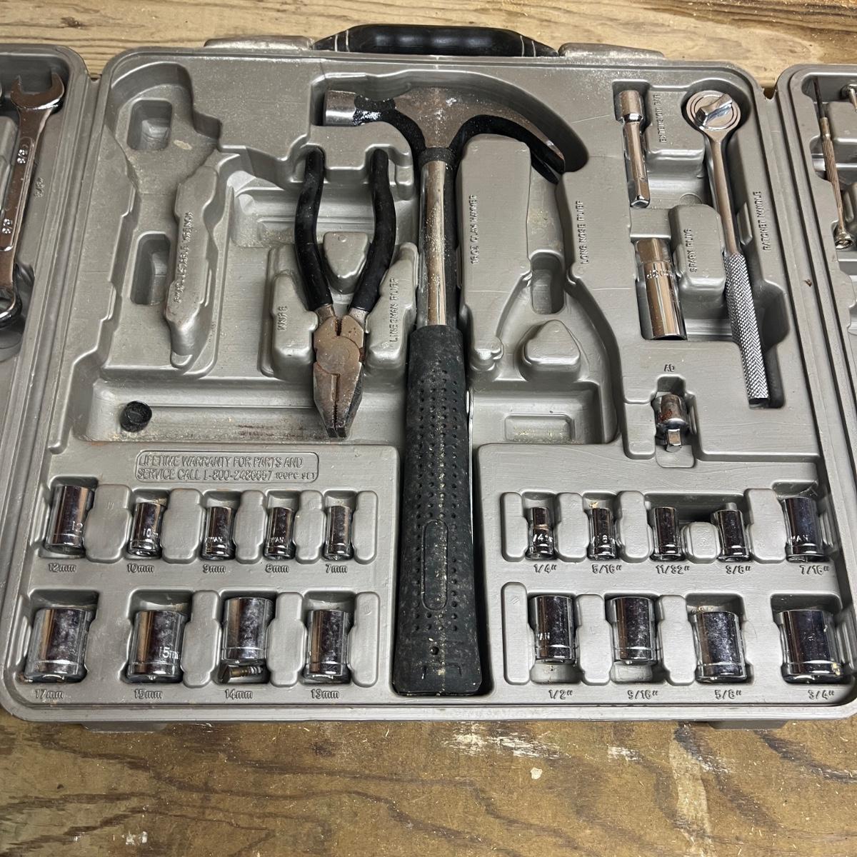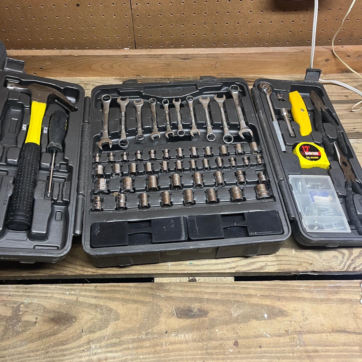 Lot includes a Sharper Image toolkit in plastic carrying case and three more toolkits in plastic carrying cases. Toolkits have a variety of hand tools. Sharper Image measures 14” x 4” x 16”H. Kits are missing some tools and one case has come apart, see pictures.