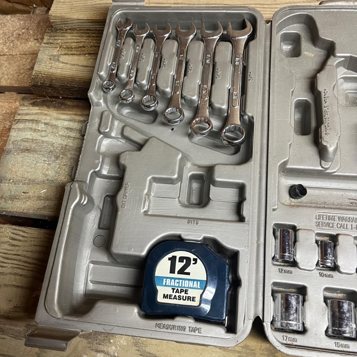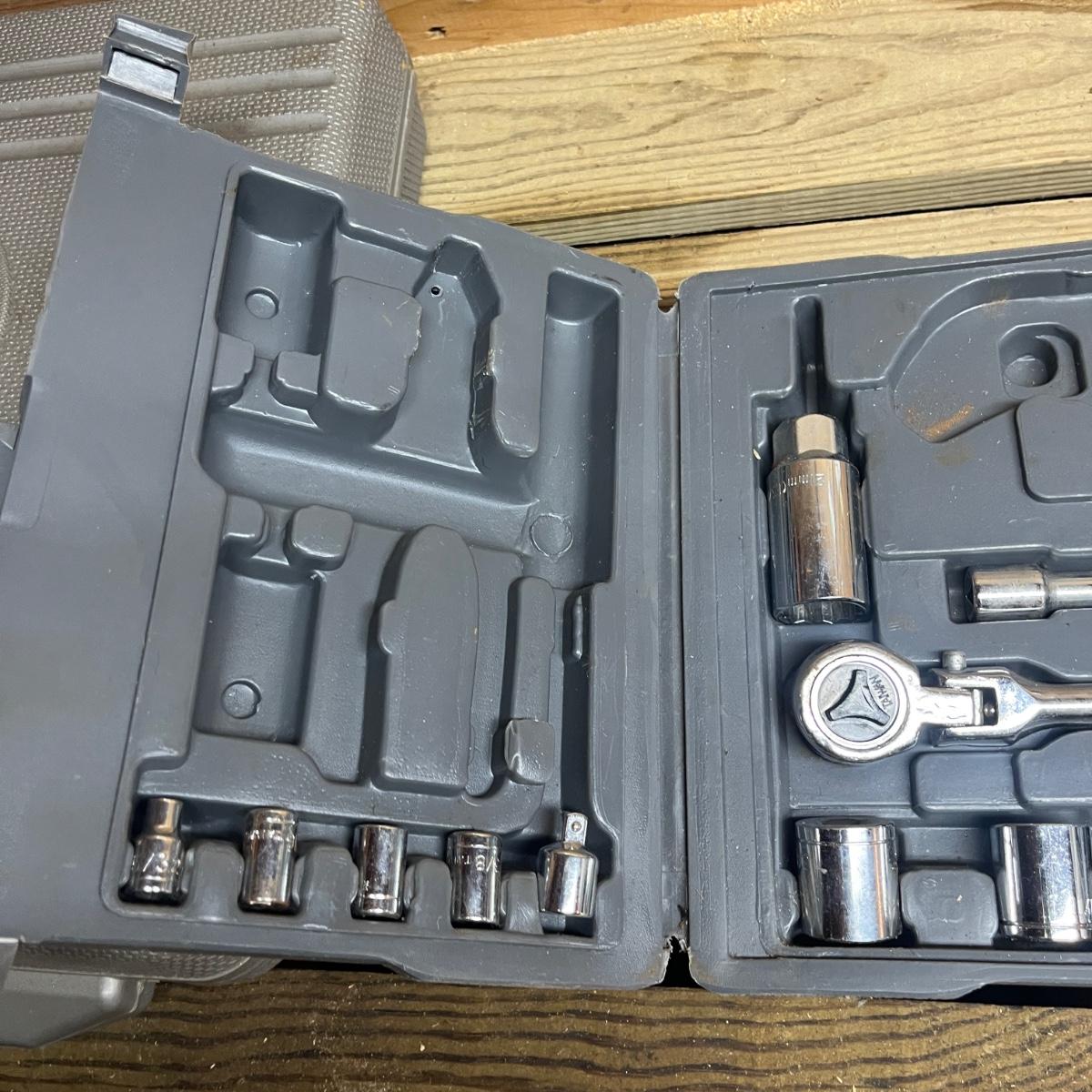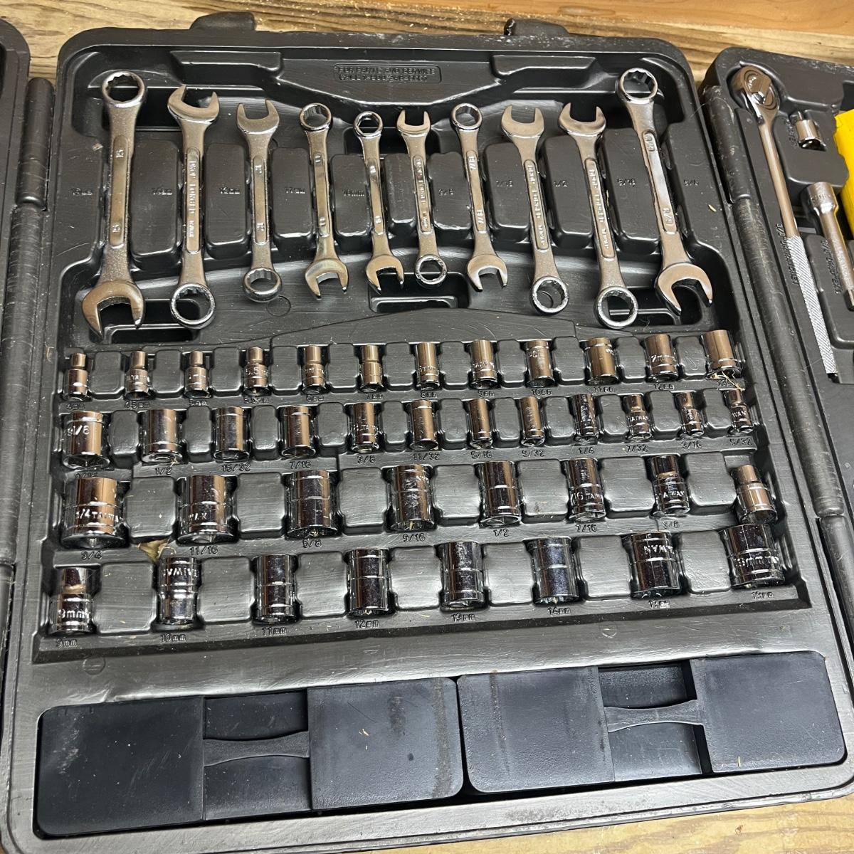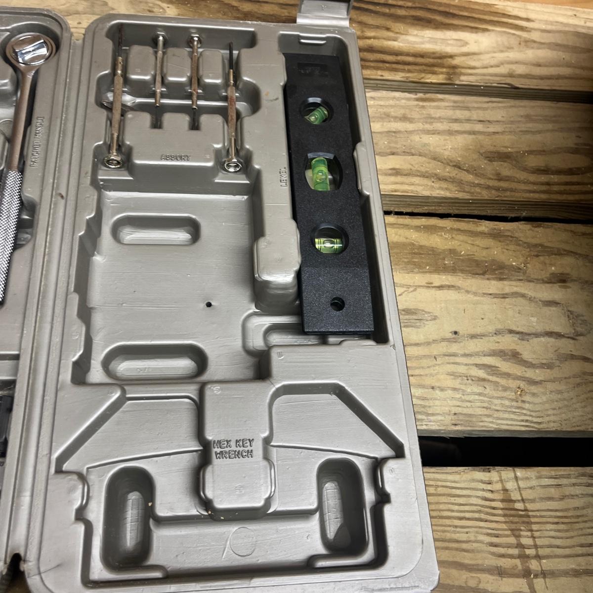 Lot includes a Sharper Image toolkit in plastic carrying case and three more toolkits in plastic carrying cases. Toolkits have a variety of hand tools. Sharper Image measures 14” x 4” x 16”H. Kits are missing some tools and one case has come apart, see pictures.