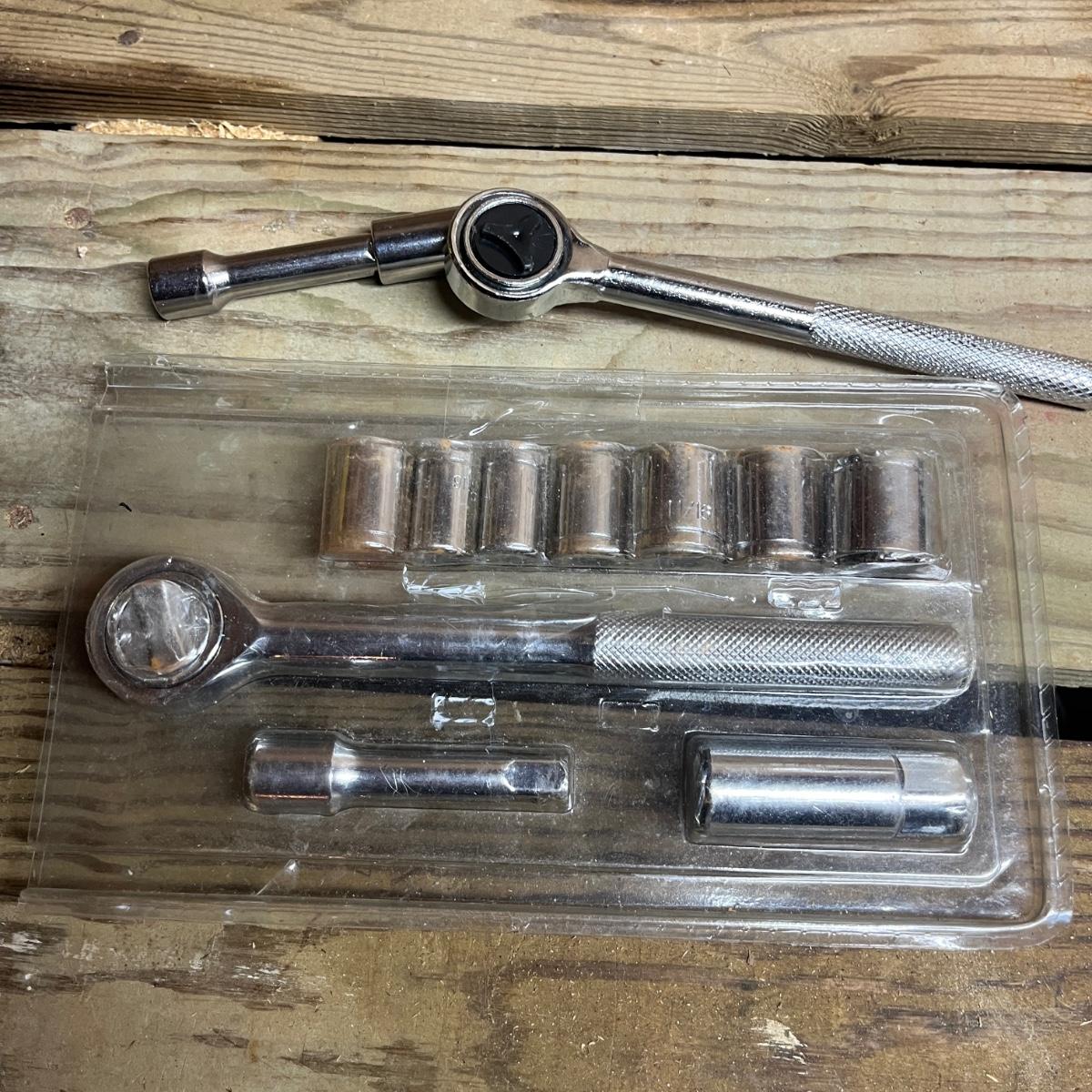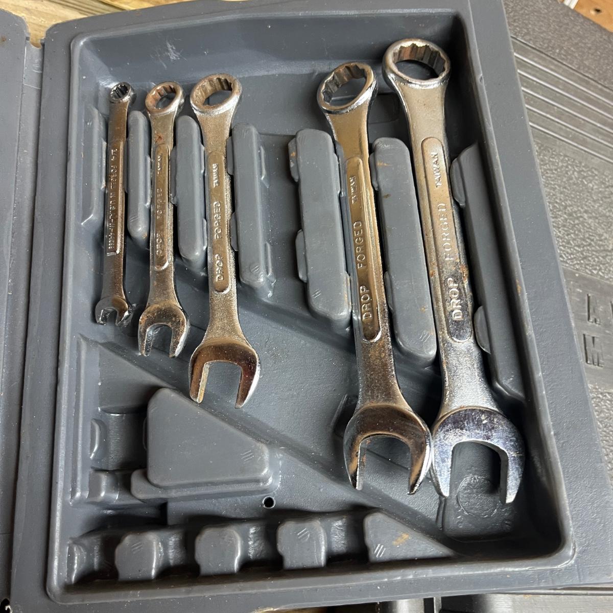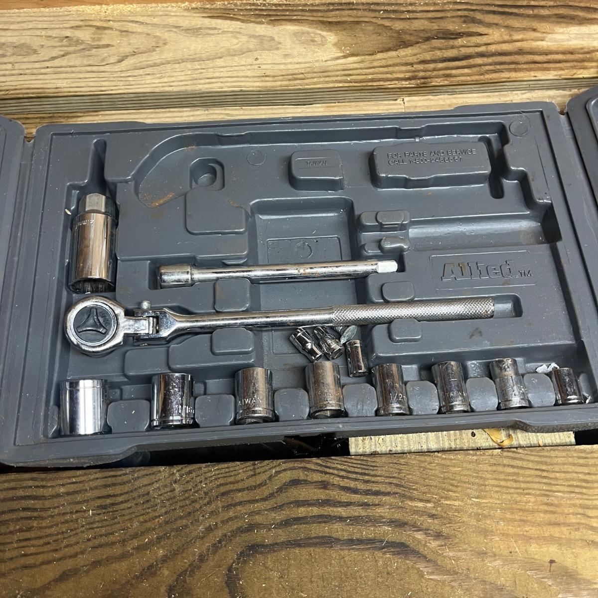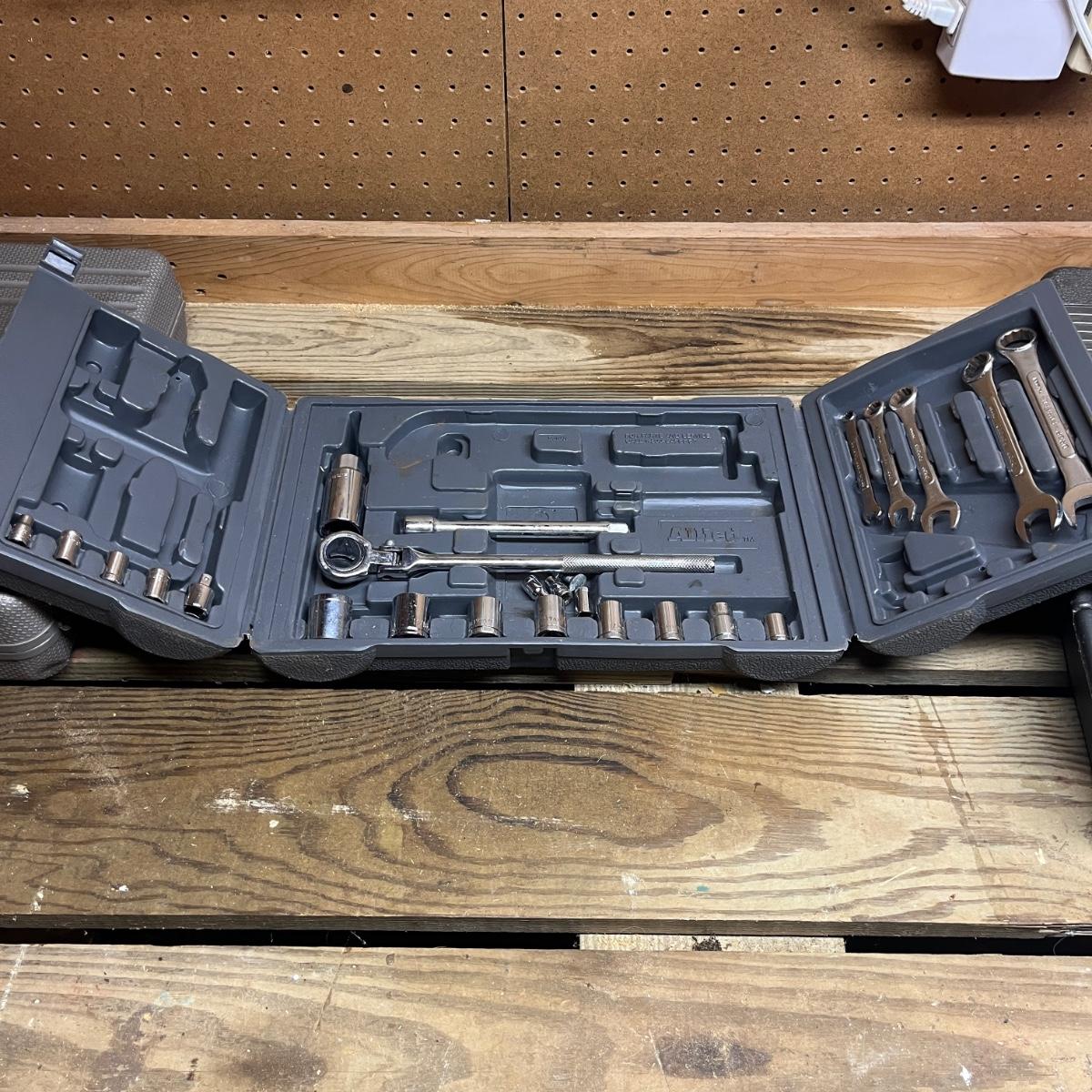 Lot includes a Sharper Image toolkit in plastic carrying case and three more toolkits in plastic carrying cases. Toolkits have a variety of hand tools. Sharper Image measures 14” x 4” x 16”H. Kits are missing some tools and one case has come apart, see pictures.