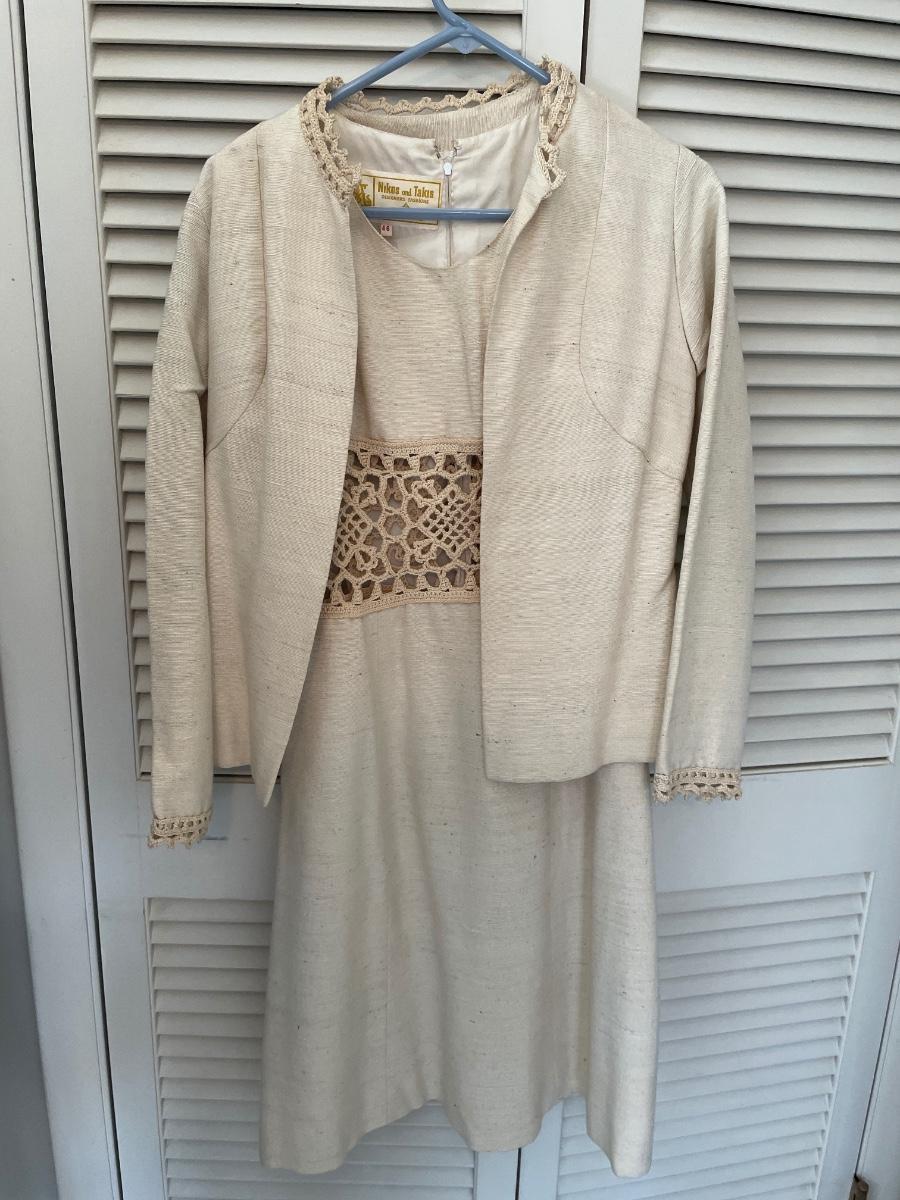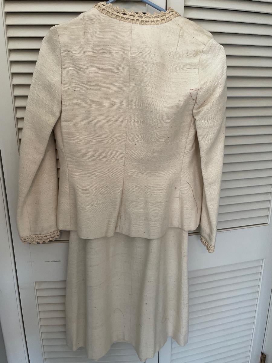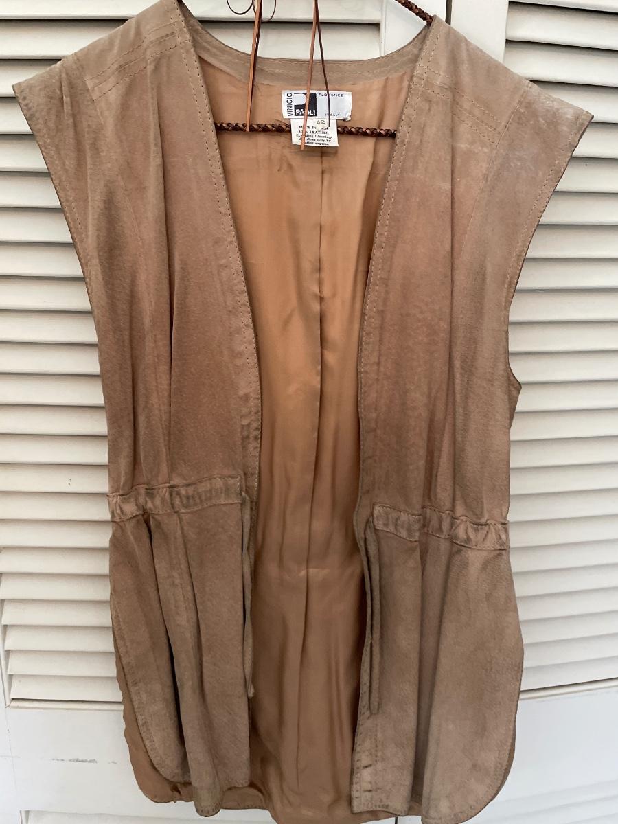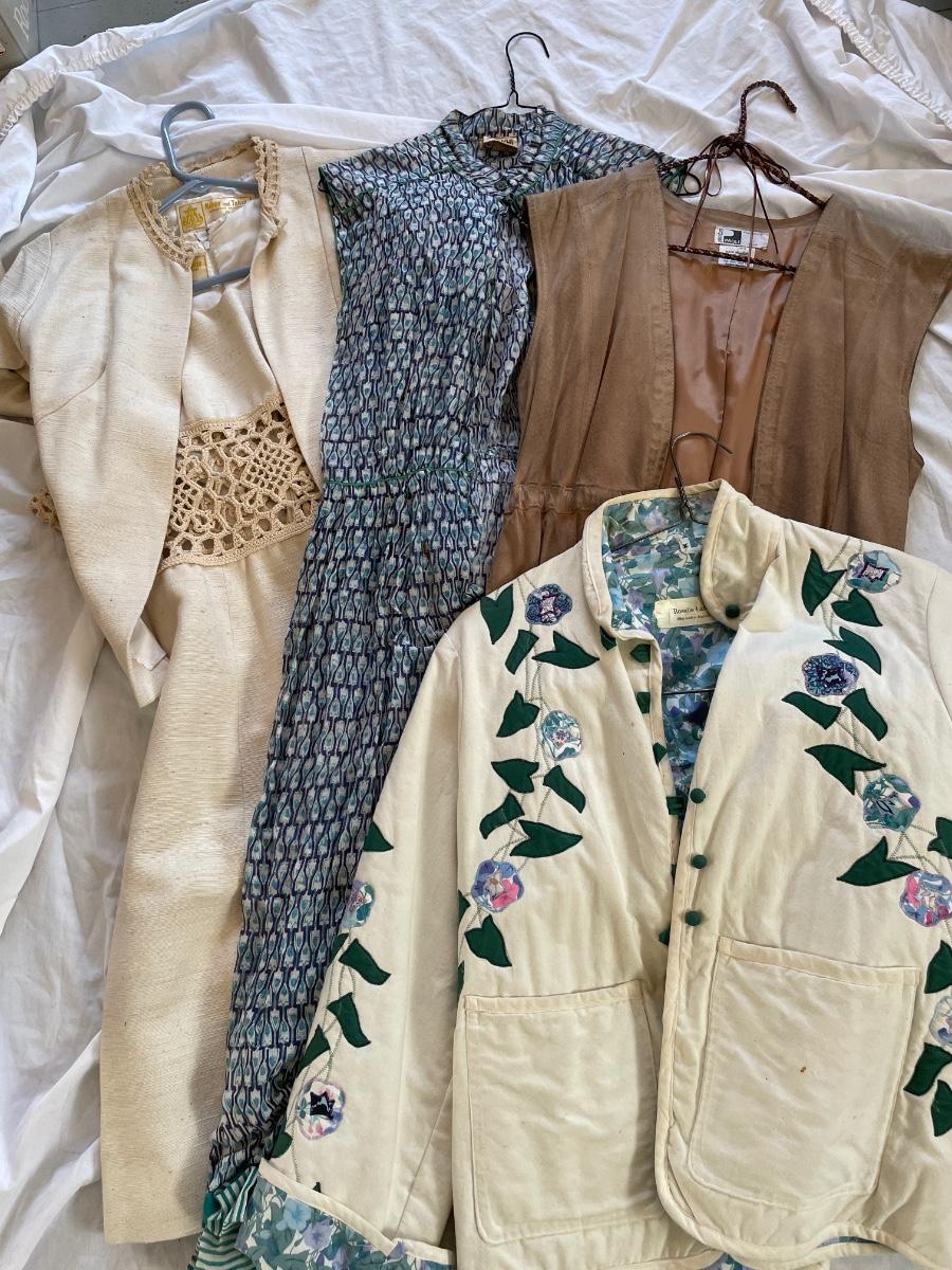 Two piece dress suit, quilted jacket, leather vest, dress. Please see photos for maker and sizes.