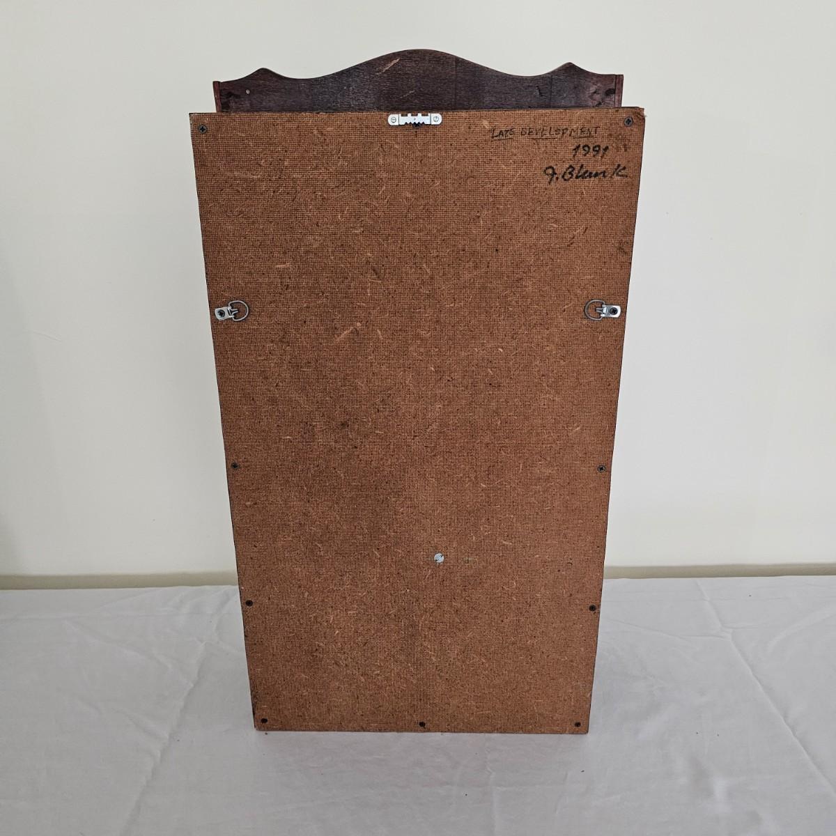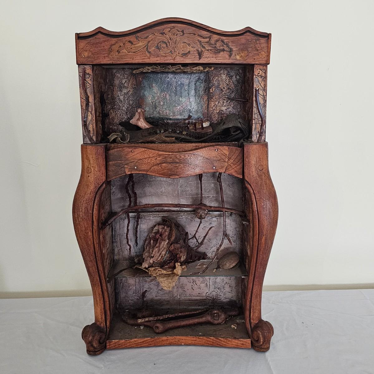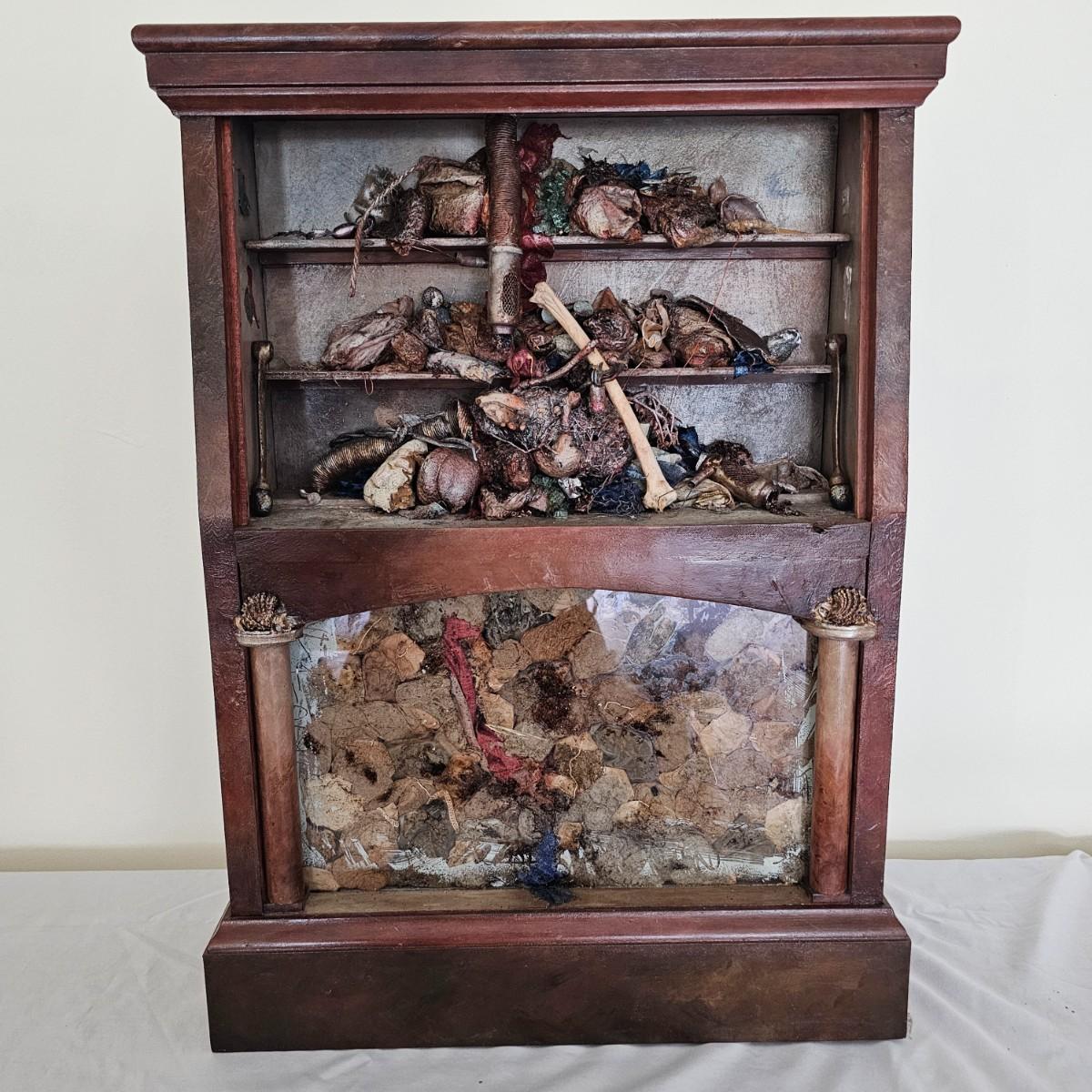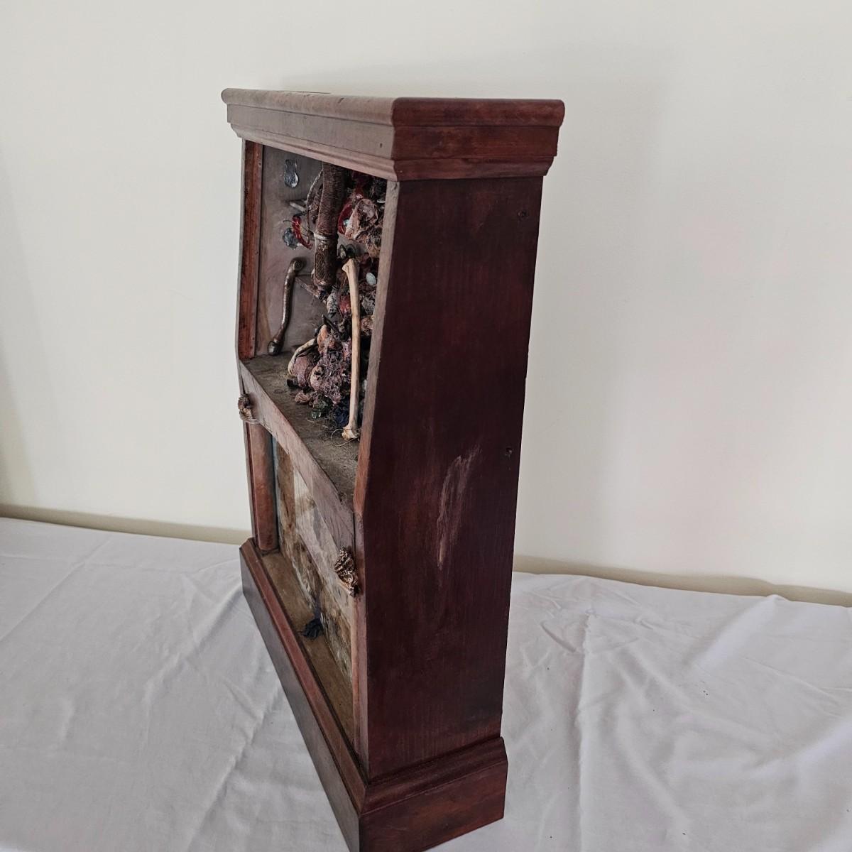 Eclectic looking cabinets, boxes and more. Shadow boxes by Joyce Blunk contain a wide assortment of unusual items and re-purposed 'stuff' to create mind boggling art images. Tools, seeds, marine life and more can be found in here. With such names as 'Mud Cat', 'Shoe Trophy' and 'Late Development ' there is mirth and wonder for all. Smallest box measures 12" x 5" x 20"H, largest is 11.5" x 16" x 28"H. Three of the four pieces are named and signed by the artist. See photos for details. Shipping Available.